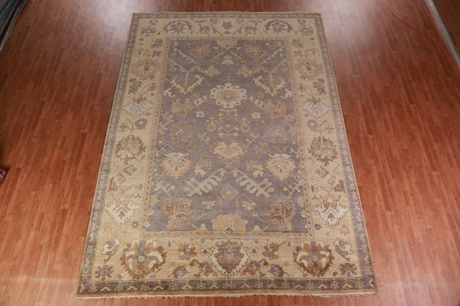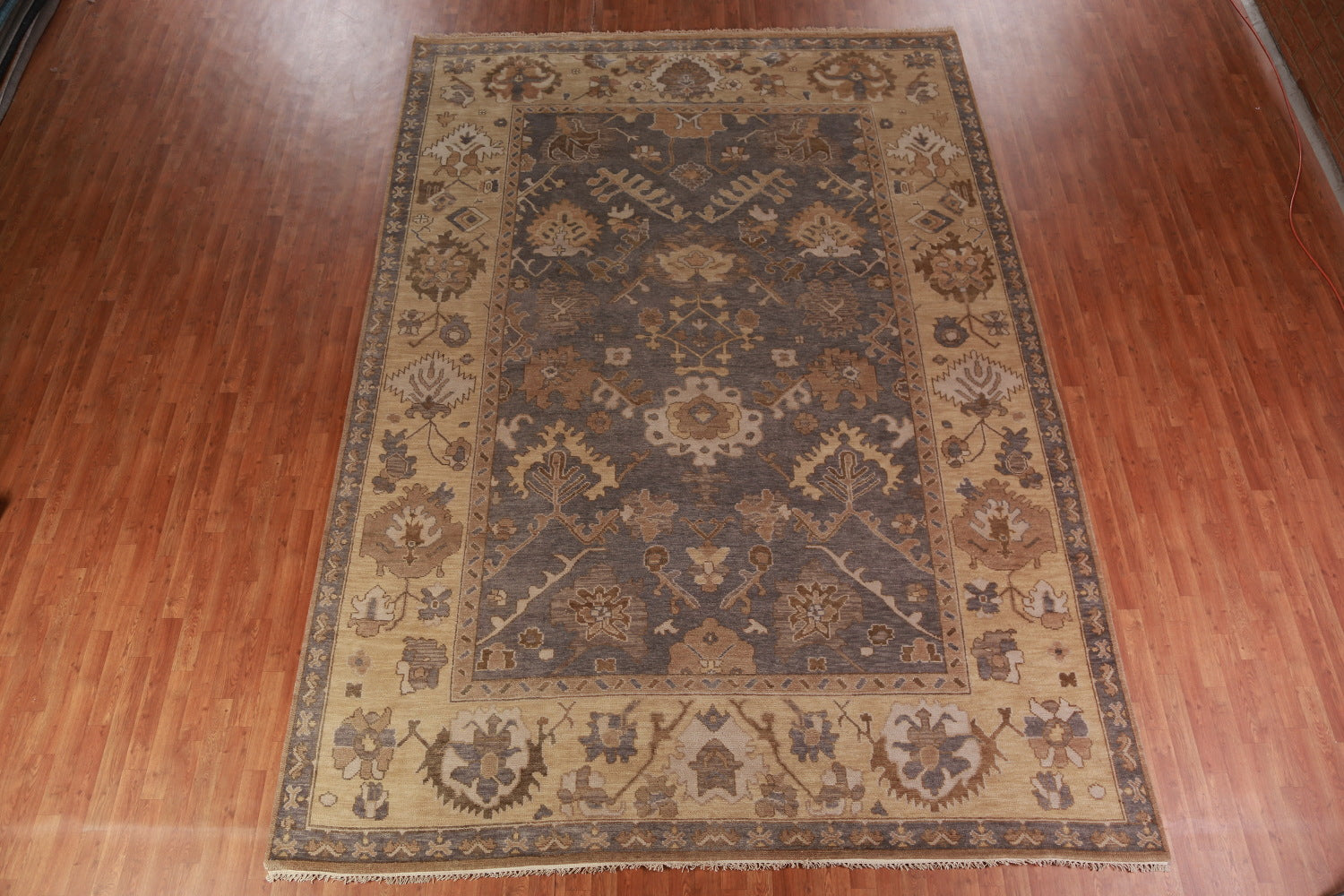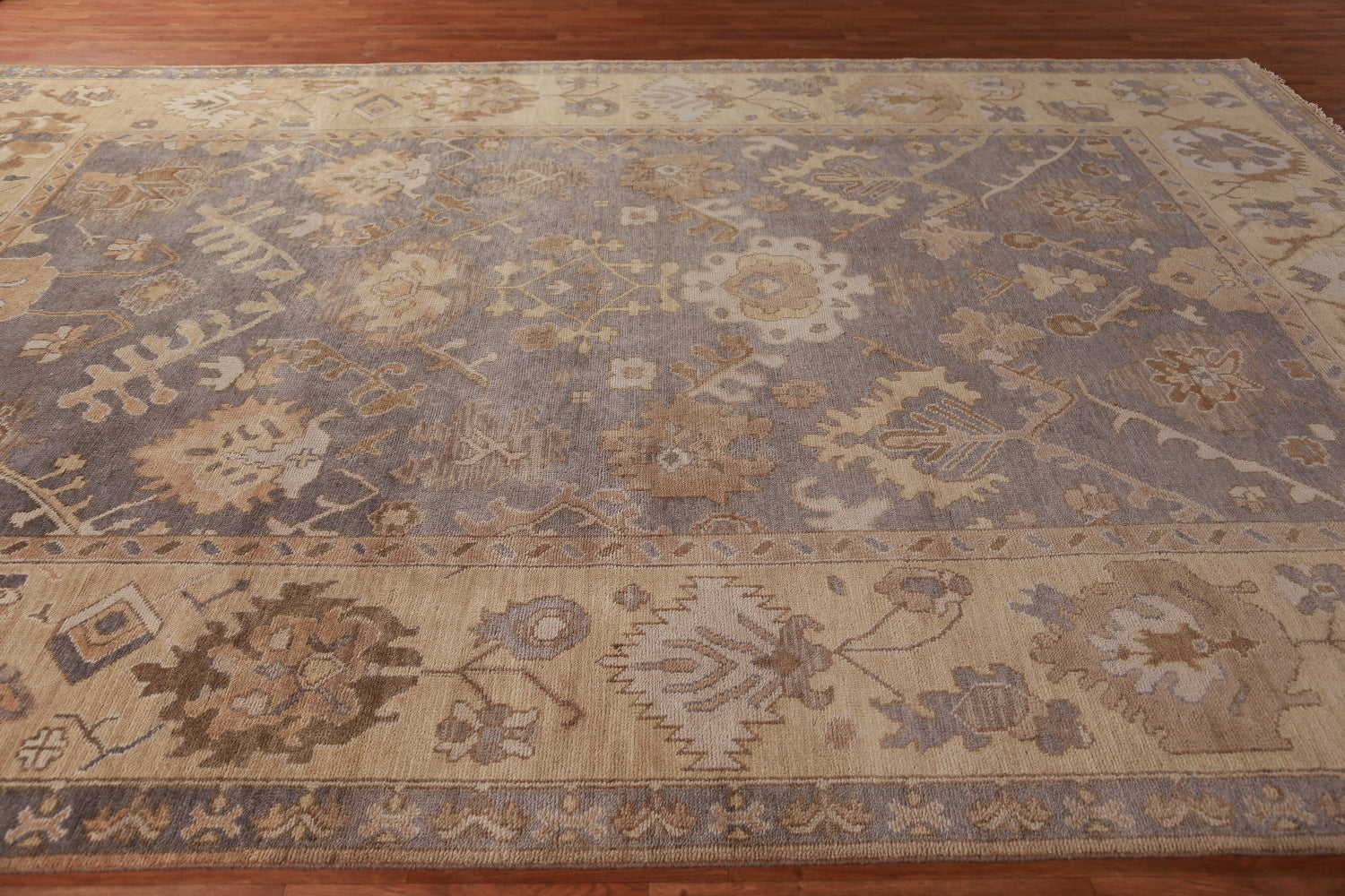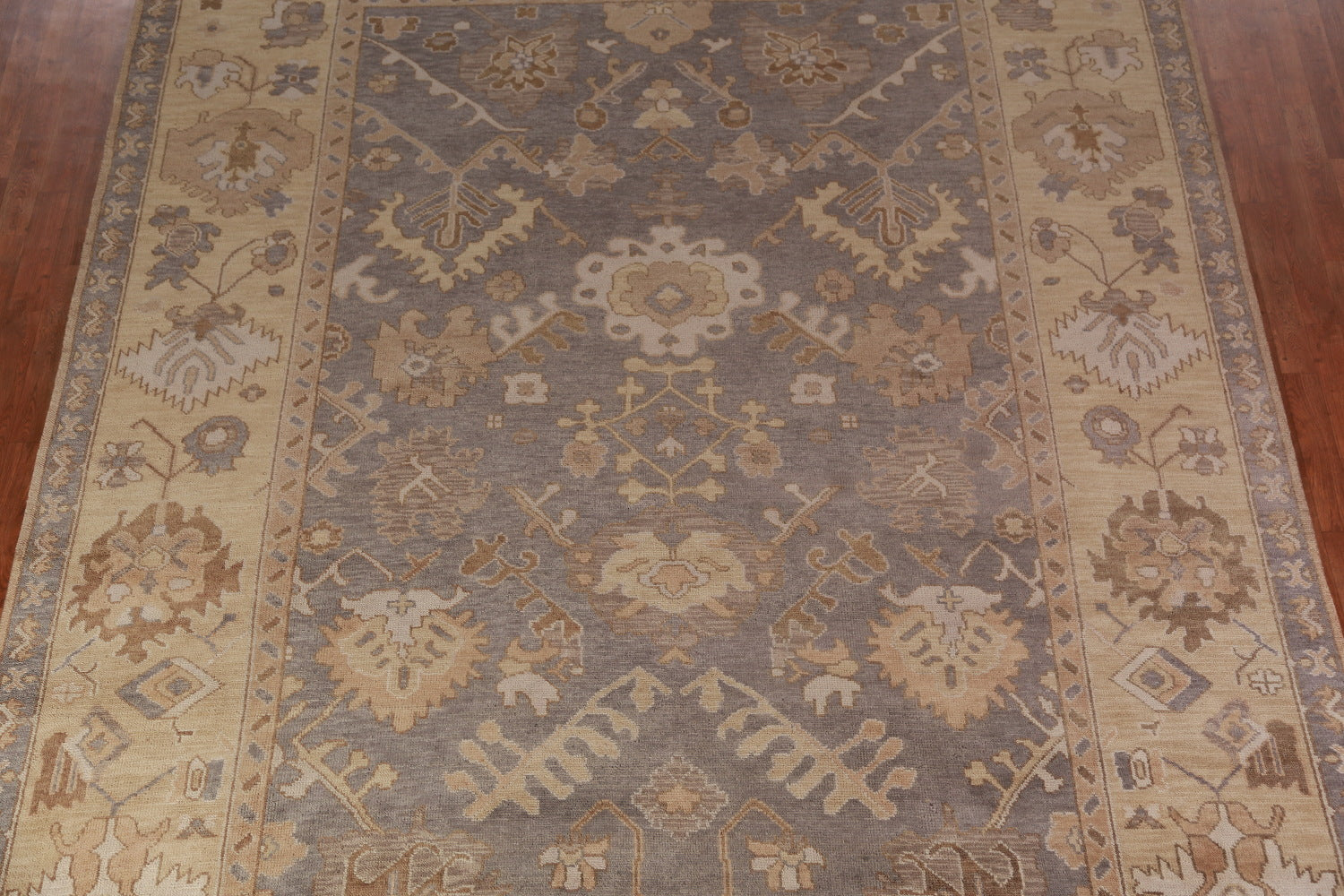 A Beautiful Genuine India Oushak rug is Hand Knotted by skillful weavers in India with 100% Wool Material. This rug is in New, First Quality condition. dimensions are 13' 7'' X 9' 8'' in foot and 414 X 295 in centimeter. the primary color is Greys & Charcoal.