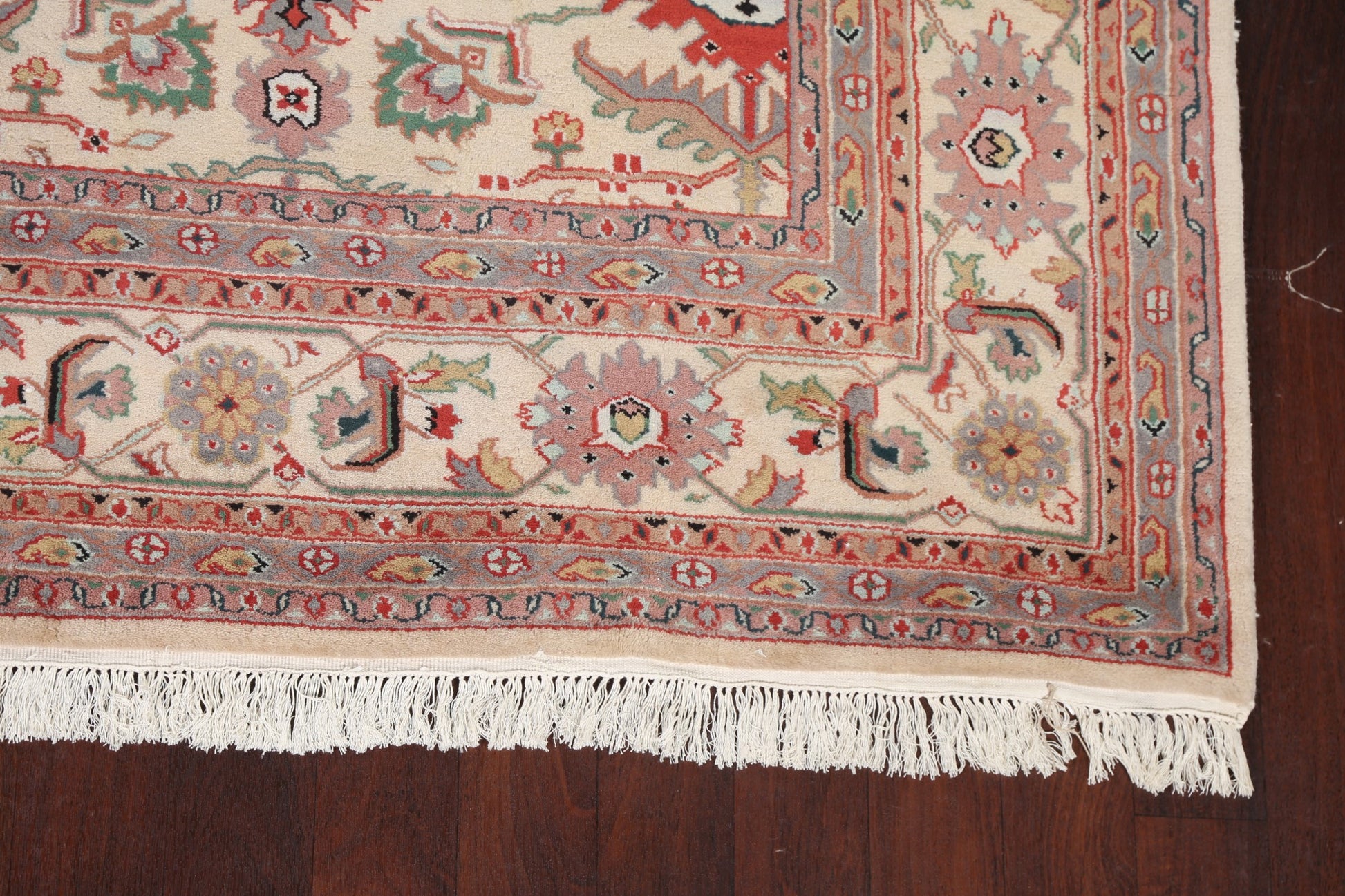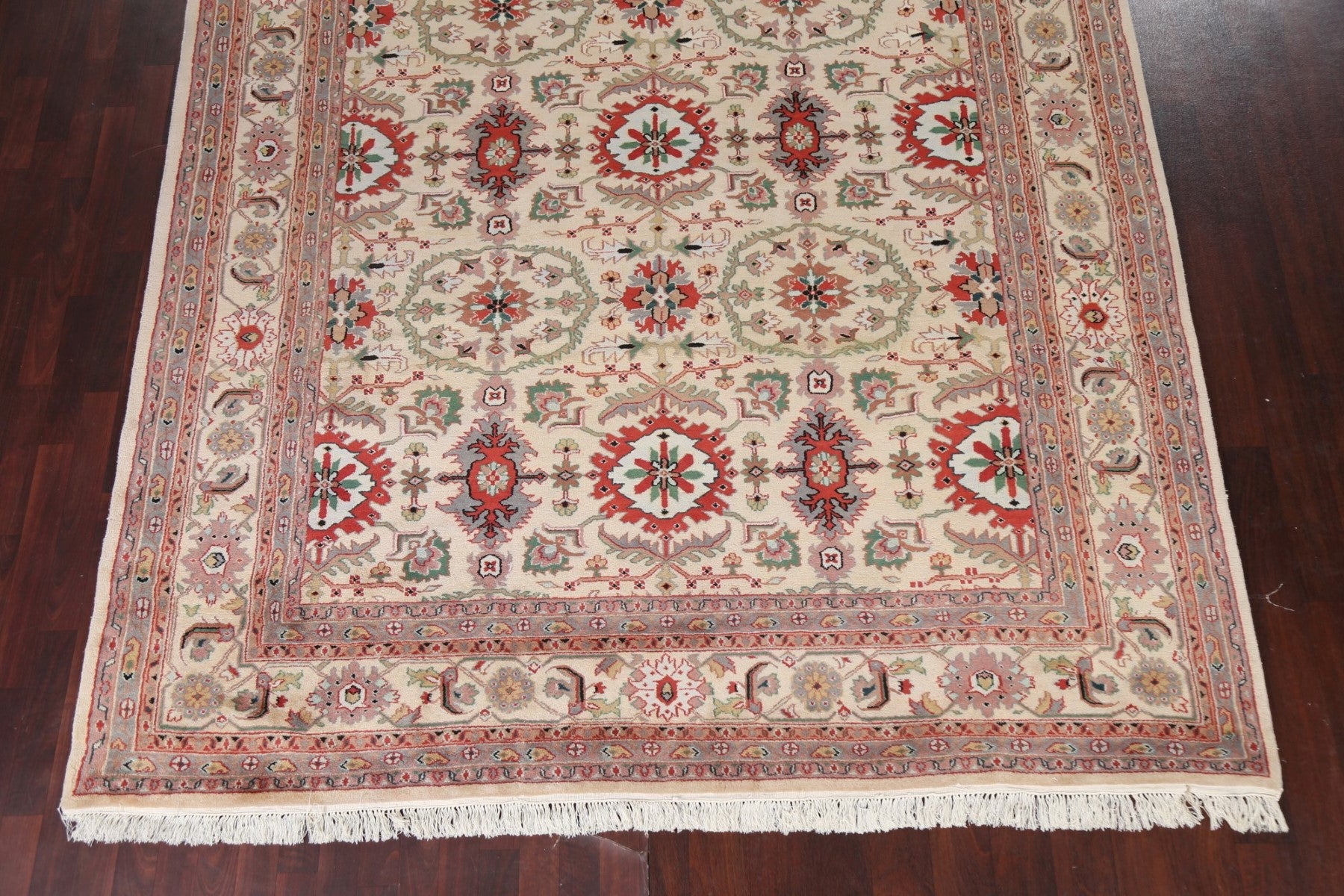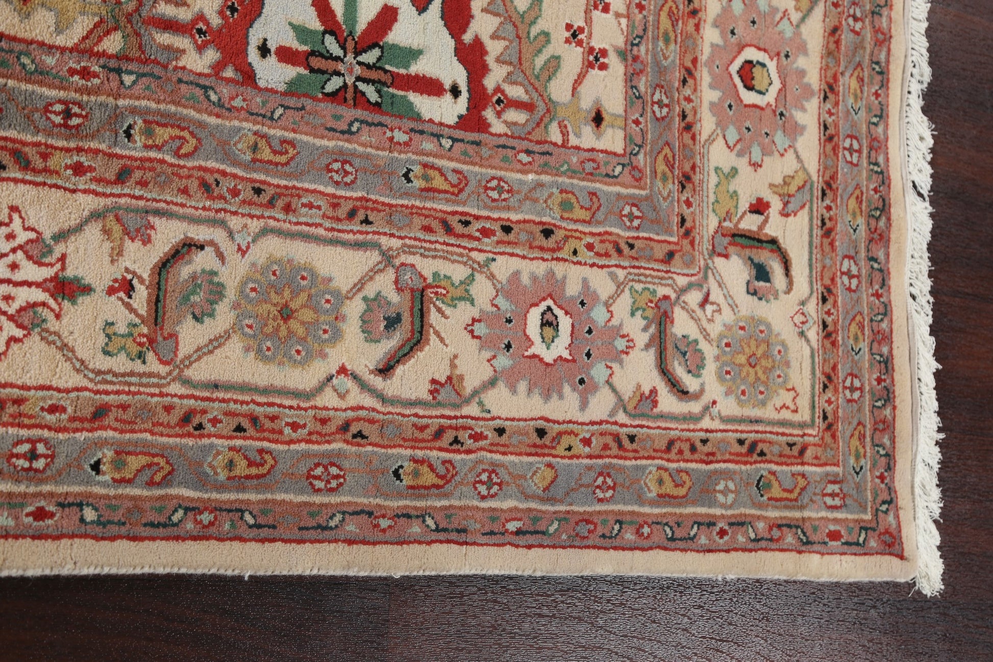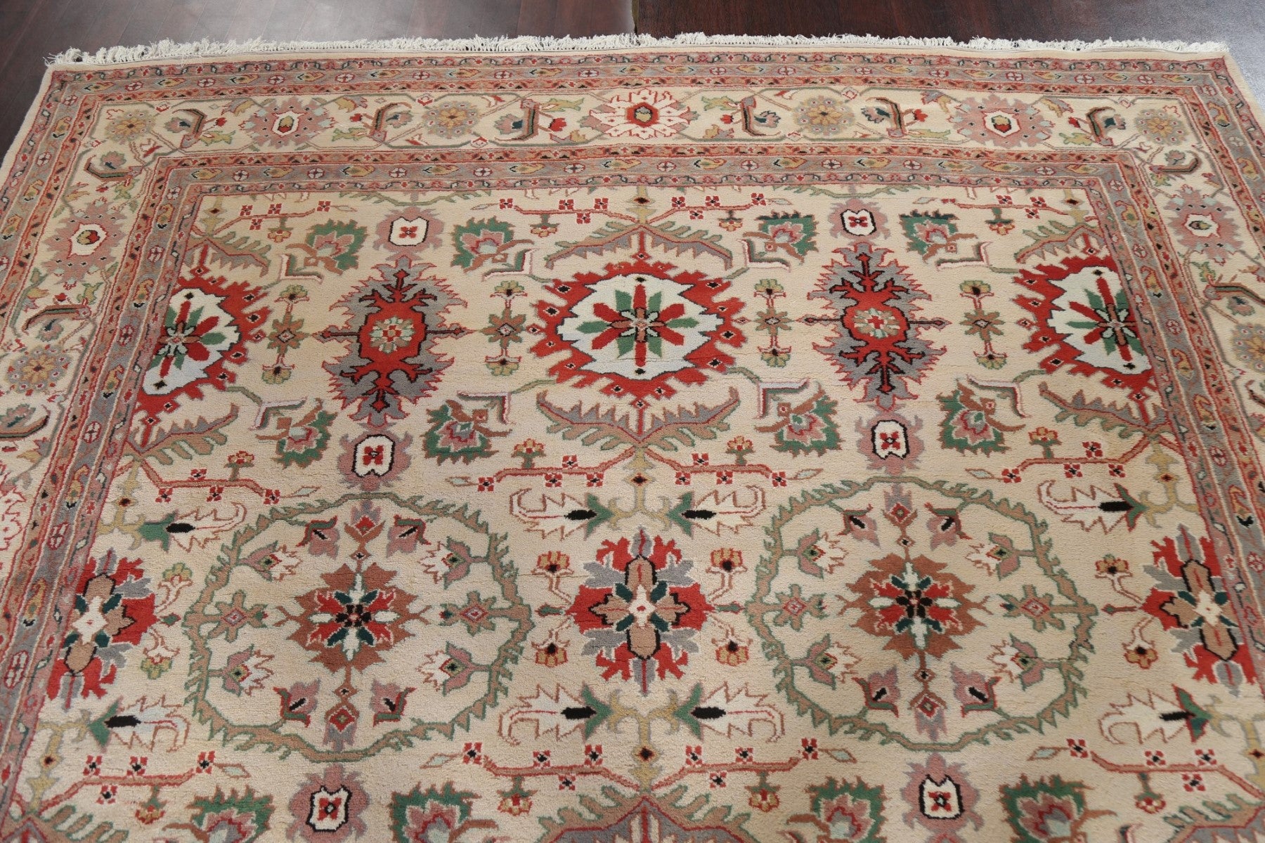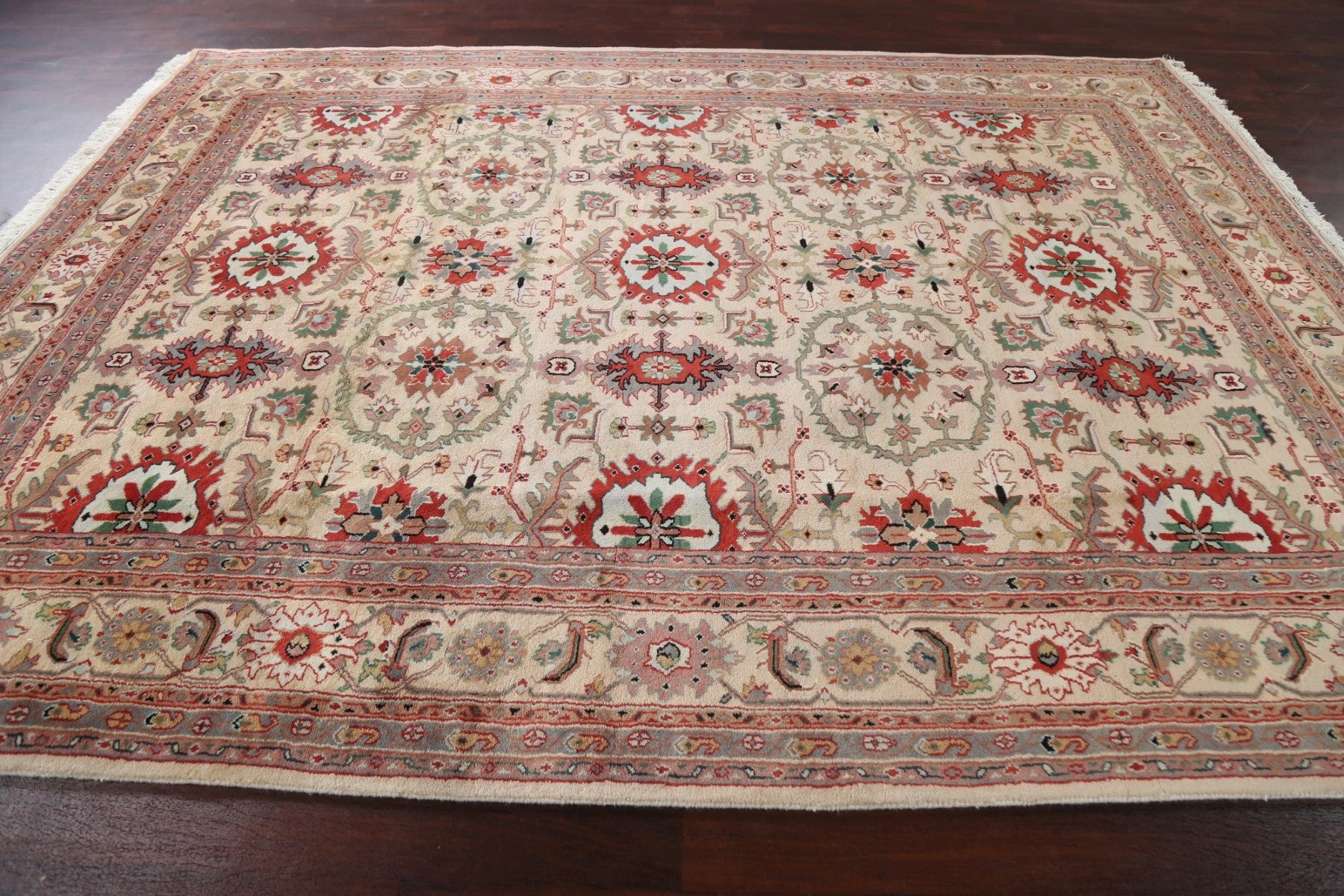 A Beautiful Genuine India Oushak rug is Hand Knotted by skillful weavers in India with 100% Wool Material. This rug is in New, First Quality condition. dimensions are 11' 3'' X 8' 6'' in foot and 343 X 259 in centimeter. the primary color is Beige & Ivories.