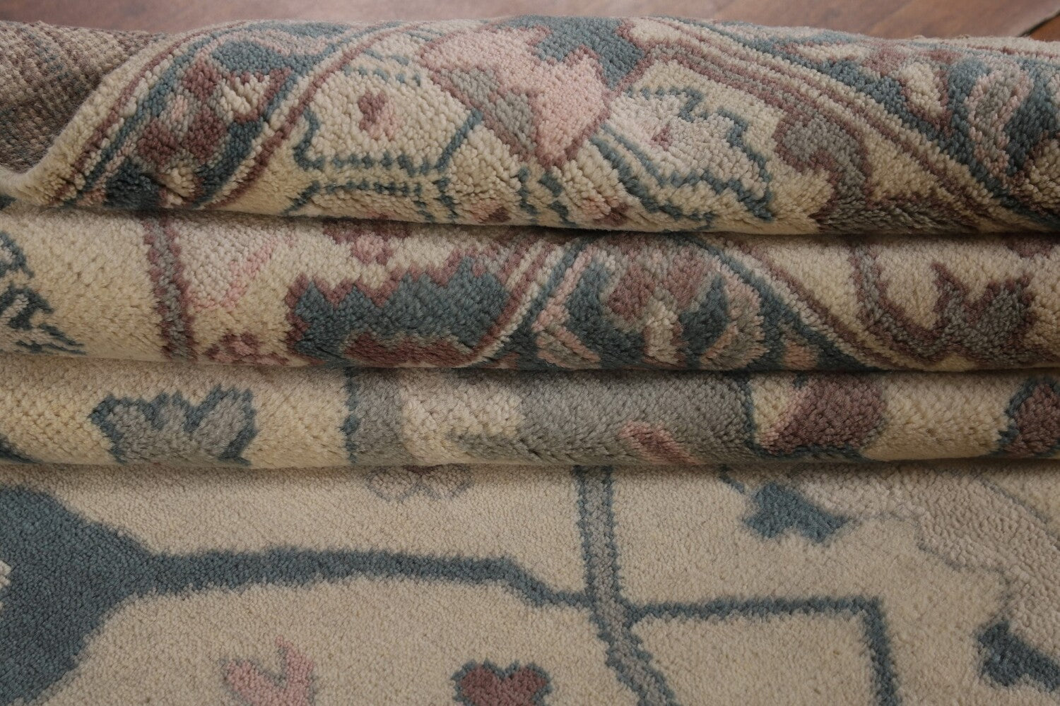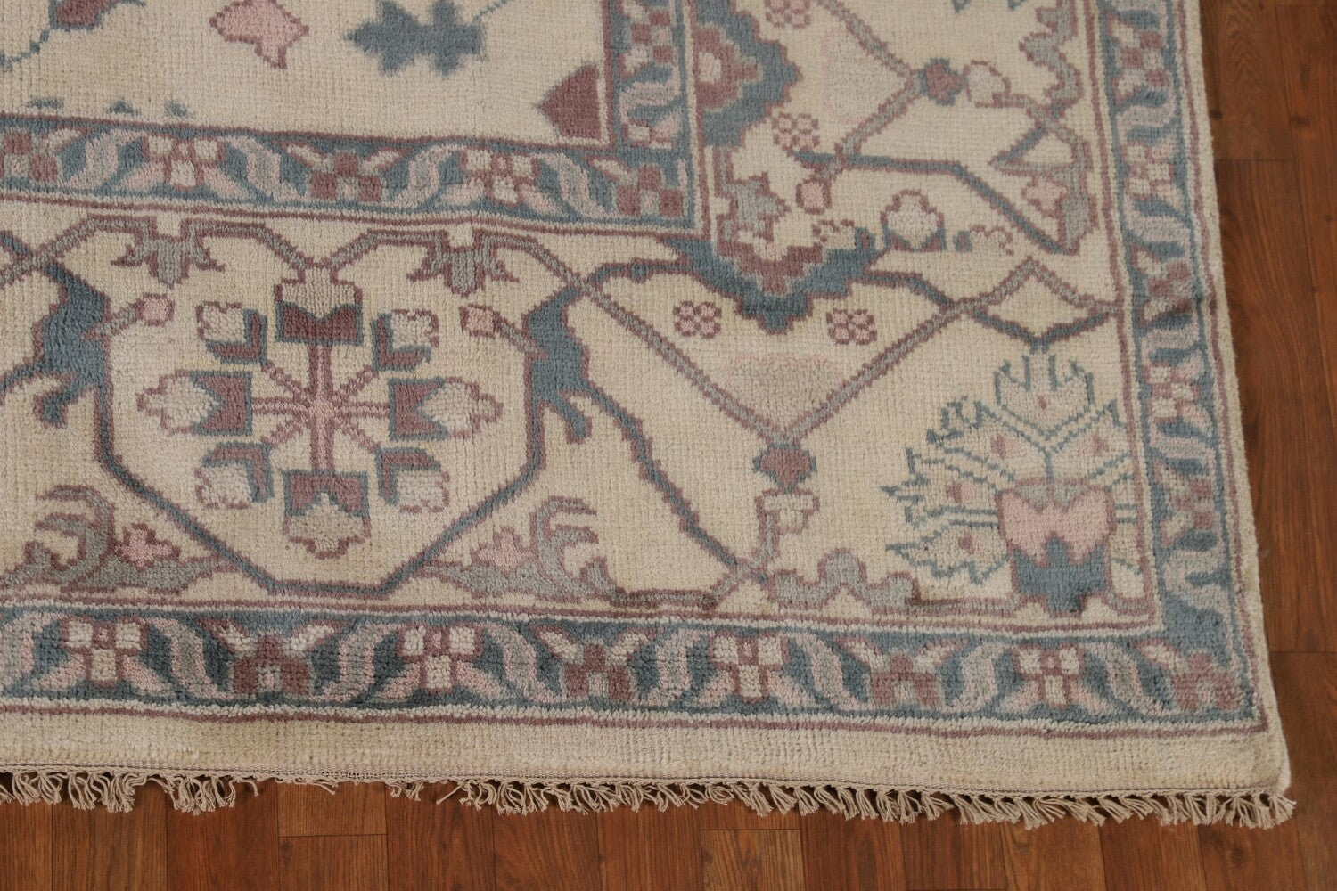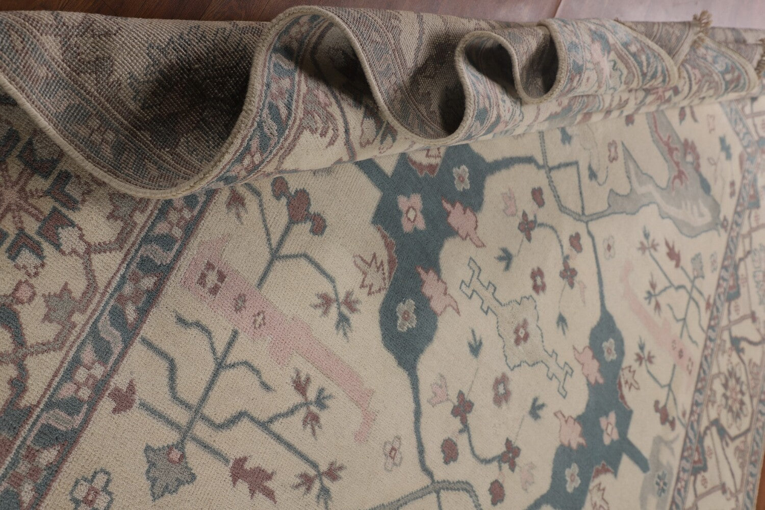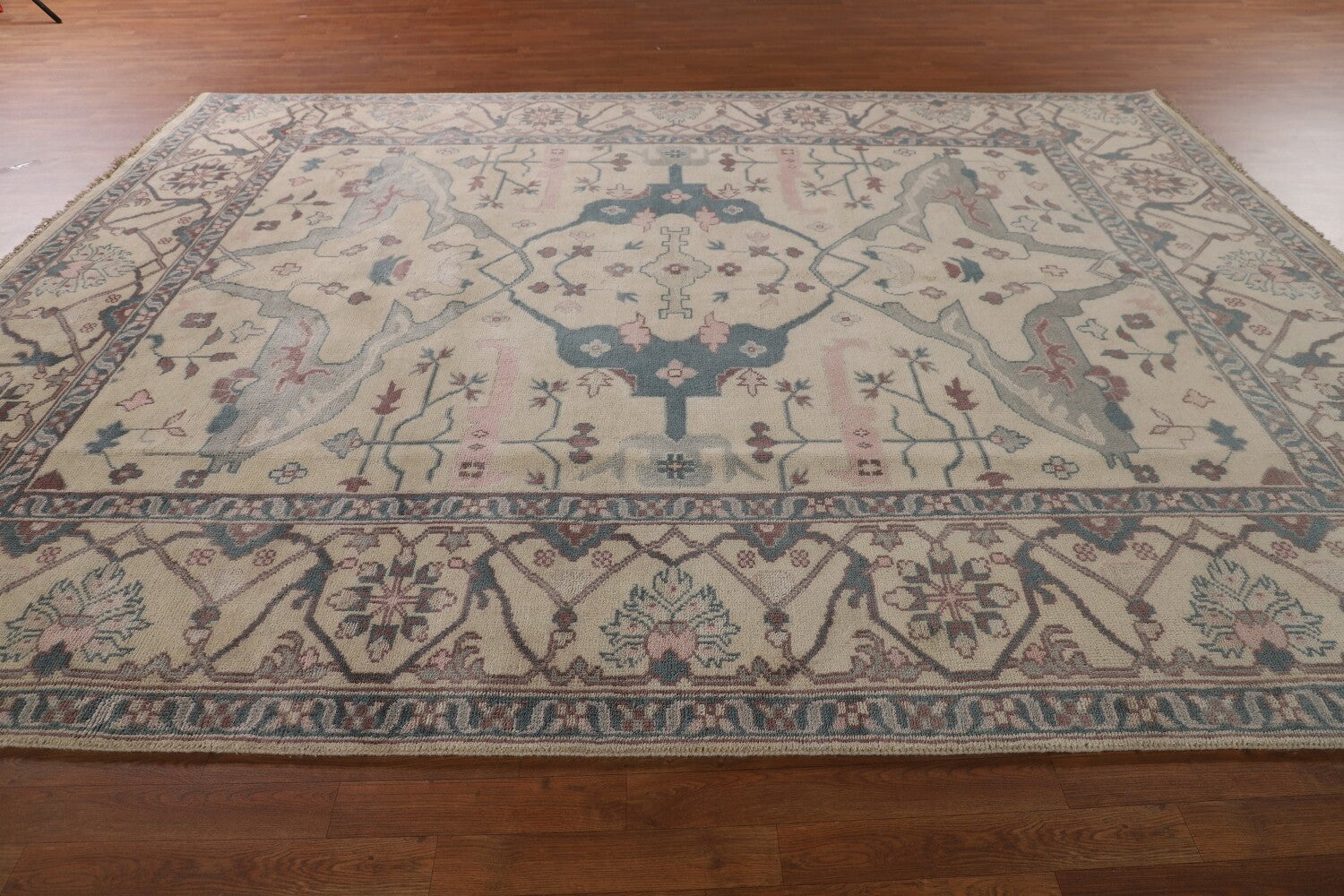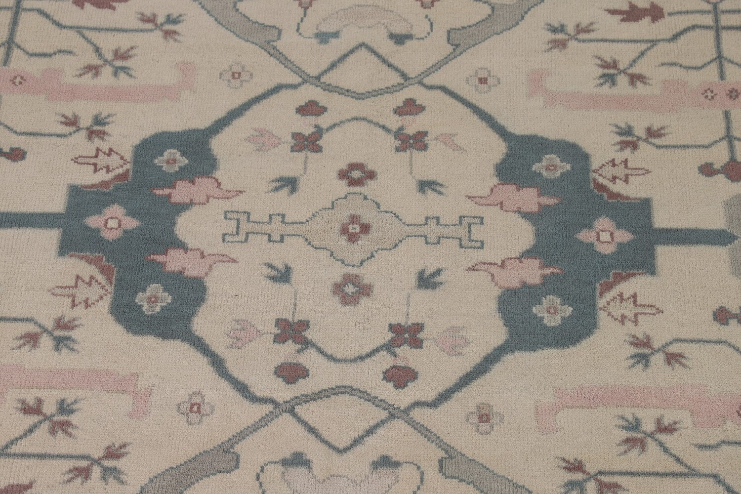 A Beautiful Genuine India Oushak rug is Hand Knotted by skillful weavers in India with 100% Wool Material. This rug is in New, First Quality condition. dimensions are 11' 9'' X 9' 0'' in foot and 358 X 274 in centimeter. the primary color is Beige & Ivories.
