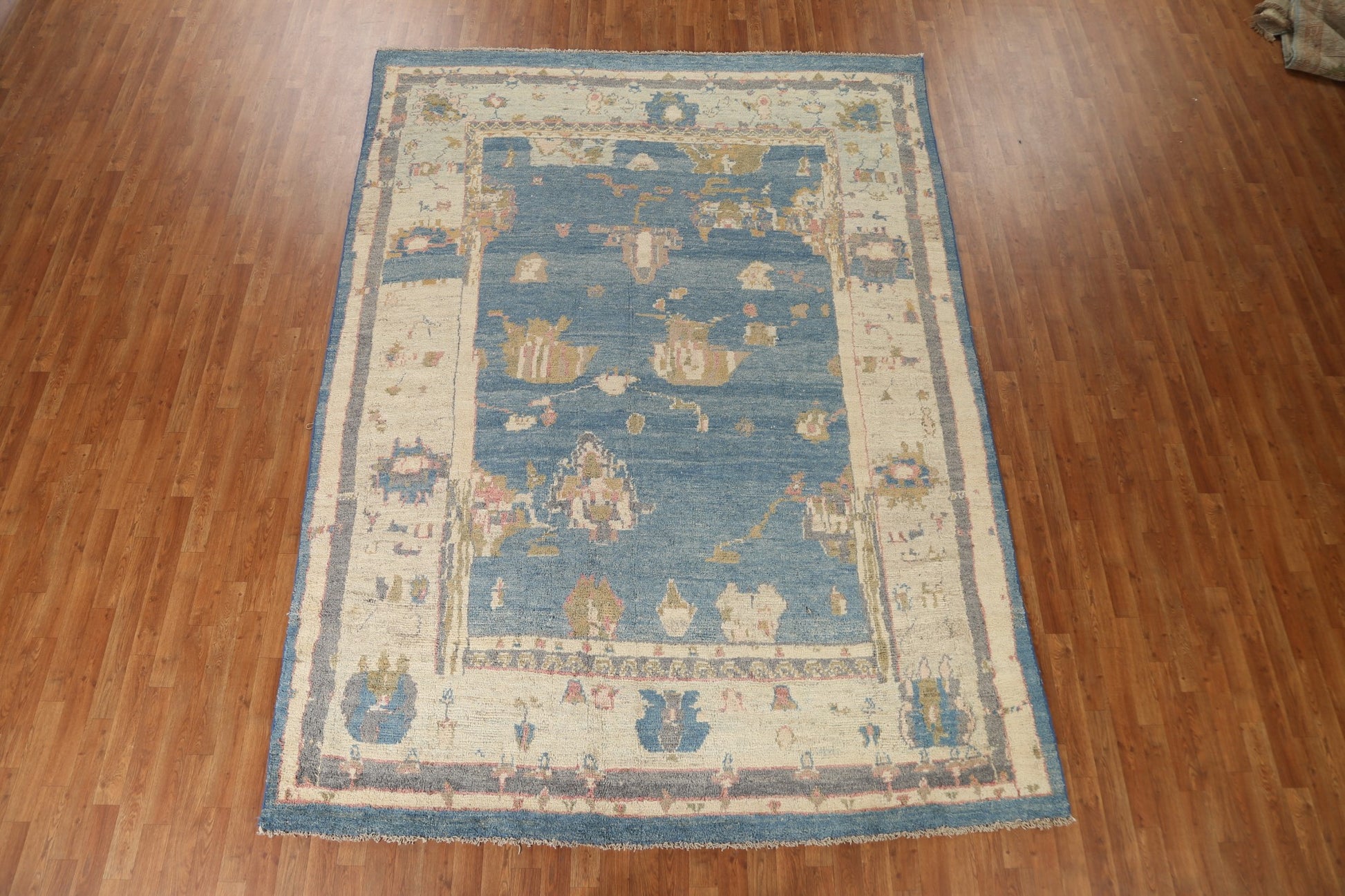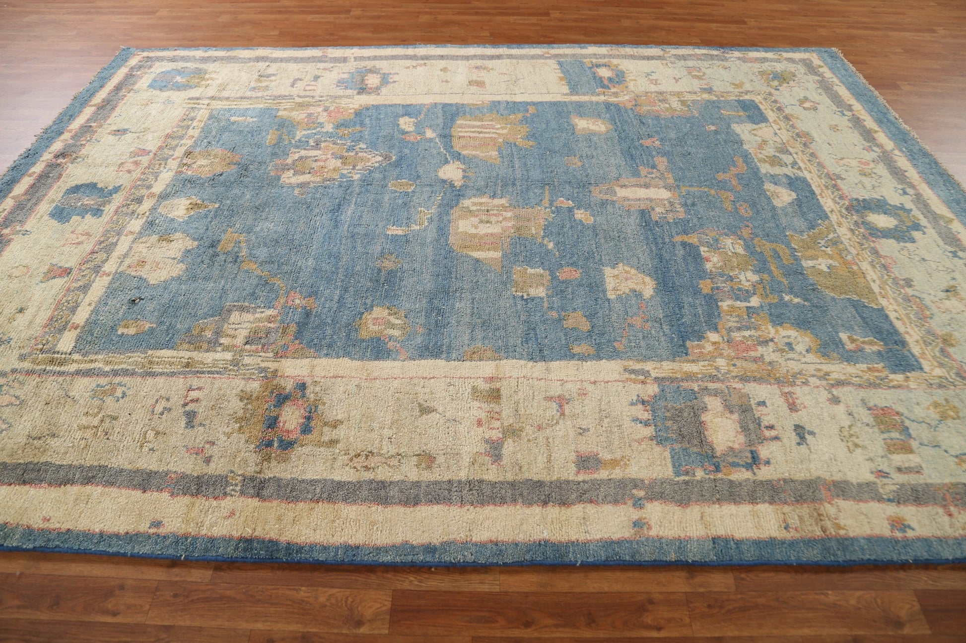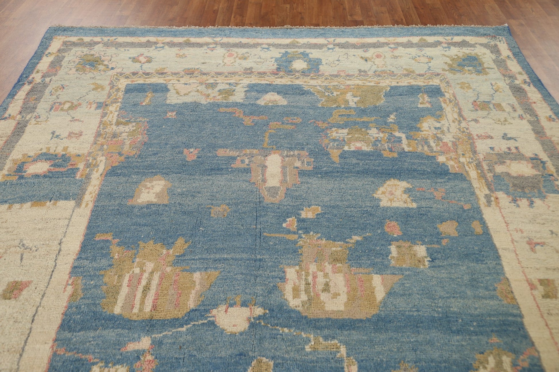 A Beautiful Genuine Turkey Oushak rug is Hand Knotted by skillful weavers in Turkey with 100% Wool Material. This rug is in condition. dimensions are 11' 0'' X 7' 10'' in foot and 335 X 239 in centimeter. the primary color is Navy Blue & Blues.