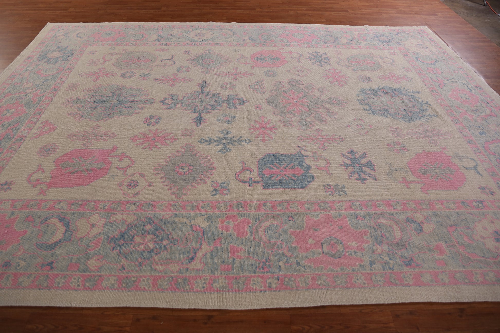 A Beautiful Genuine Turkey Oushak rug is Hand Knotted by skillful weavers in Turkey with 100% Wool Material. This rug is in New, First Quality condition. dimensions are 12' 4'' X 9' 0'' in foot and 376 X 274 in centimeter. the primary color is Beige & Ivories.