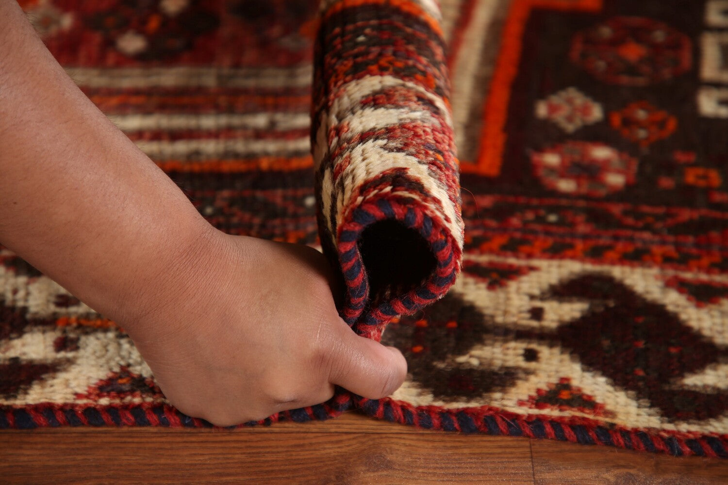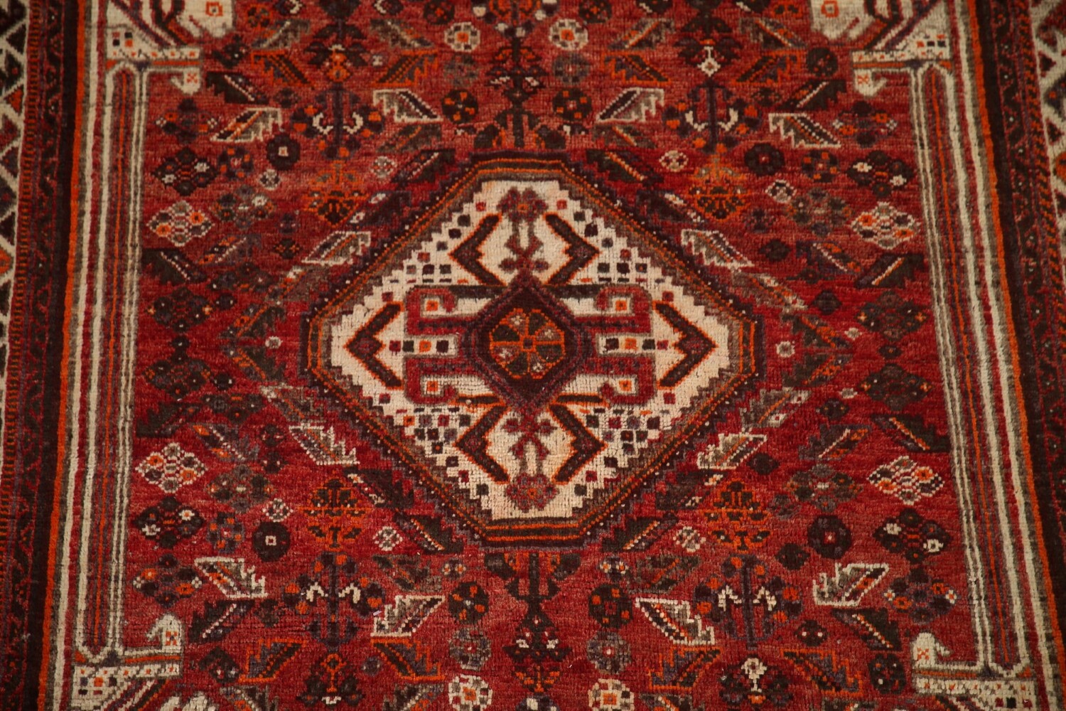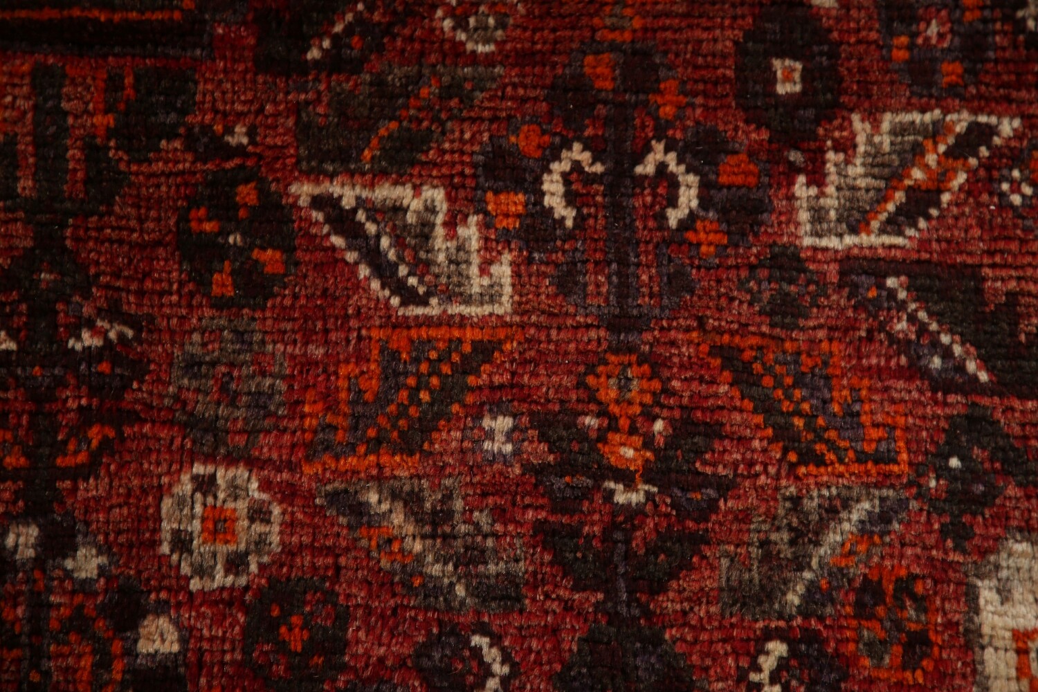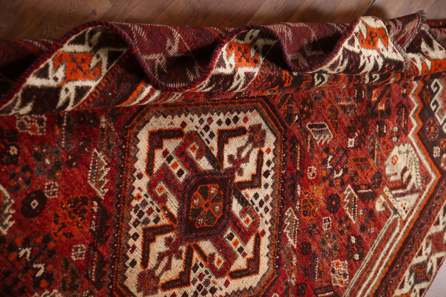 A Beautiful Genuine Persia ( Persia ) Qashqai rug is Hand Knotted by skillful weavers in Persia ( Persia ) with 100% Wool Material. This rug is in Very Good (Small Bleeding) condition. dimensions are 8' 0'' X 5' 2'' in foot and 244 X 157 in centimeter. the primary color is Red.