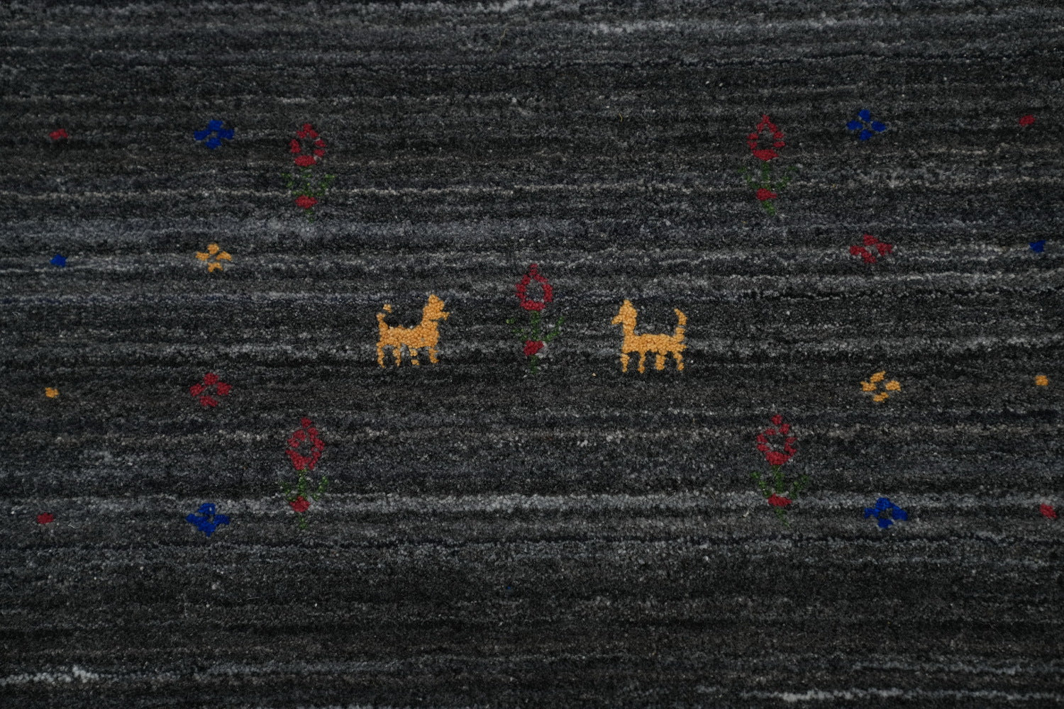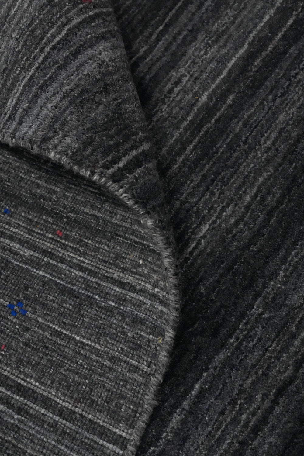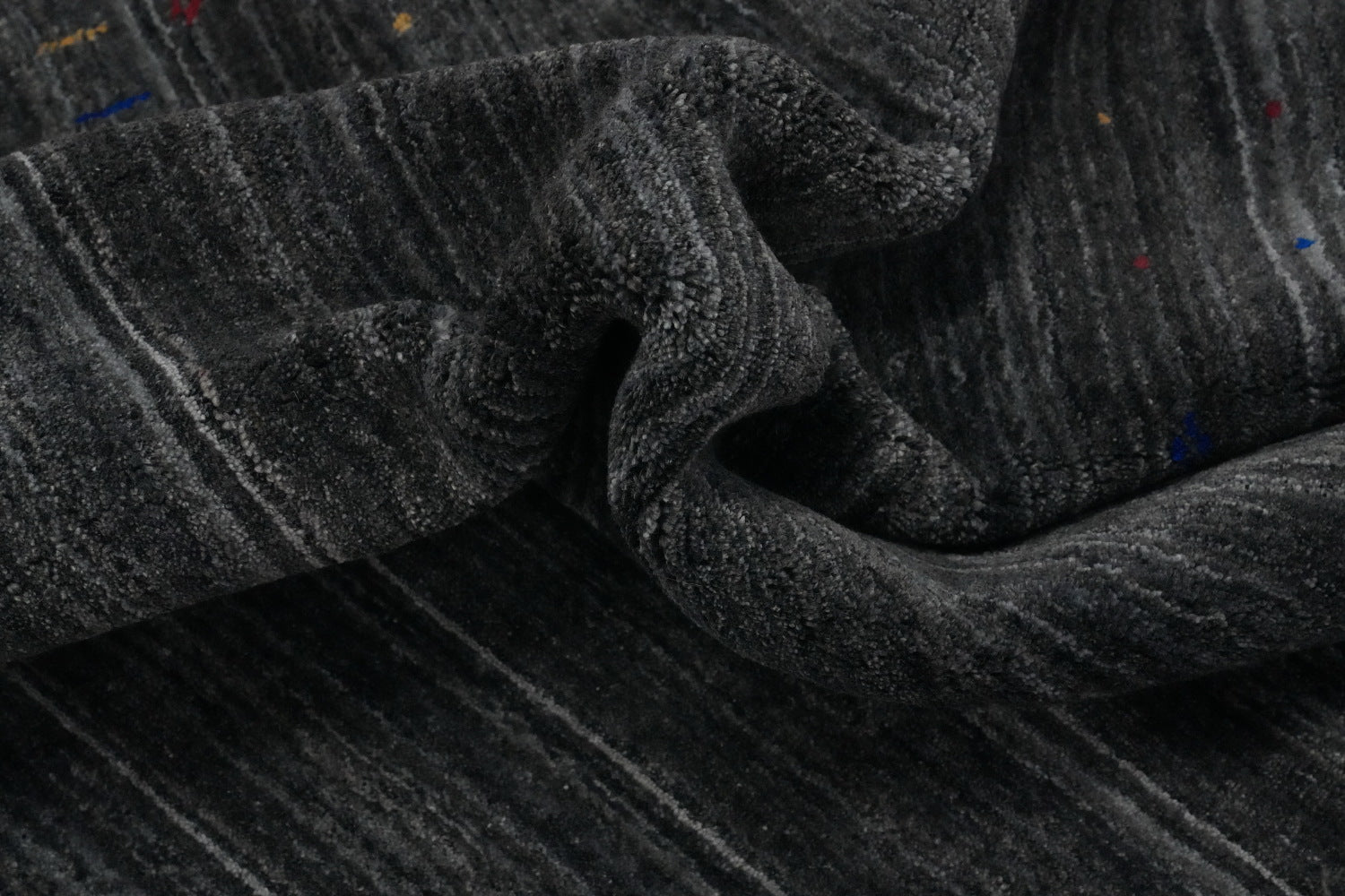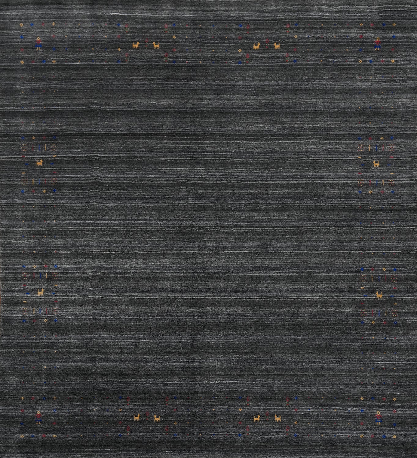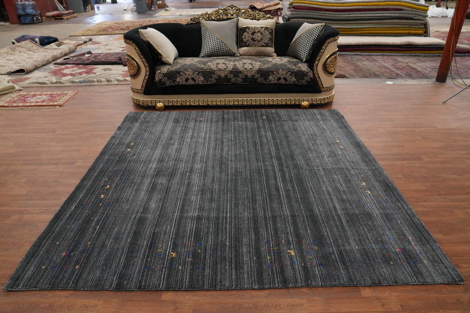 A Beautiful Genuine India Gabbeh rug is Hand Knotted by skillful weavers in India with 100% Wool Material. This rug is in New, First Quality condition. dimensions are 7' 10'' X 8' 1'' in foot and 239 X 246 in centimeter. the primary color is Greys & Charcoal.
