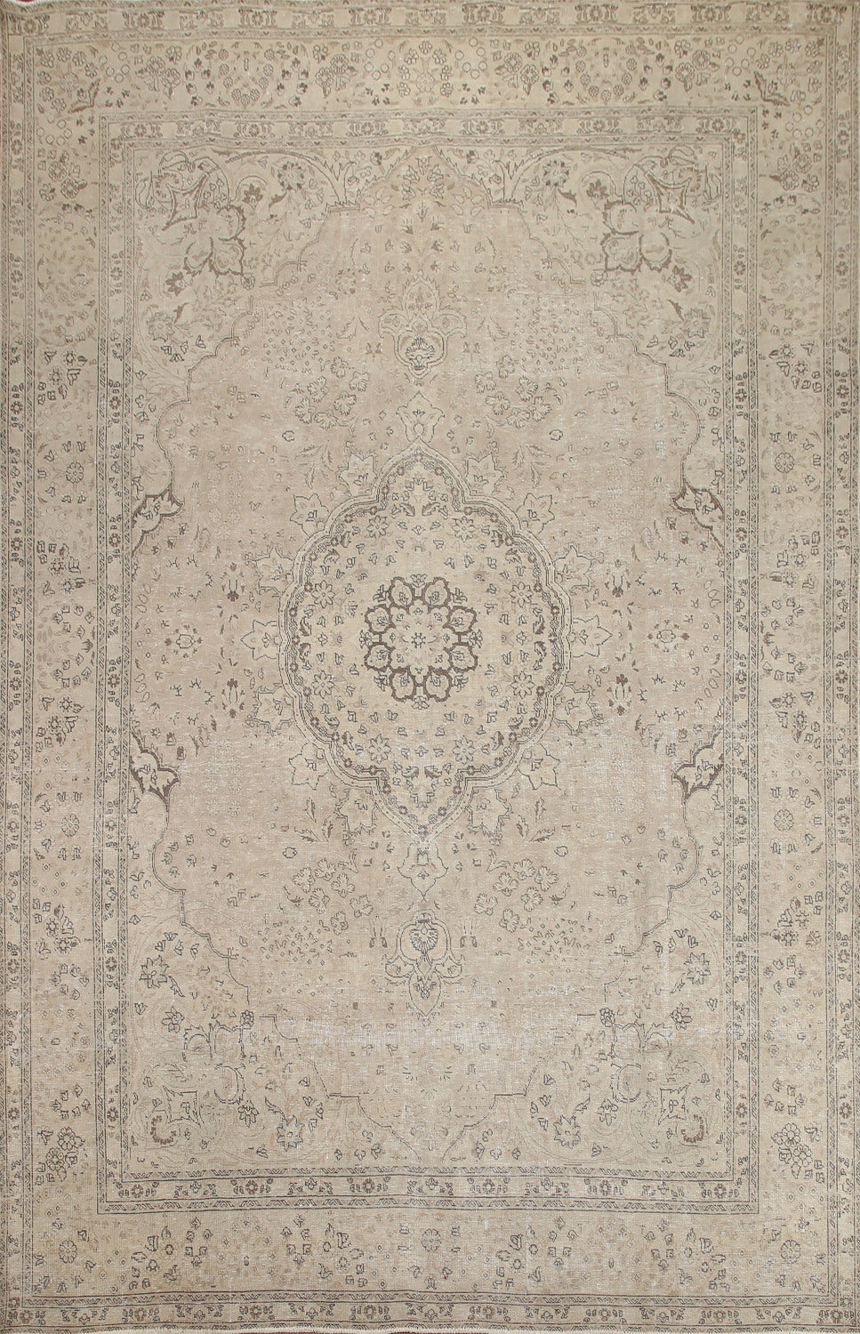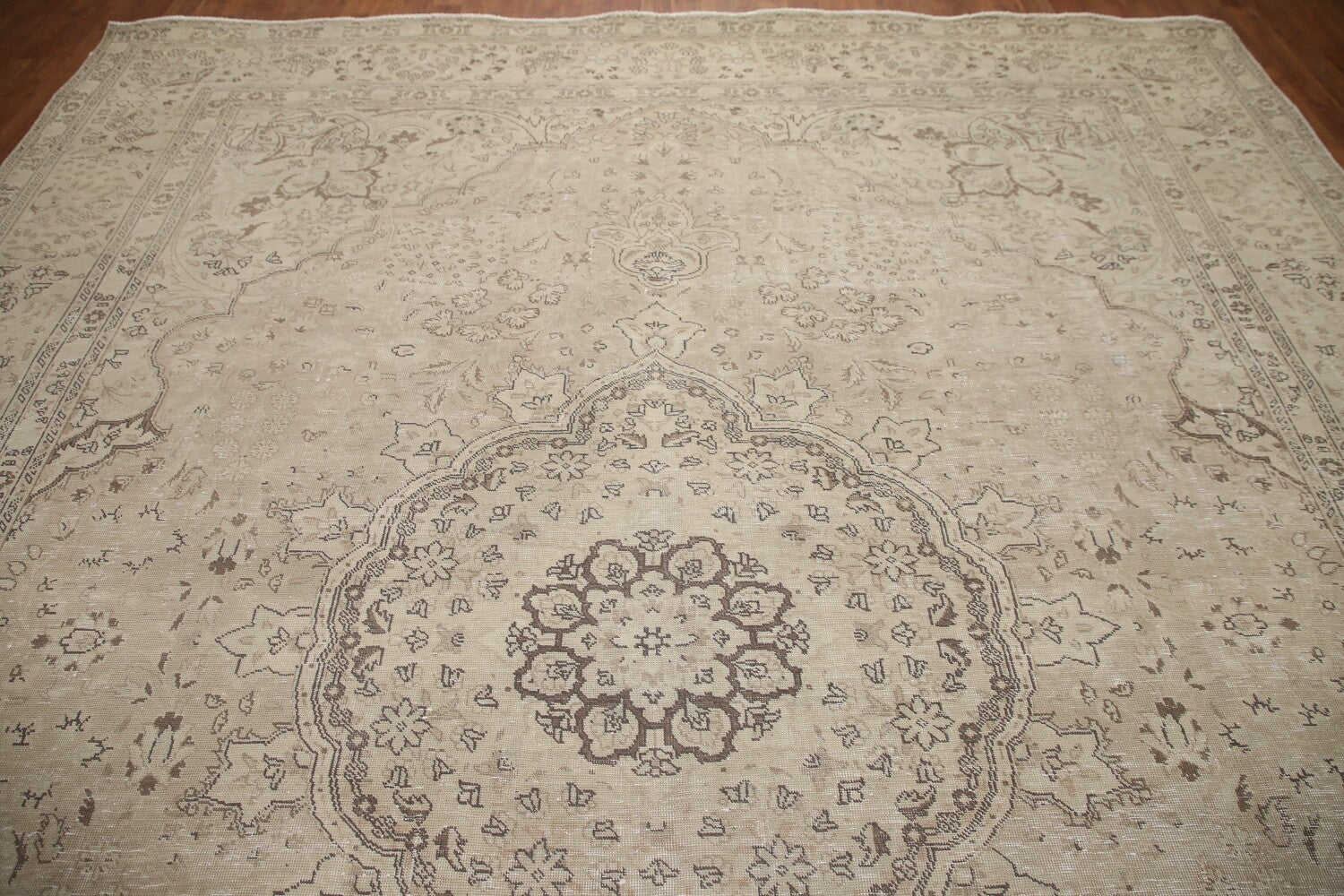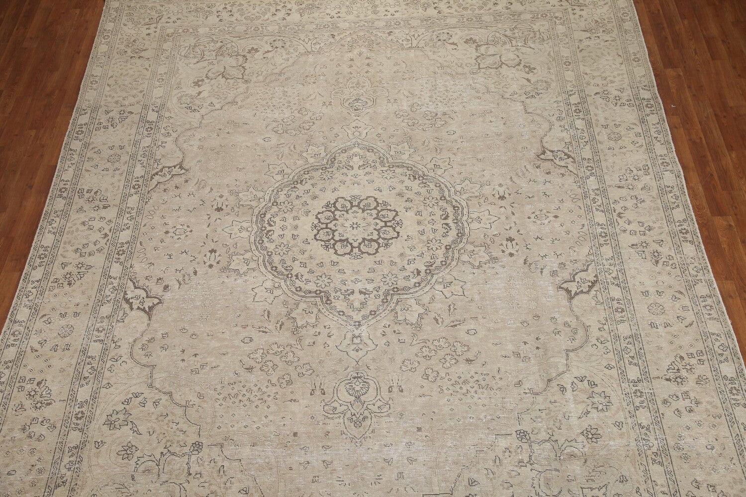 A Beautiful Genuine Persia ( Persia ) Tabriz rug is Hand Knotted by skillful weavers in Persia ( Persia ) with 100% Wool Material. This rug is in Very Good (Low Pile) condition. dimensions are 12' 4'' X 9' 10'' in foot and 376 X 300 in centimeter. the primary color is Beige & Ivories.