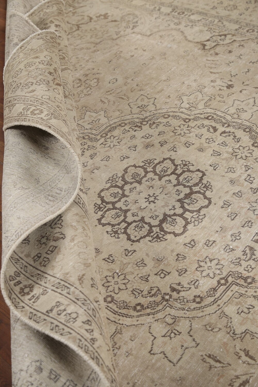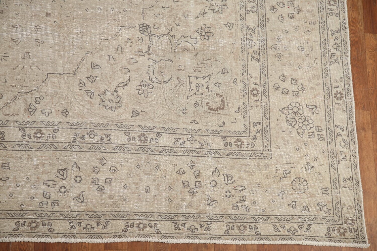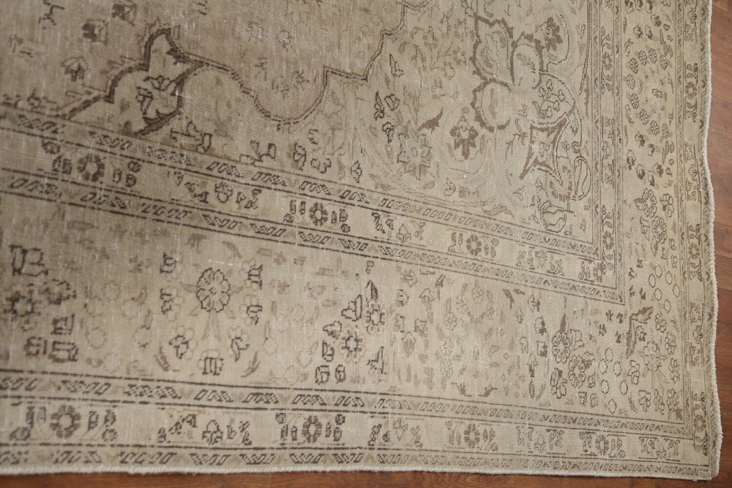 A Beautiful Genuine Persia ( Persia ) Tabriz rug is Hand Knotted by skillful weavers in Persia ( Persia ) with 100% Wool Material. This rug is in Very Good (Low Pile) condition. dimensions are 12' 4'' X 9' 10'' in foot and 376 X 300 in centimeter. the primary color is Beige & Ivories.