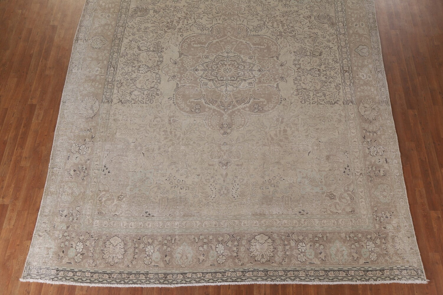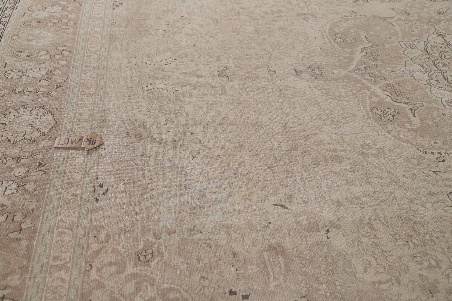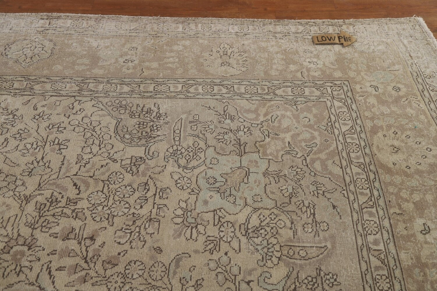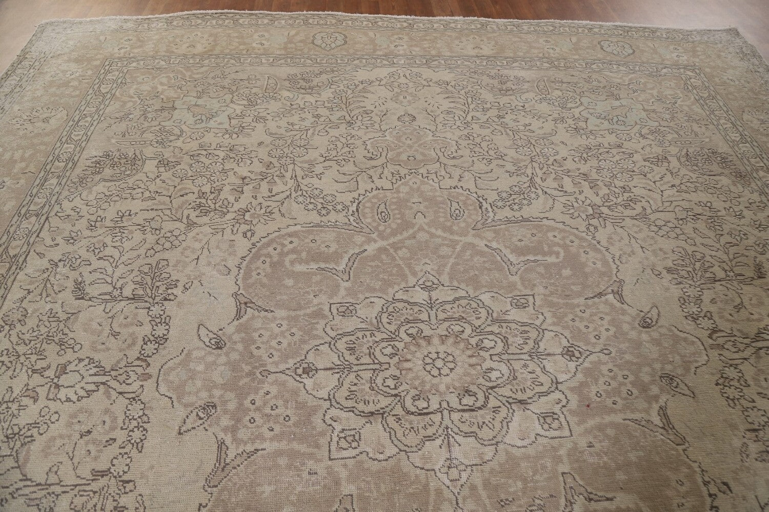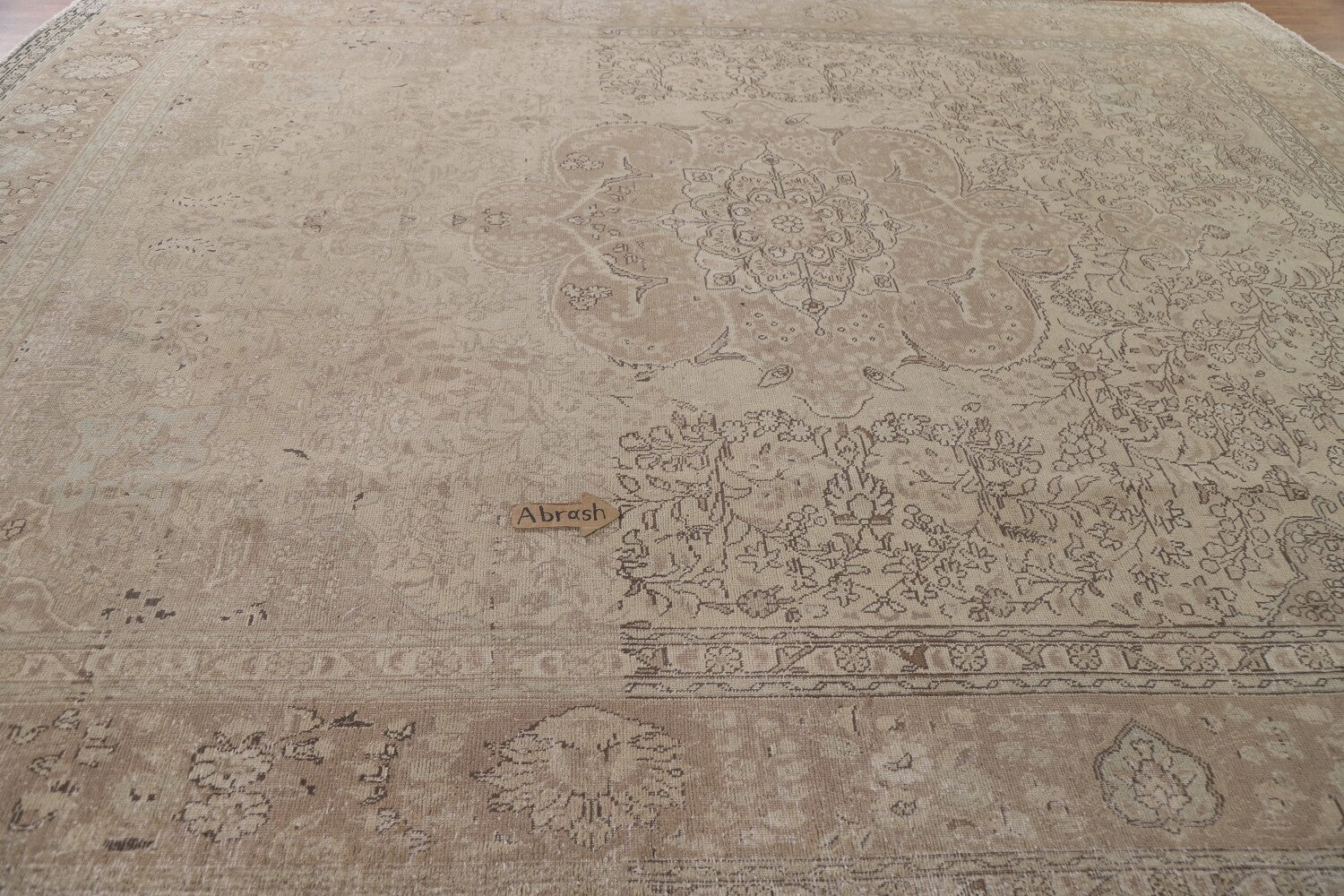 A Beautiful Genuine Persia ( Persia ) Tabriz rug is Hand Knotted by skillful weavers in Persia ( Persia ) with 100% Wool Material. This rug is in Very Good (Low Pile-Abrash) condition. dimensions are 12' 7'' X 10' 2'' in foot and 384 X 310 in centimeter. the primary color is Beige & Ivories.