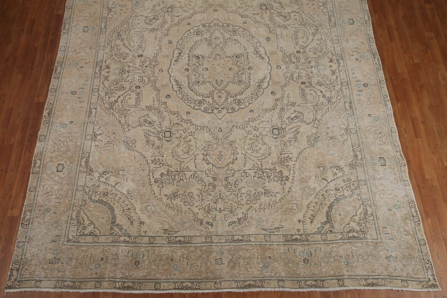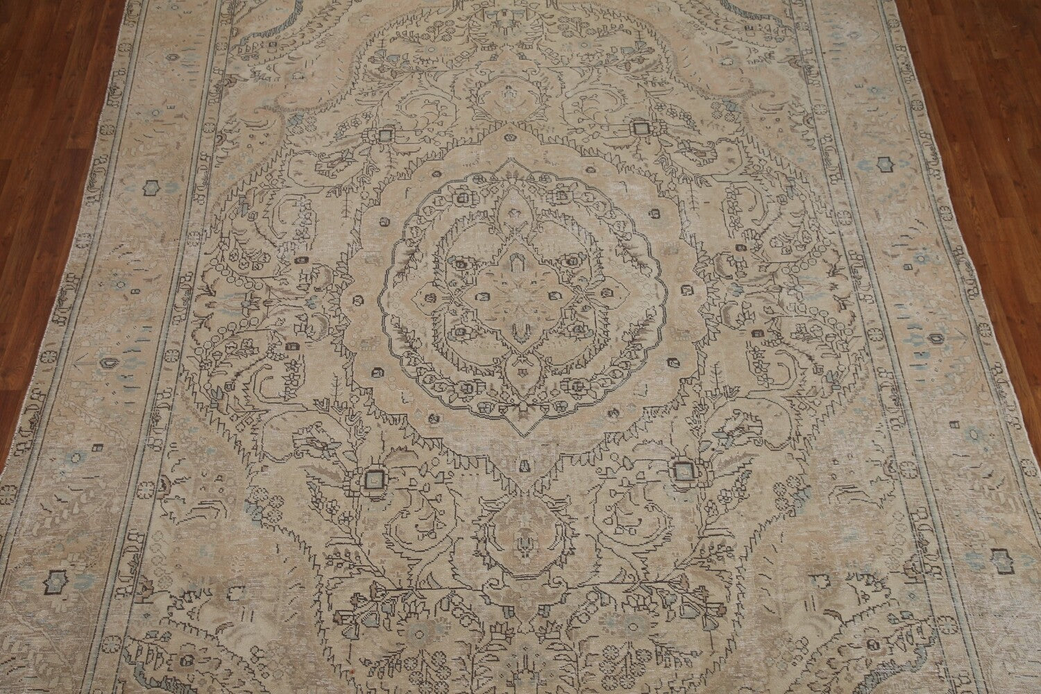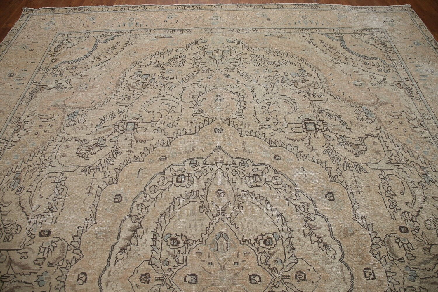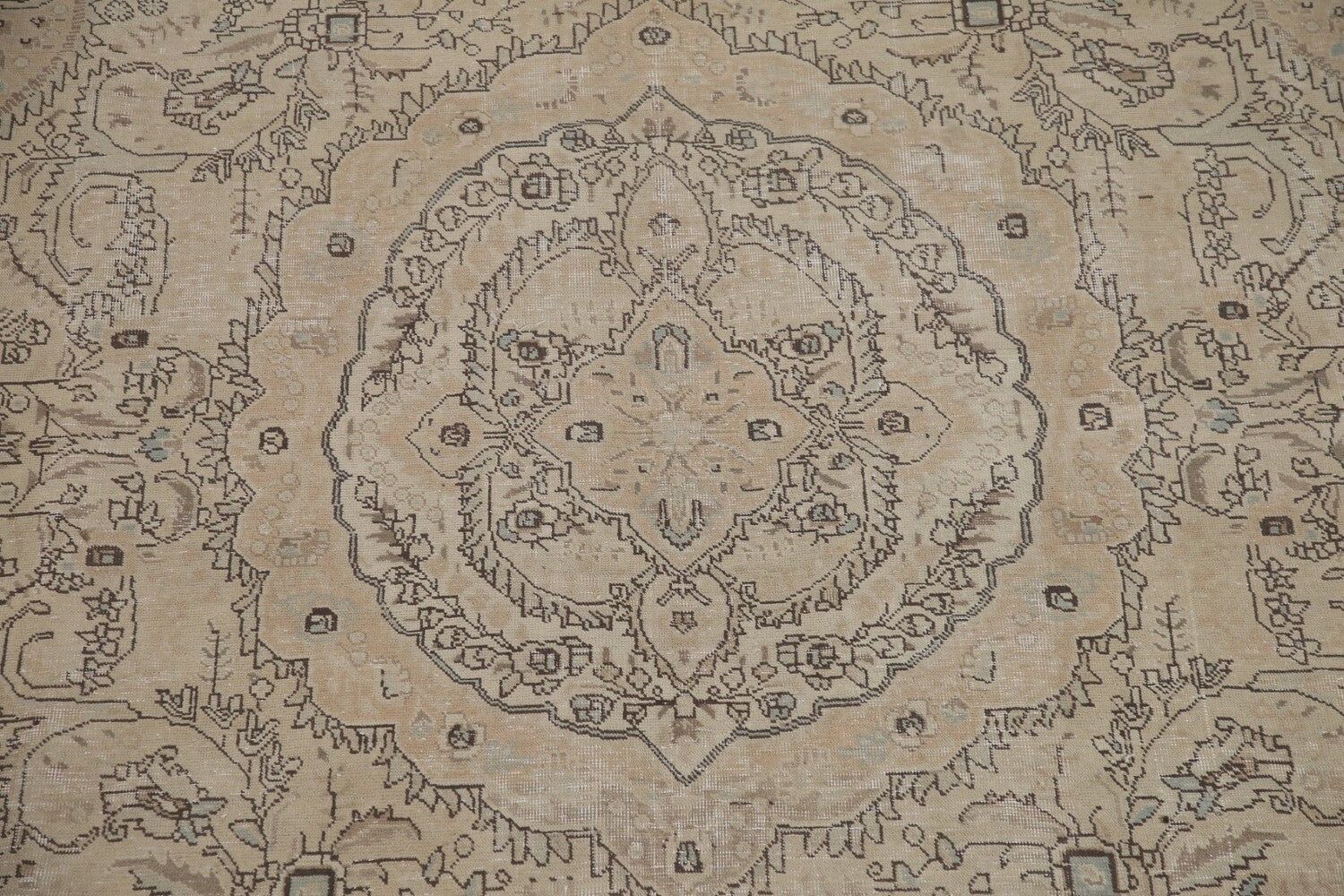 A Beautiful Genuine Persia ( Persia ) Tabriz rug is Hand Knotted by skillful weavers in Persia ( Persia ) with 100% Wool Material. This rug is in Very Good ( Low Pile ) condition. dimensions are 12' 7'' X 9' 7'' in foot and 384 X 292 in centimeter. the primary color is Beige & Ivories.