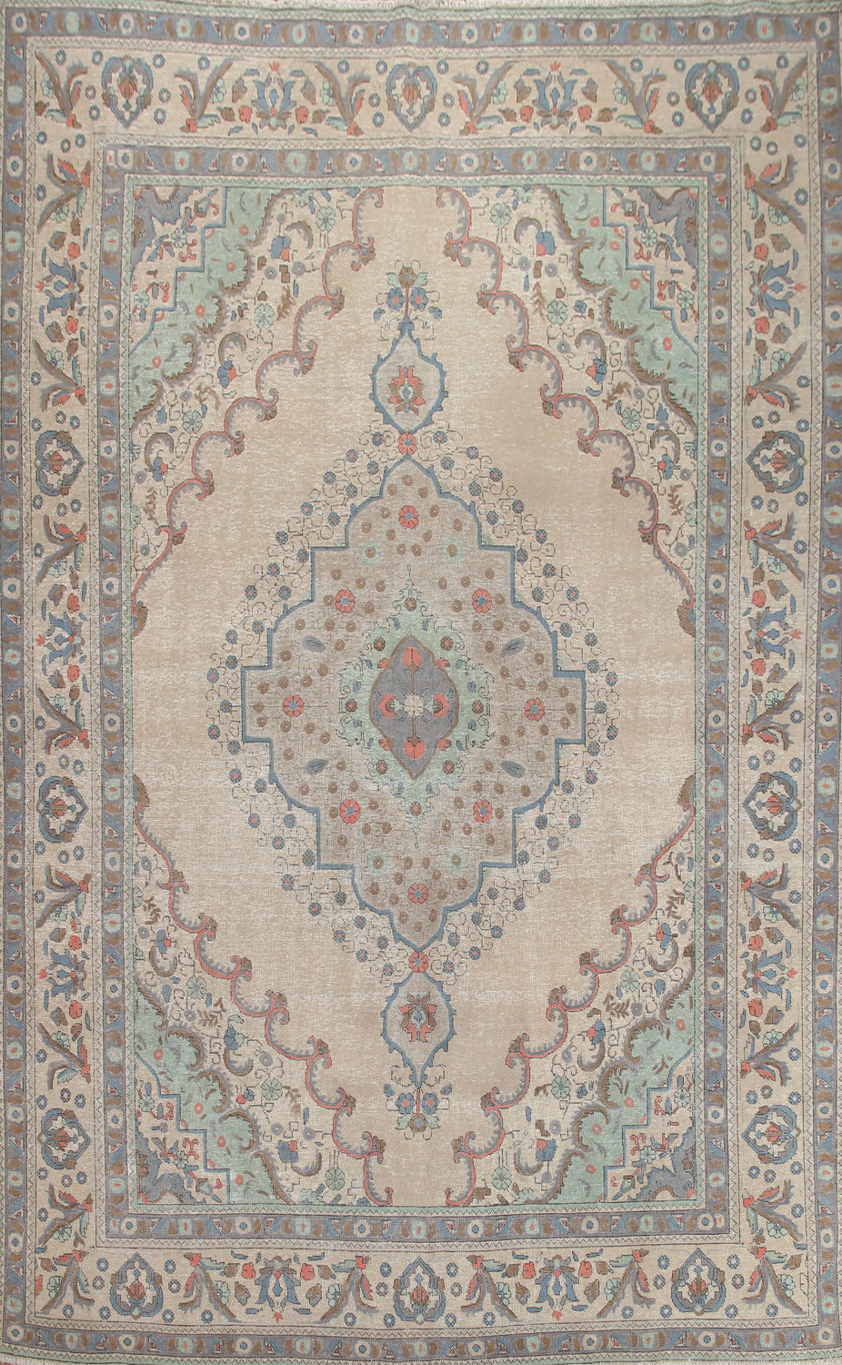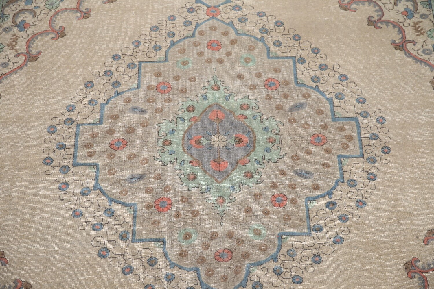 A Beautiful Genuine Persia ( Persia ) Tabriz rug is Hand Knotted by skillful weavers in Persia ( Persia ) with 100% Wool Material. This rug is in Very Good (Evenly Low Pile) condition. dimensions are 12' 10'' X 9' 6'' in foot and 391 X 290 in centimeter. the primary color is Beige & Ivories.