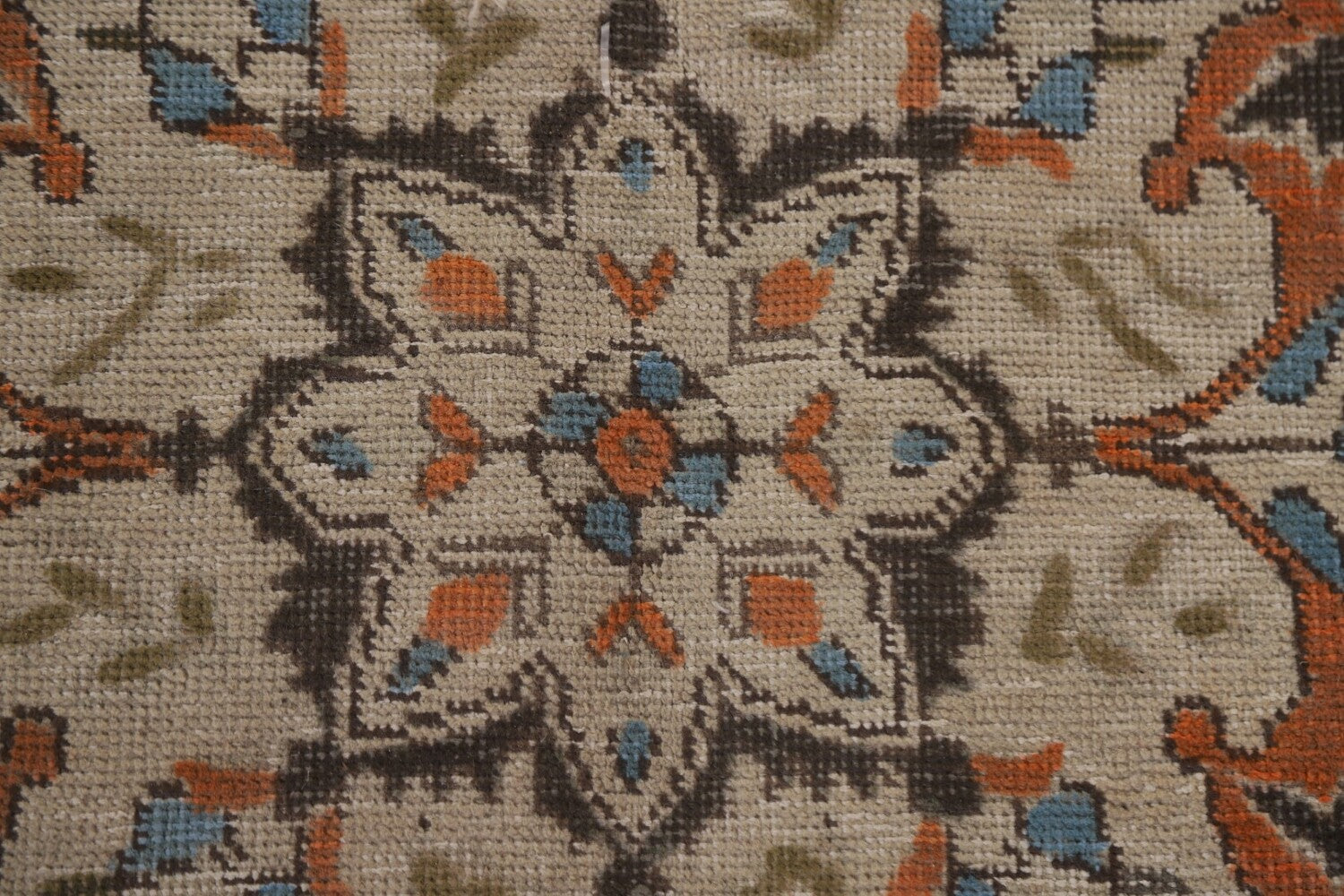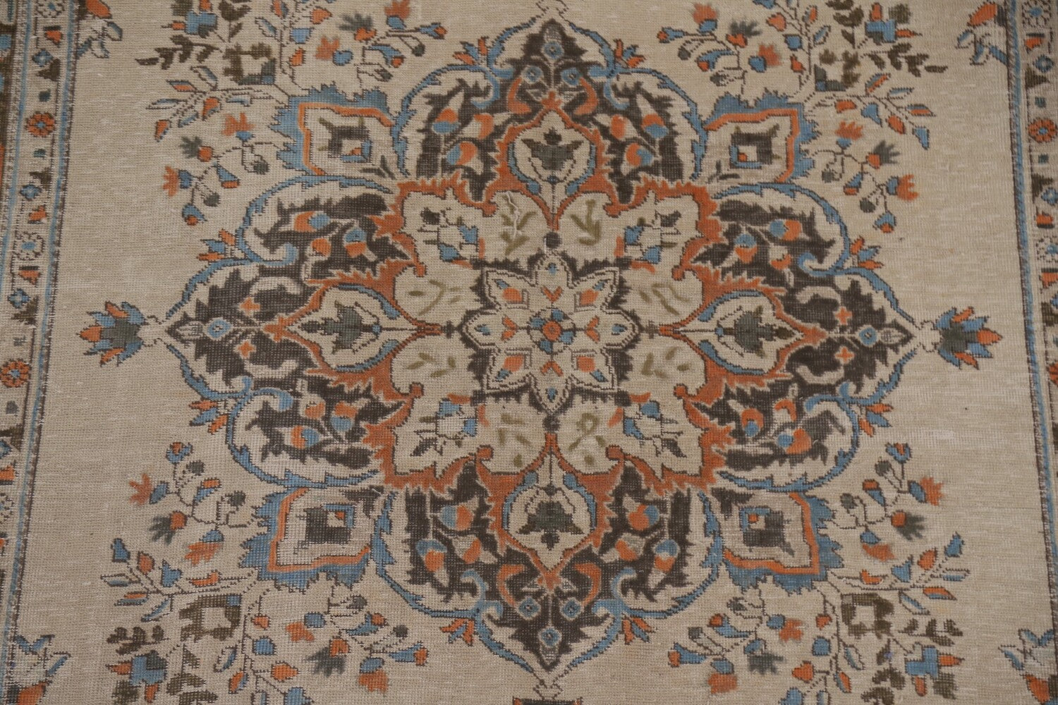 A Beautiful Genuine Persia ( Persia ) Tabriz rug is Hand Knotted by skillful weavers in Persia ( Persia ) with 100% Wool Material. This rug is in Very Good ( Evenly Low Pile-Repair) condition. dimensions are 9' 8'' X 6' 5'' in foot and 295 X 196 in centimeter. the primary color is Beige & Ivories.