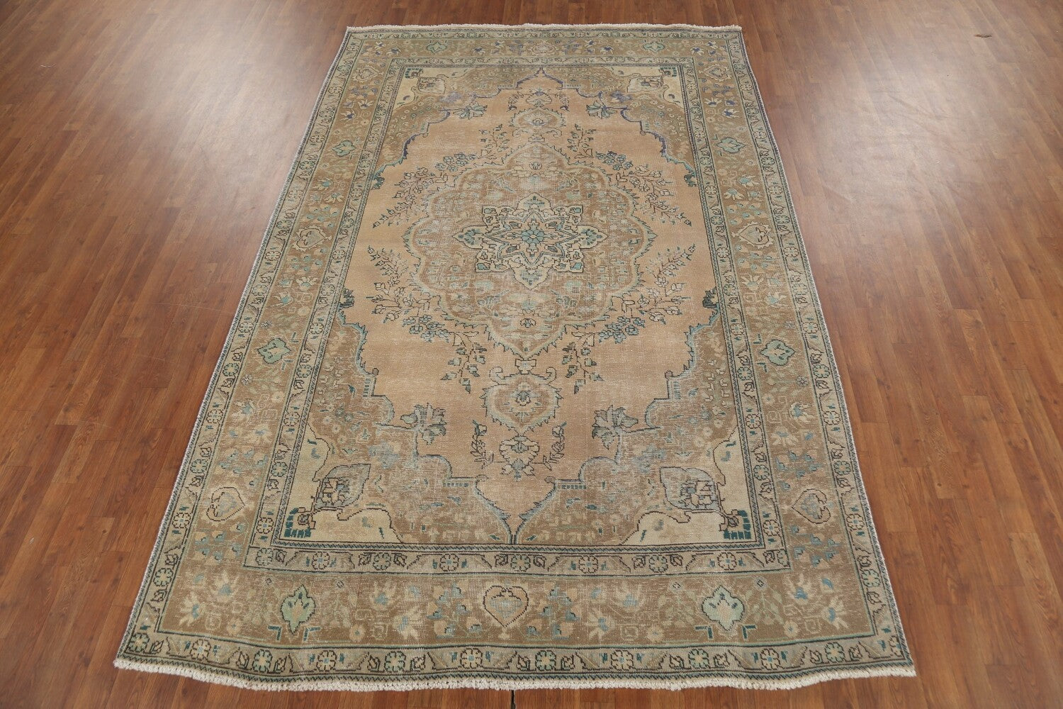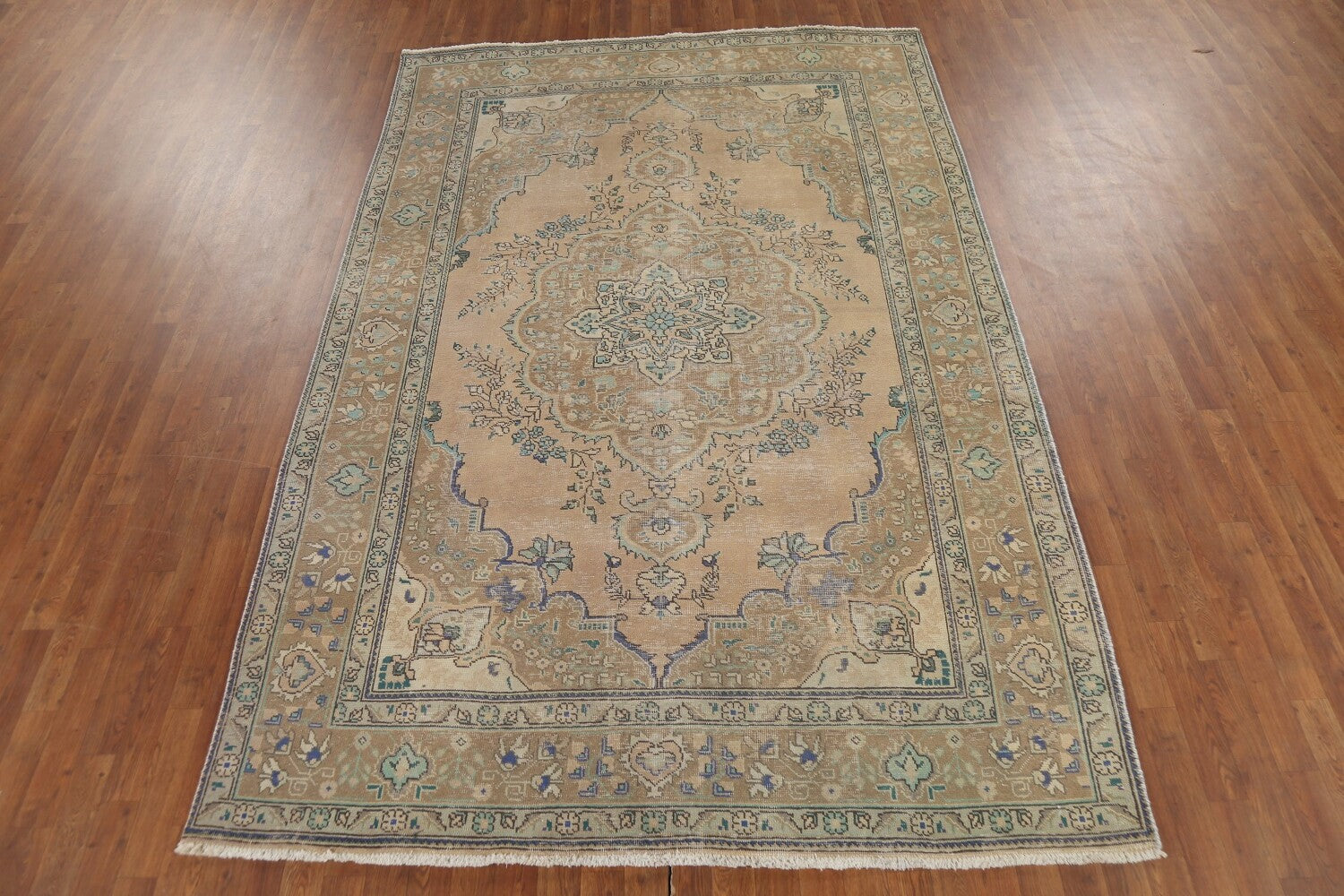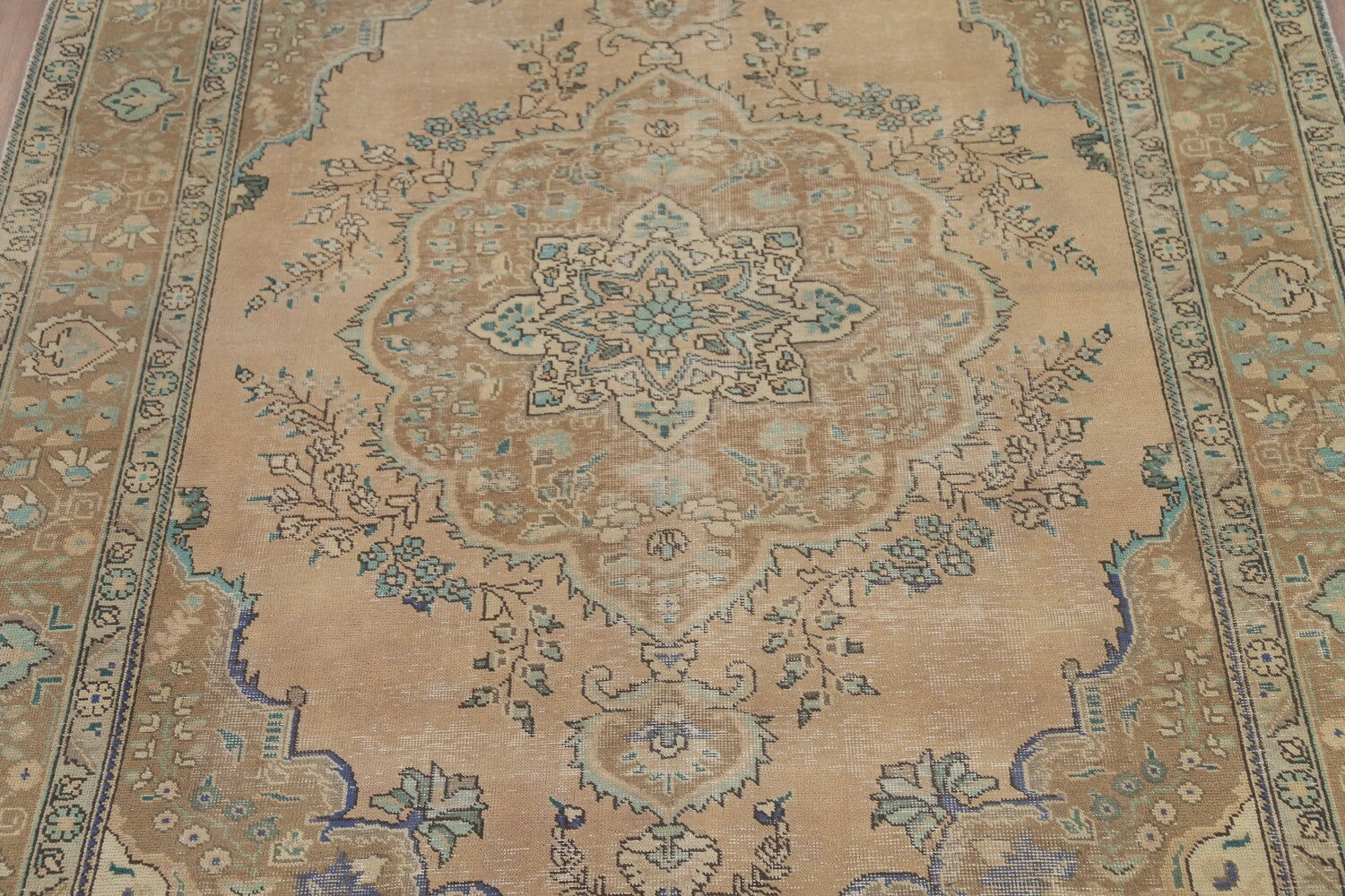 A Beautiful Genuine Persia ( Persia ) Tabriz rug is Hand Knotted by skillful weavers in Persia ( Persia ) with 100% Wool Material. This rug is in Very Good (Evenly Low Pile) condition. dimensions are 9' 9'' X 6' 6'' in foot and 297 X 198 in centimeter. the primary color is Peach.