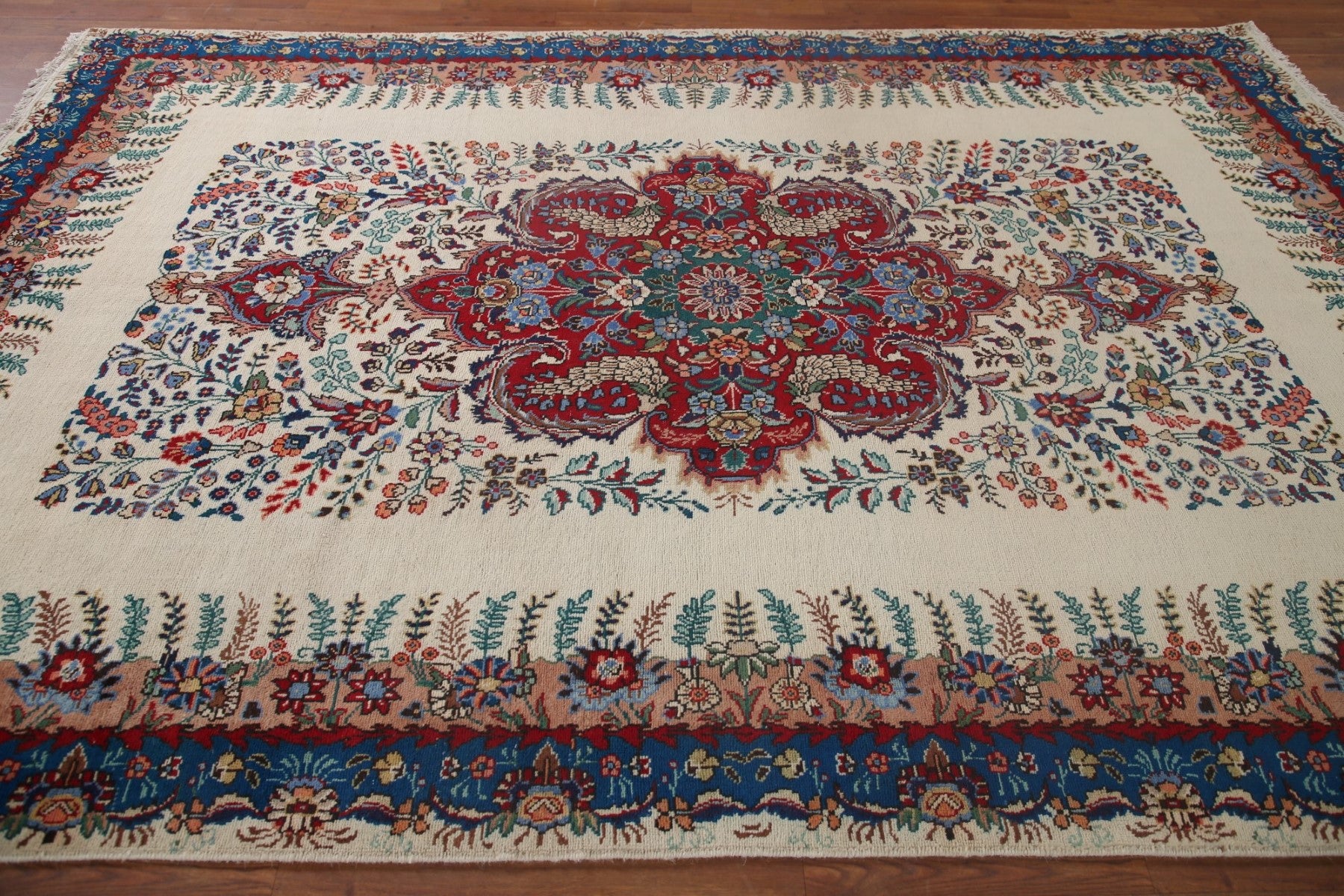 A Beautiful Genuine Persia ( Persia ) Tabriz rug is Hand Knotted by skillful weavers in Persia ( Persia ) with 100% Wool Material. This rug is in Very Good (Evenly Low Pile) condition. dimensions are 9' 10'' X 6' 6'' in foot and 300 X 198 in centimeter. the primary color is Beige & Ivories.