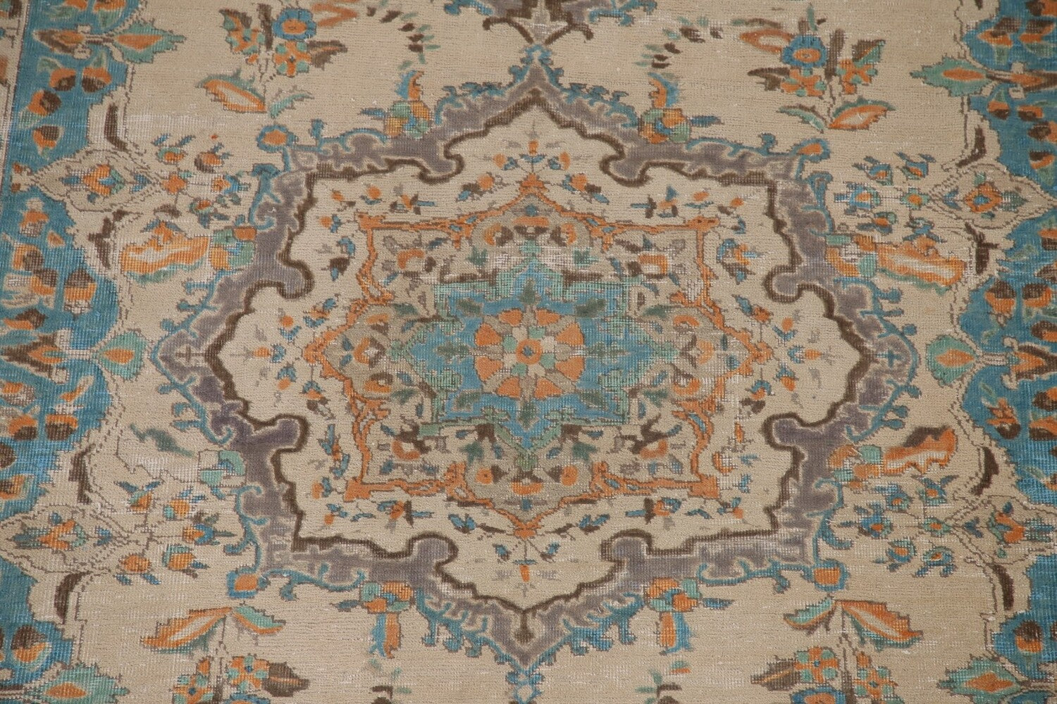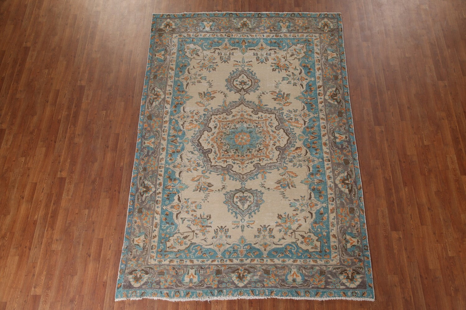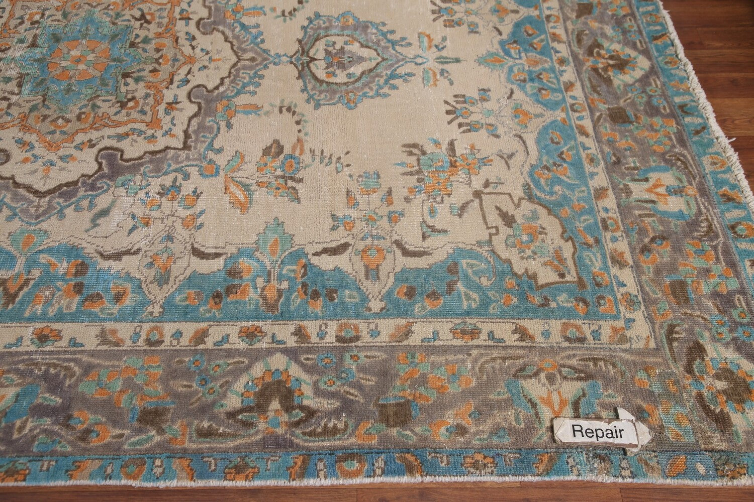 A Beautiful Genuine Persia ( Persia ) Tabriz rug is Hand Knotted by skillful weavers in Persia ( Persia ) with 100% Wool Material. This rug is in Very Good (Low Pile-Repair) condition. dimensions are 9' 8'' X 6' 8'' in foot and 295 X 203 in centimeter. the primary color is Beige & Ivories.