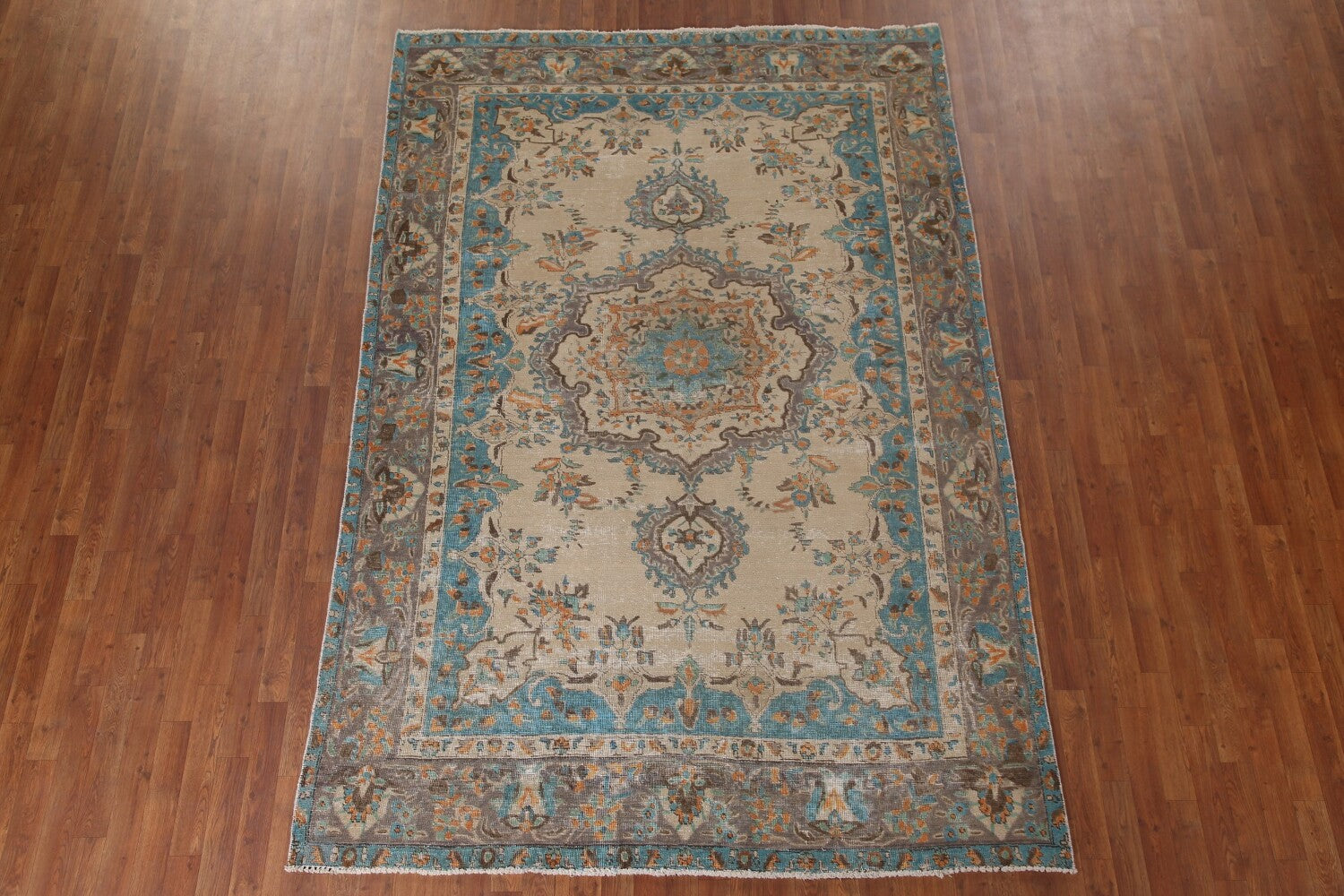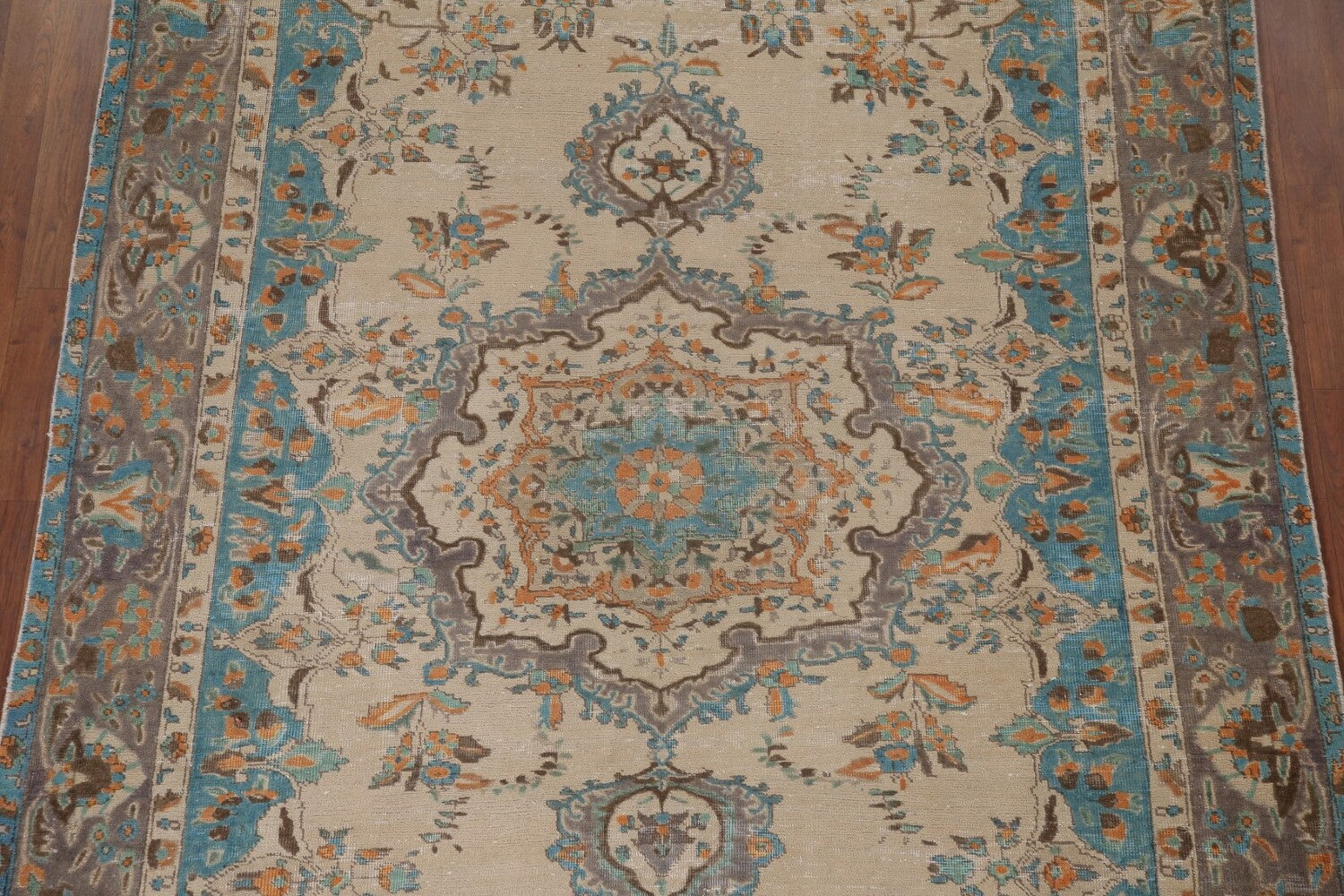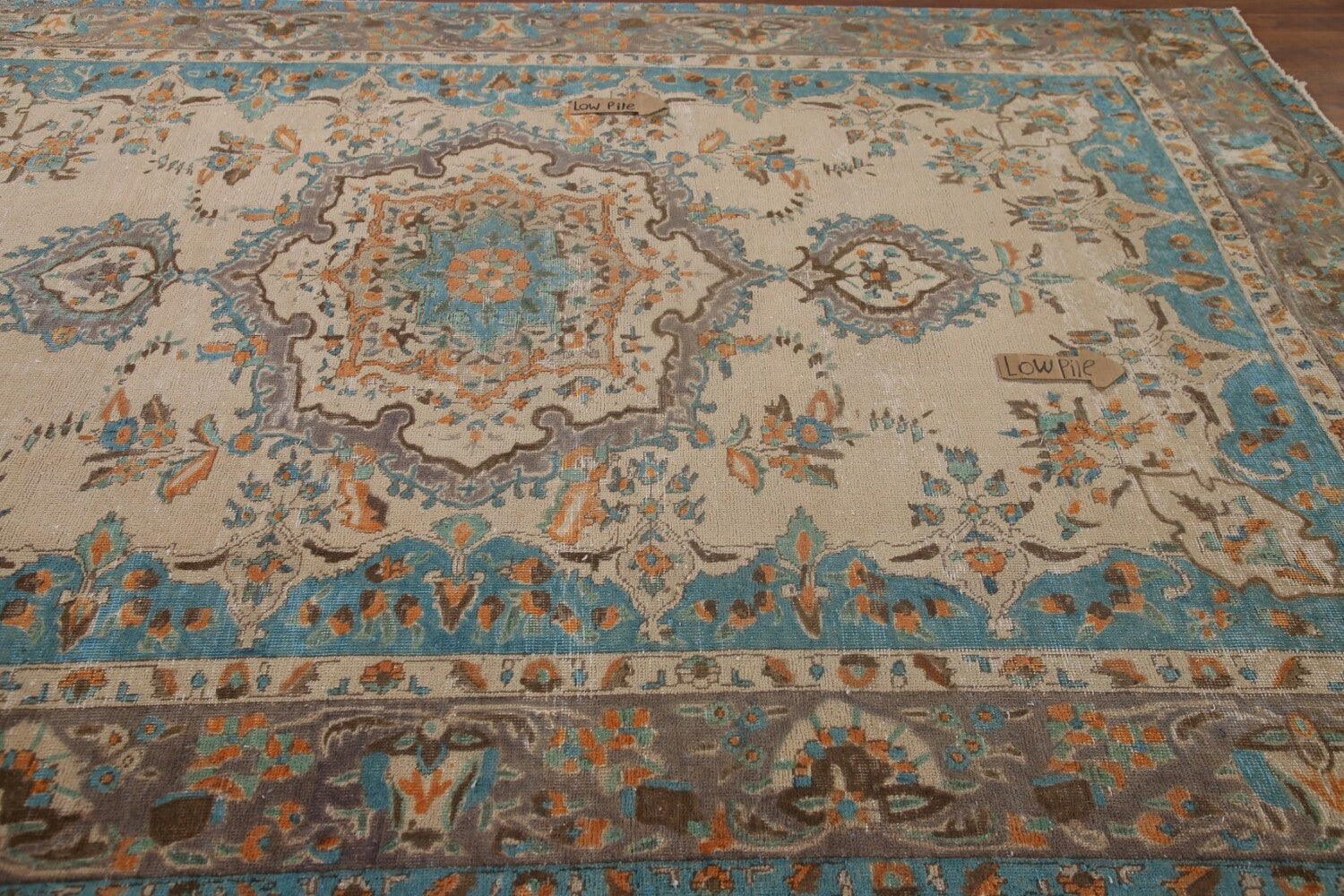 A Beautiful Genuine Persia ( Persia ) Tabriz rug is Hand Knotted by skillful weavers in Persia ( Persia ) with 100% Wool Material. This rug is in Very Good (Low Pile-Repair) condition. dimensions are 9' 8'' X 6' 8'' in foot and 295 X 203 in centimeter. the primary color is Beige & Ivories.