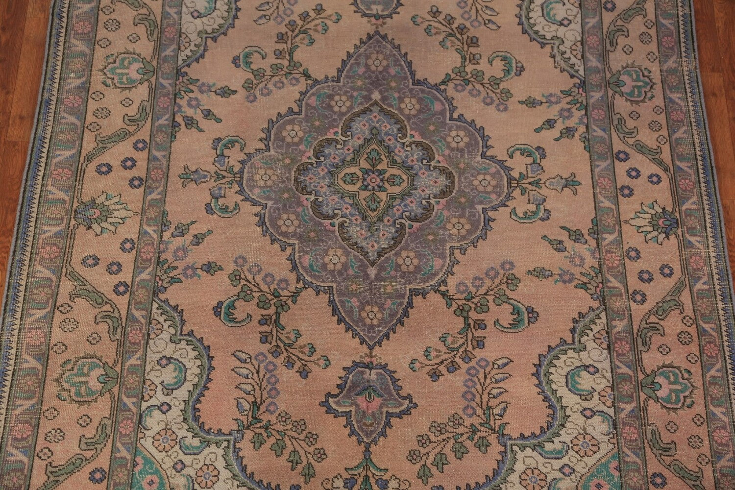 A Beautiful Genuine Persia ( Persia ) Tabriz rug is Hand Knotted by skillful weavers in Persia ( Persia ) with 100% Wool Material. This rug is in Very Good ( Low Pile ) condition. dimensions are 9' 5'' X 6' 7'' in foot and 287 X 201 in centimeter. the primary color is Peach.