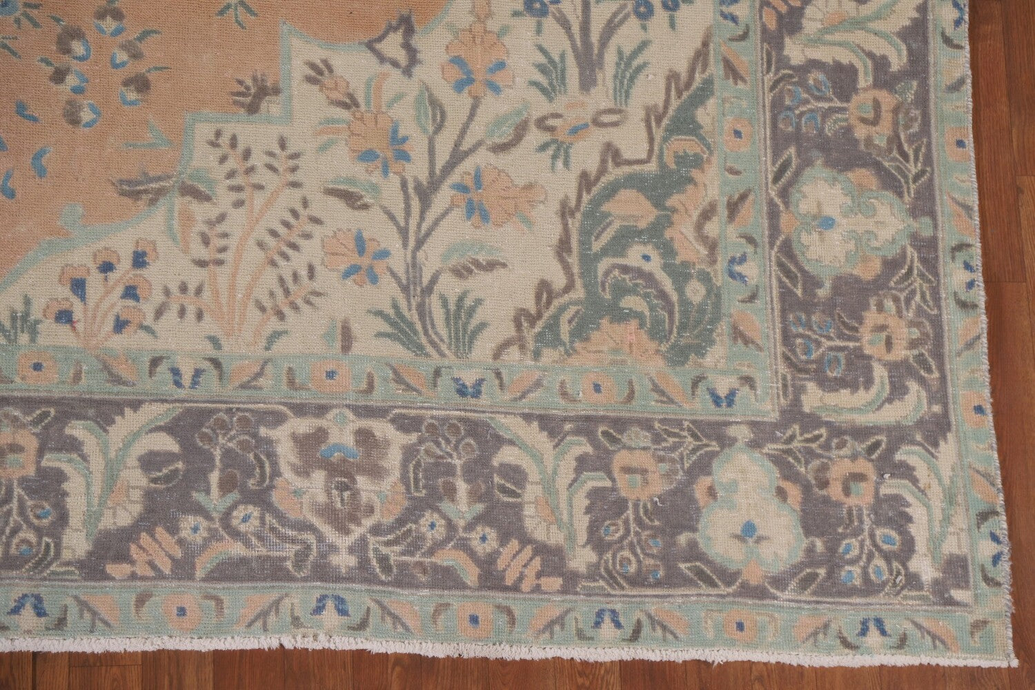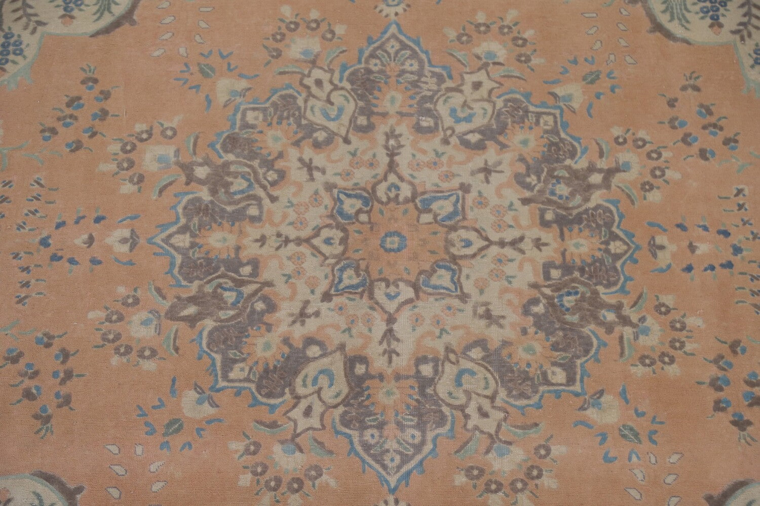 A Beautiful Genuine Persia ( Persia ) Tabriz rug is Hand Knotted by skillful weavers in Persia ( Persia ) with 100% Wool Material. This rug is in Very Good (Evenly Low Pile) condition. dimensions are 13' 1'' X 9' 4'' in foot and 399 X 284 in centimeter. the primary color is Peach.