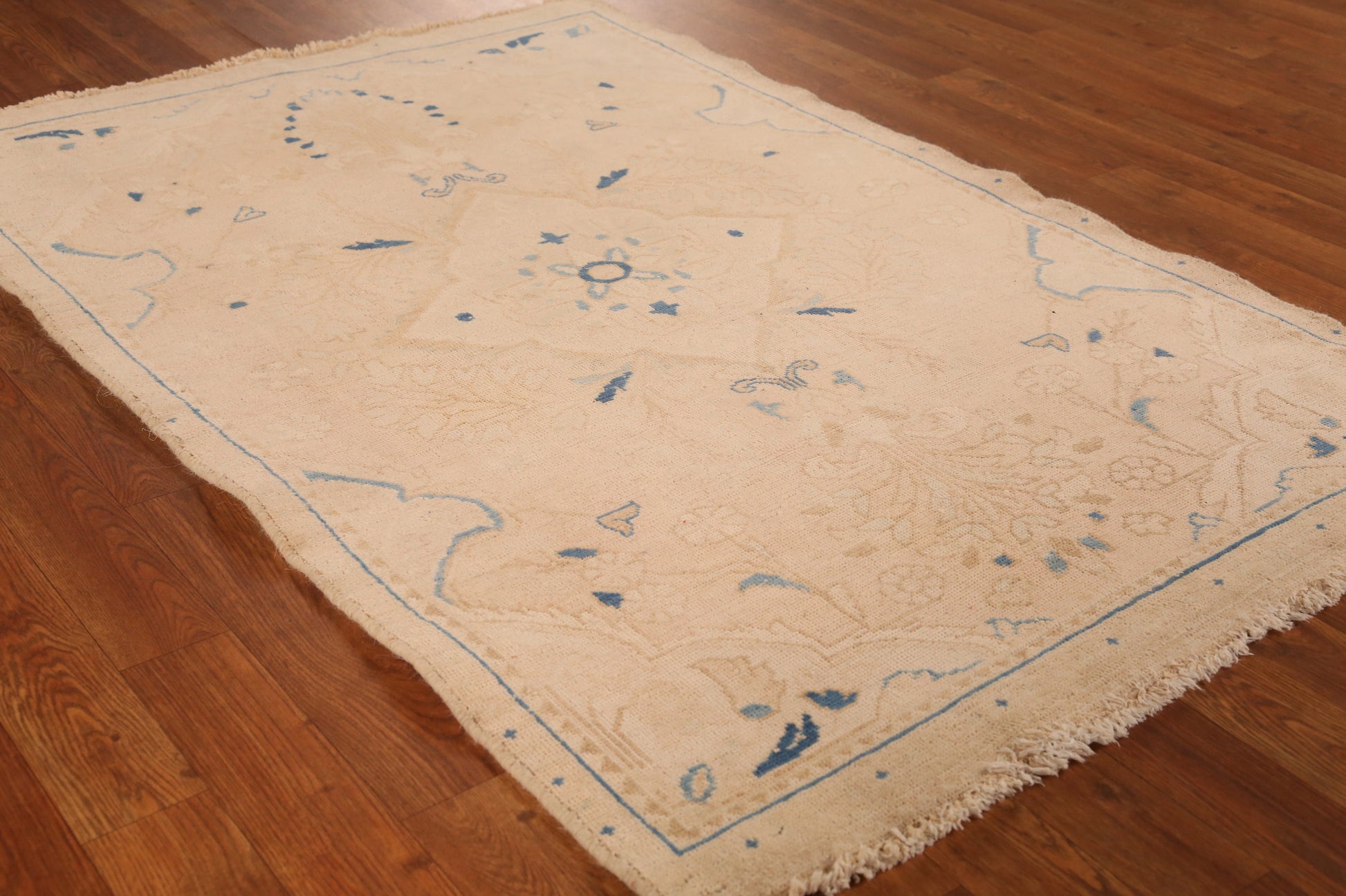 A Beautiful Genuine Persia ( Persia ) Tabriz rug is Hand Knotted by skillful weavers in Persia ( Persia ) with 100% Wool Material. This rug is in Very Good ( Low Pile ) condition. dimensions are 5' 1'' X 3' 4'' in foot and 155 X 102 in centimeter. the primary color is Beige & Ivories.