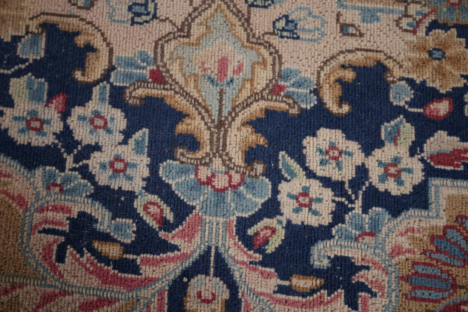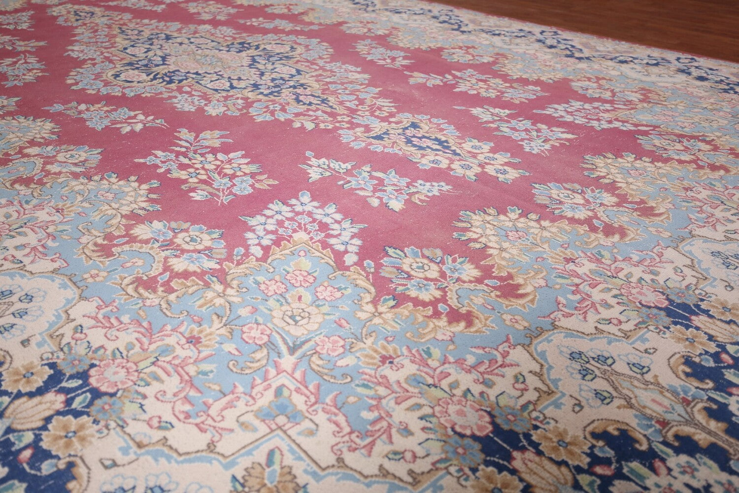 A Beautiful Genuine Persia ( Persia ) Kerman rug is Hand Knotted by skillful weavers in Persia ( Persia ) with 100% Wool Material. This rug is in Very Good (Low Pile-Repair) condition. dimensions are 15' 11'' X 9' 8'' in foot and 485 X 295 in centimeter. the primary color is Pink.