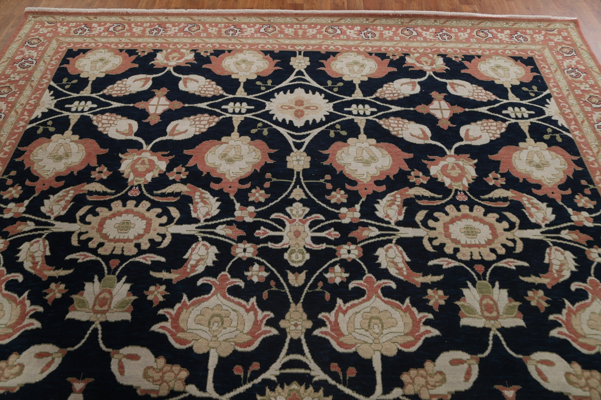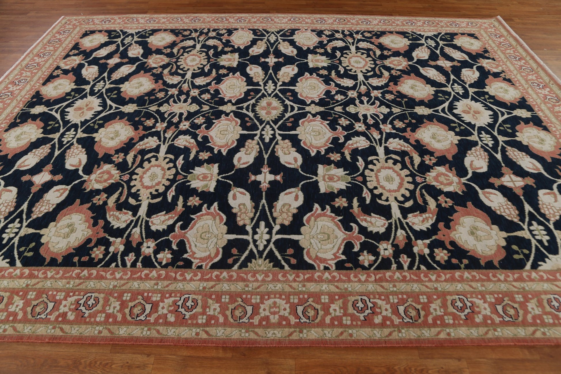 A Beautiful Genuine Turkey Ziegler rug is Hand Knotted by skillful weavers in Turkey with 100% Wool Material. This rug is in New, First Quality condition. dimensions are 11' 9'' X 8' 10'' in foot and 358 X 269 in centimeter. the primary color is Navy Blue & Blues.