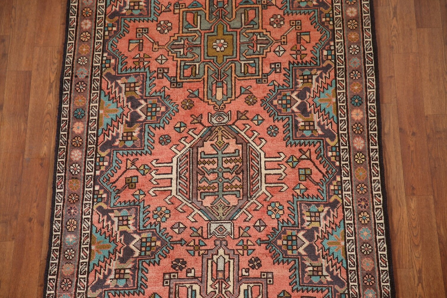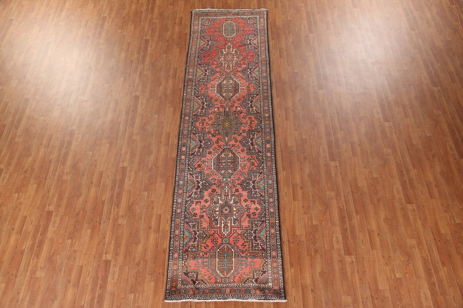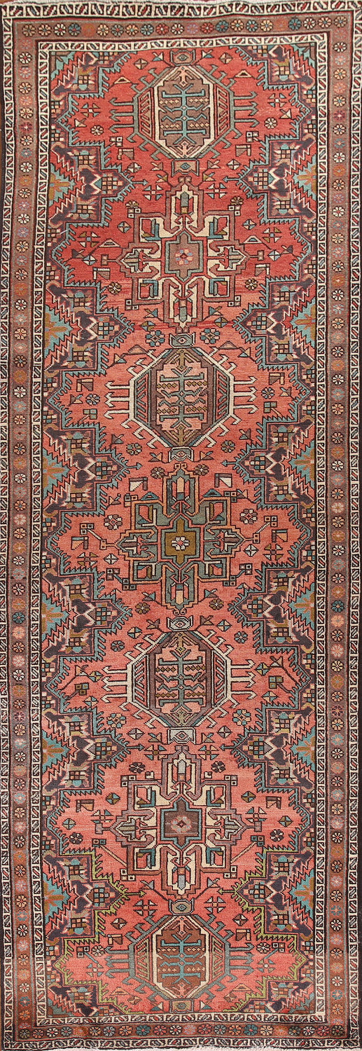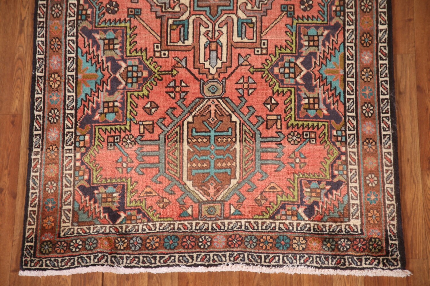 A Beautiful Genuine Persia ( Persia ) Heriz rug is Hand Knotted by skillful weavers in Persia ( Persia ) with 100% Wool Material. This rug is in Very Good condition. dimensions are 12' 11'' X 3' 6'' in foot and 394 X 107 in centimeter. the primary color is Pink.