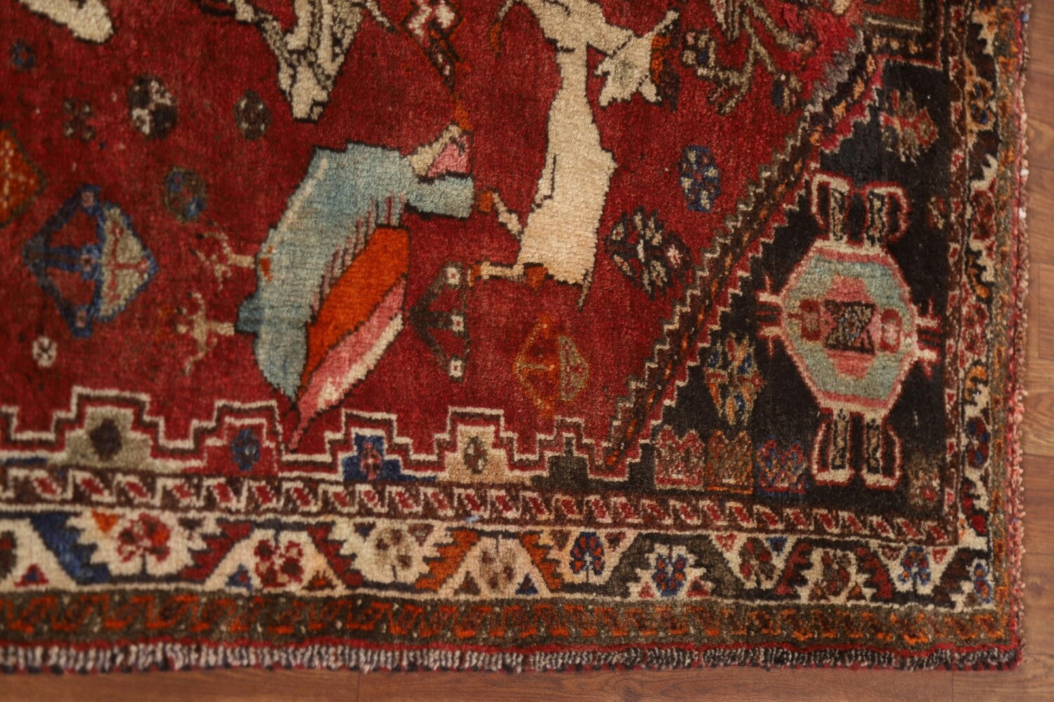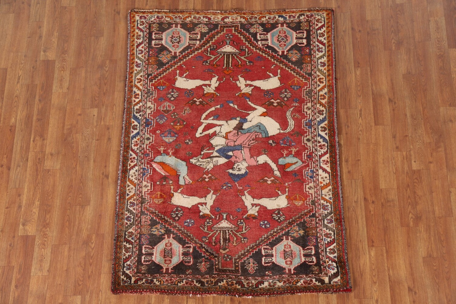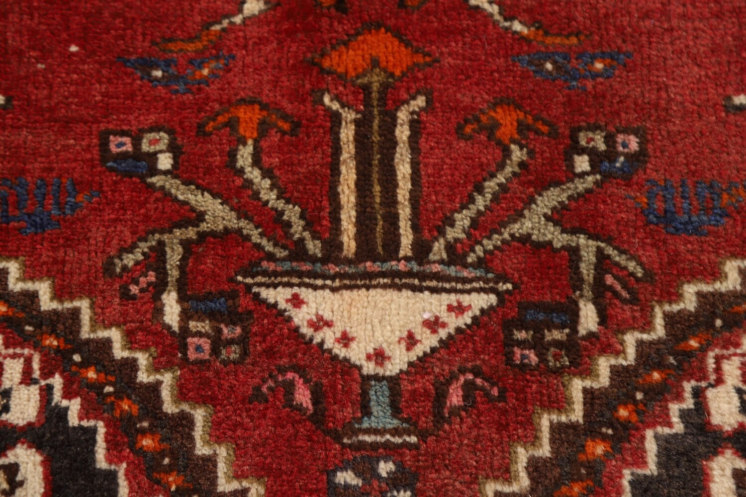 A Beautiful Genuine Persia ( Persia ) Shiraz rug is Hand Knotted by skillful weavers in Persia ( Persia ) with 100% Wool Material. This rug is in Very Good (Abrash) condition. dimensions are 5' 3'' X 3' 9'' in foot and 160 X 114 in centimeter. the primary color is Red.