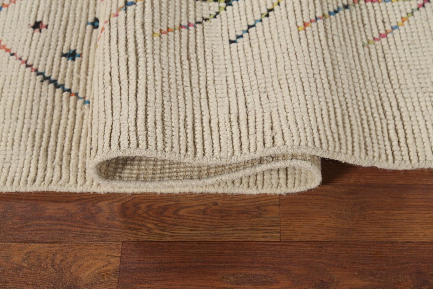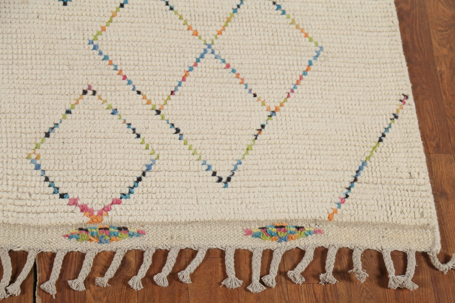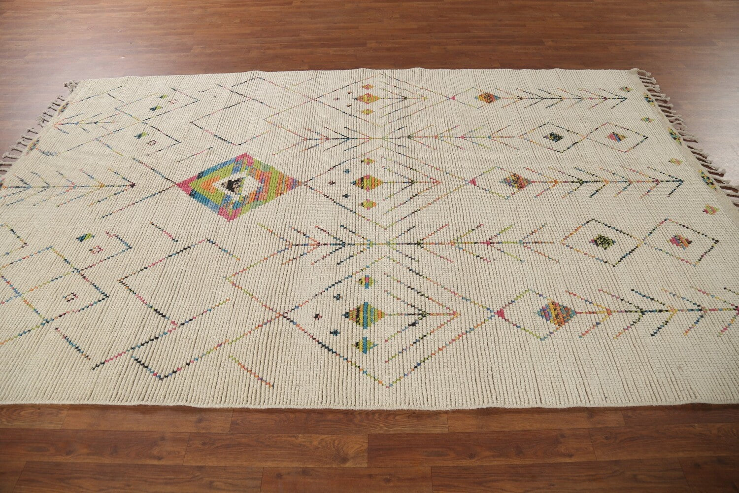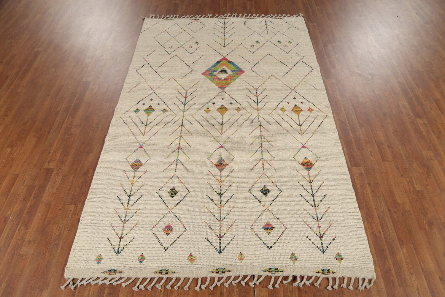 A Beautiful Genuine Pakistan Moroccan rug is Hand Knotted by skillful weavers in Pakistan with 100% Wool Material. This rug is in New, First Quality condition. dimensions are 9' 6'' X 5' 11'' in foot and 290 X 180 in centimeter. the primary color is Beige & Ivories.