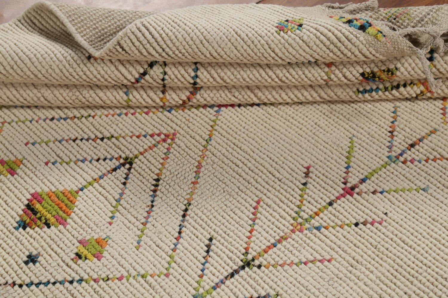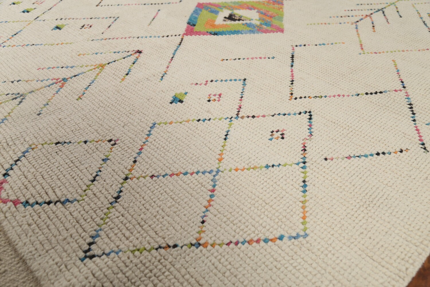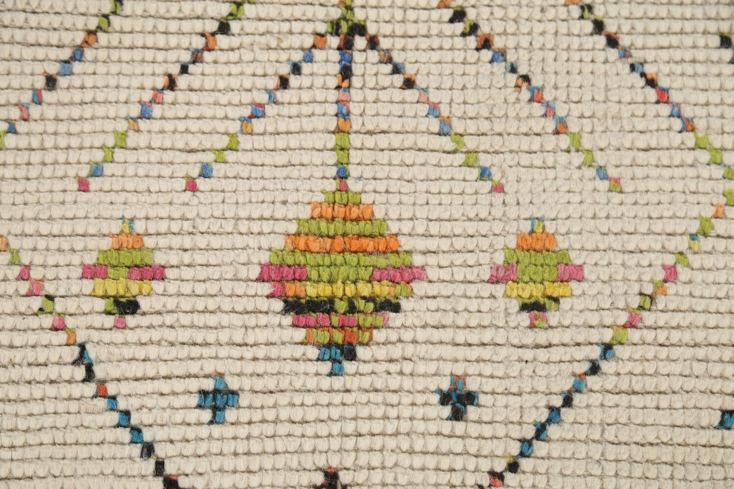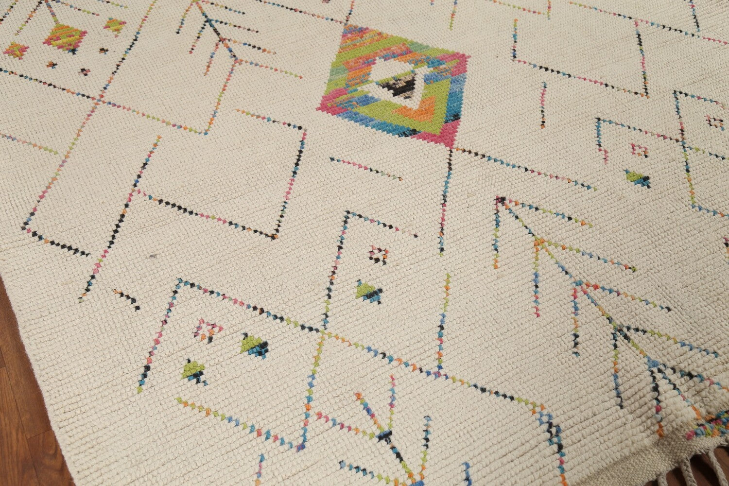 A Beautiful Genuine Pakistan Moroccan rug is Hand Knotted by skillful weavers in Pakistan with 100% Wool Material. This rug is in New, First Quality condition. dimensions are 9' 6'' X 5' 11'' in foot and 290 X 180 in centimeter. the primary color is Beige & Ivories.