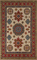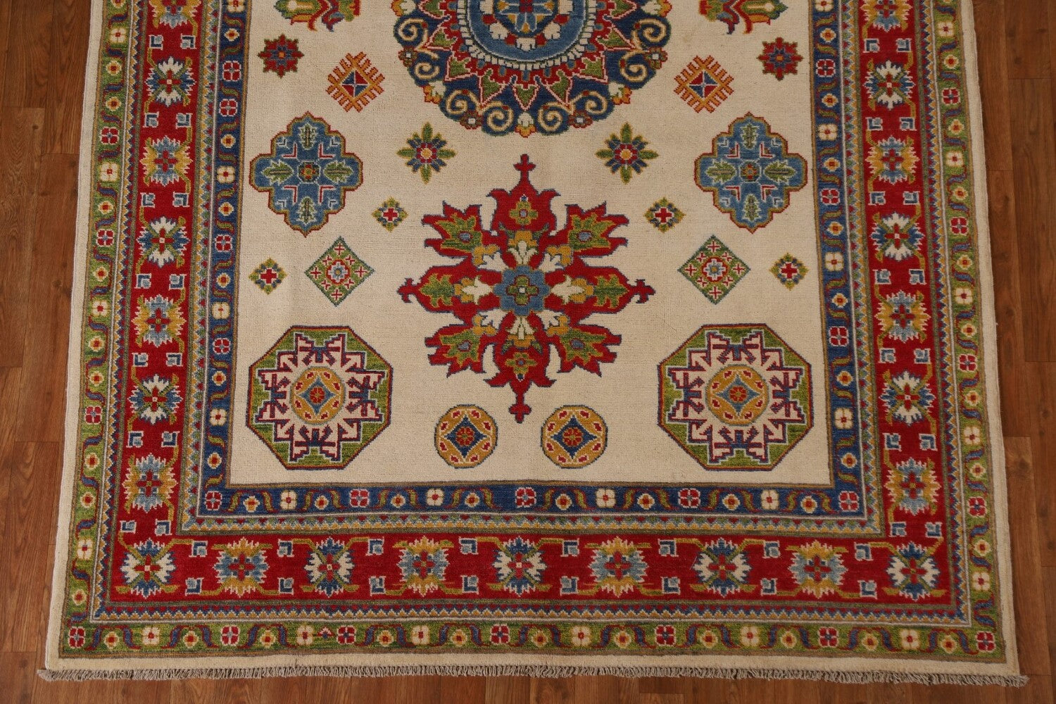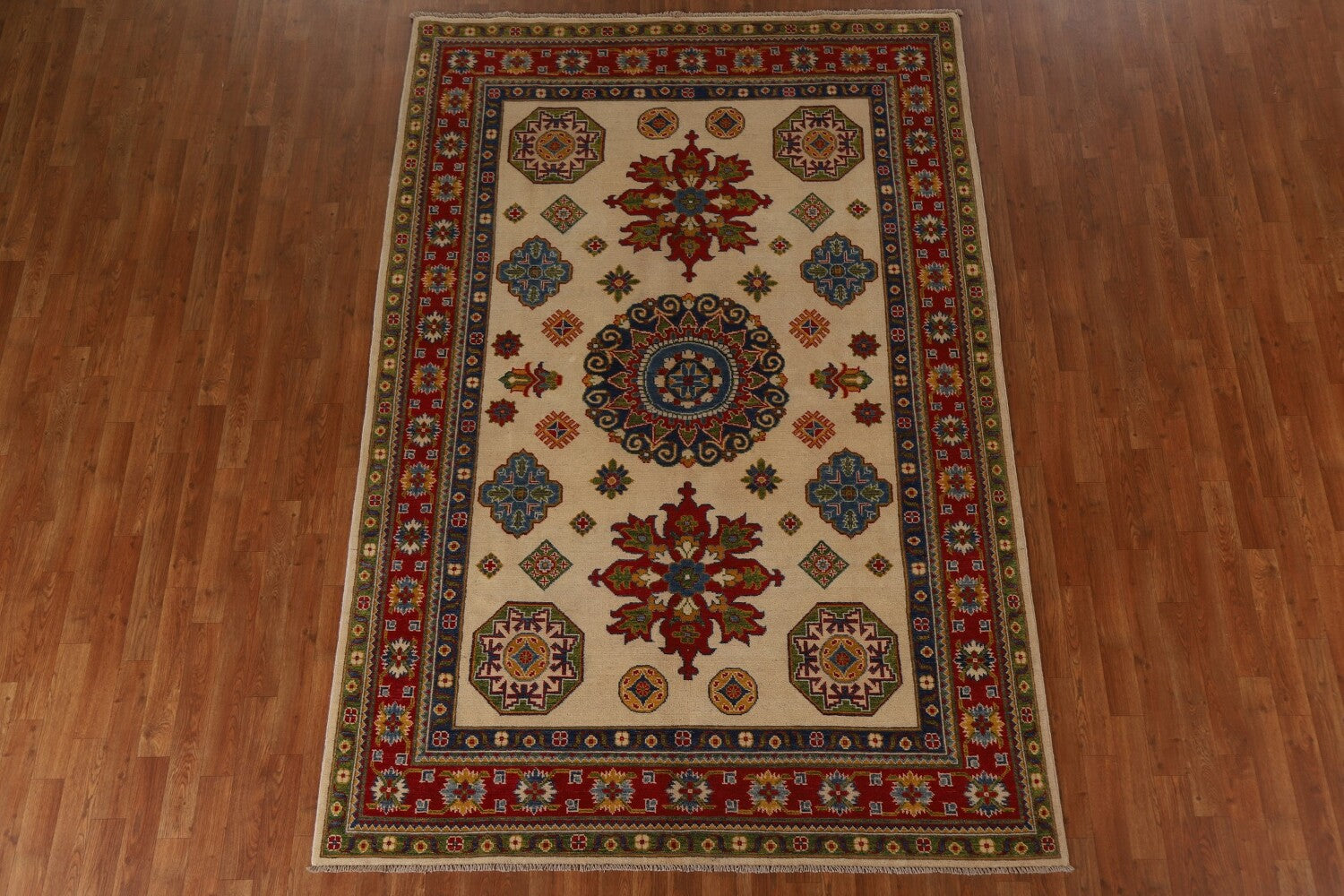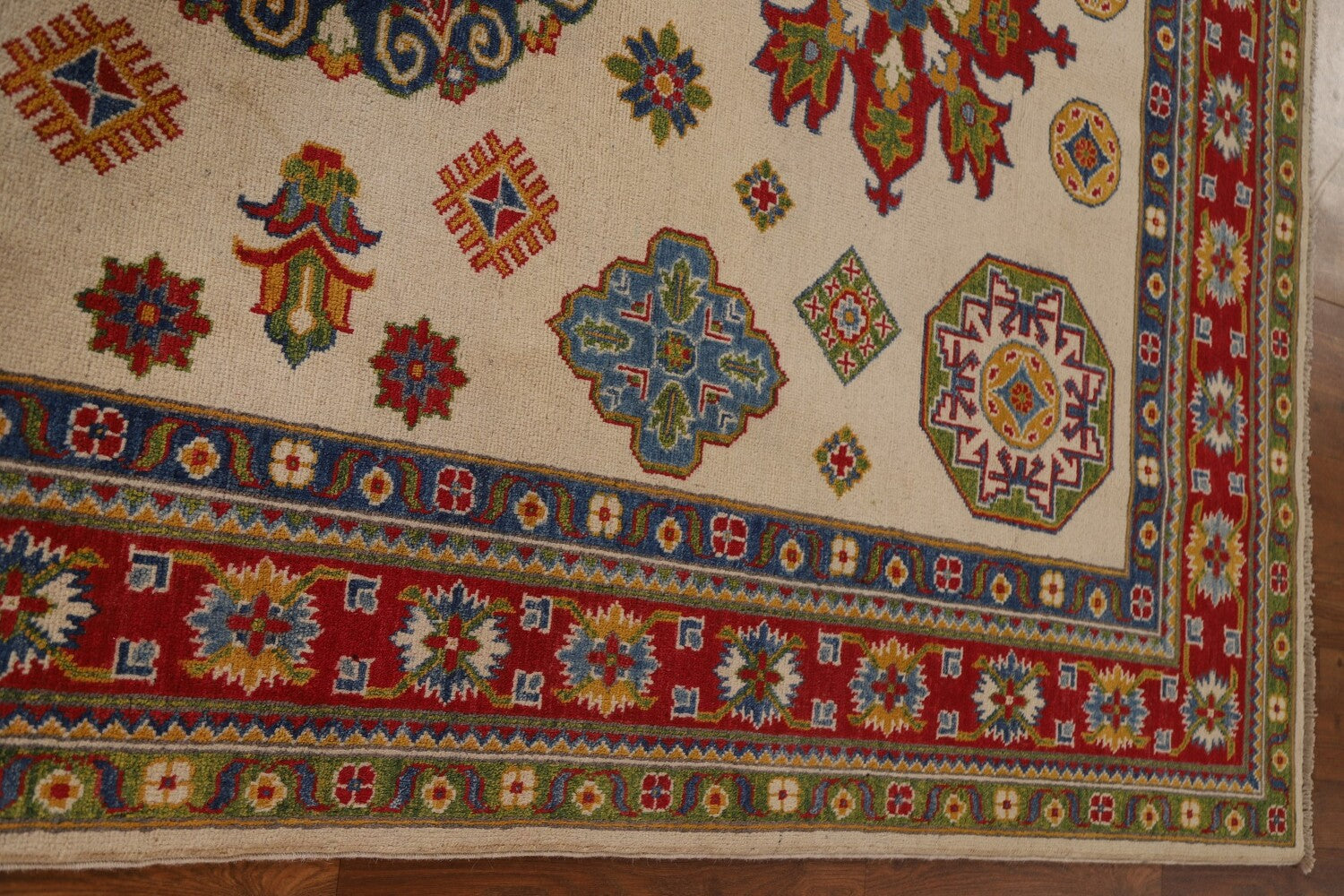 A Beautiful Genuine Pakistan Kazak rug is Hand Knotted by skillful weavers in Pakistan with 100% Wool Material. This rug is in New, First Quality condition. dimensions are 8' 10'' X 6' 0'' in foot and 269 X 183 in centimeter. the primary color is Beige & Ivories.