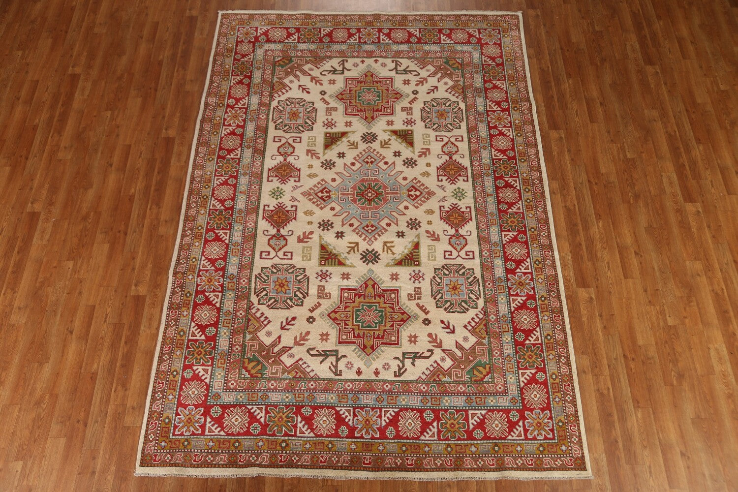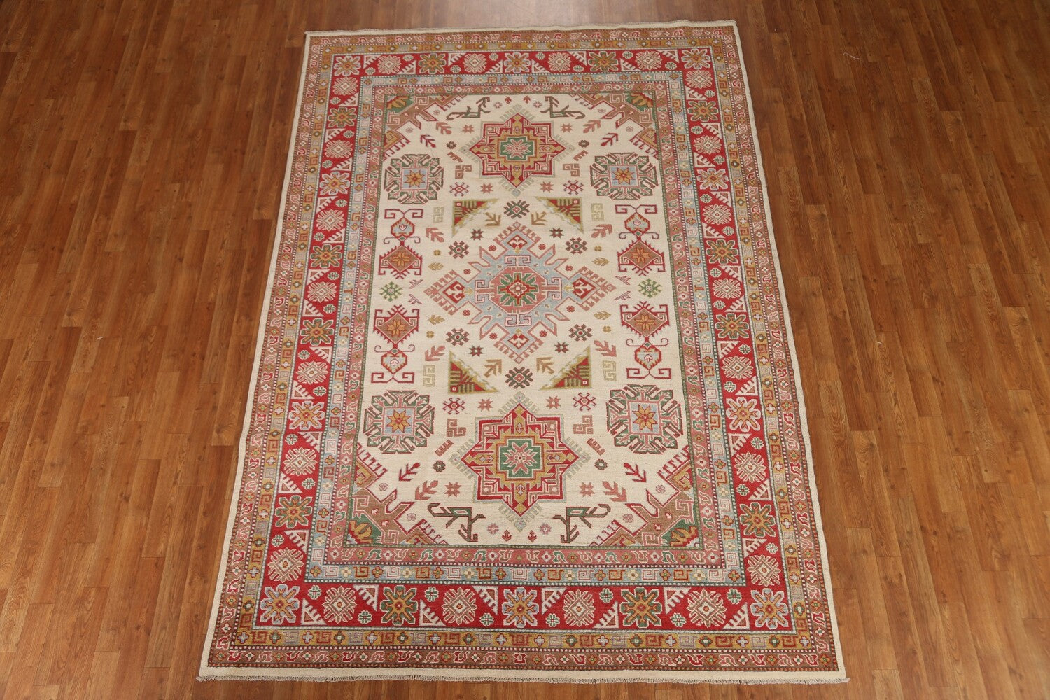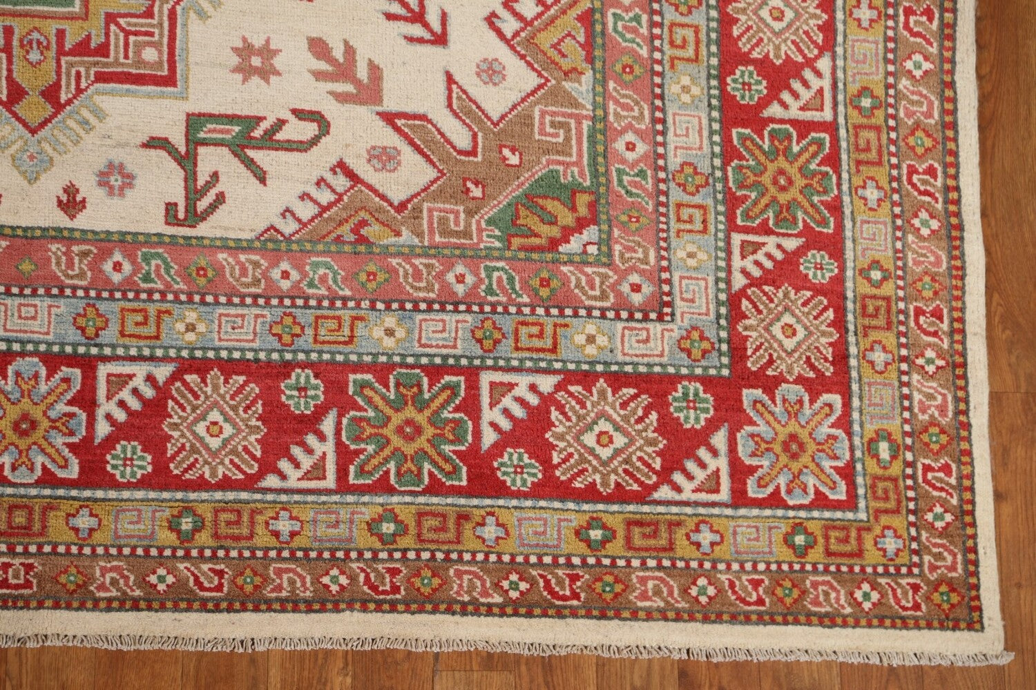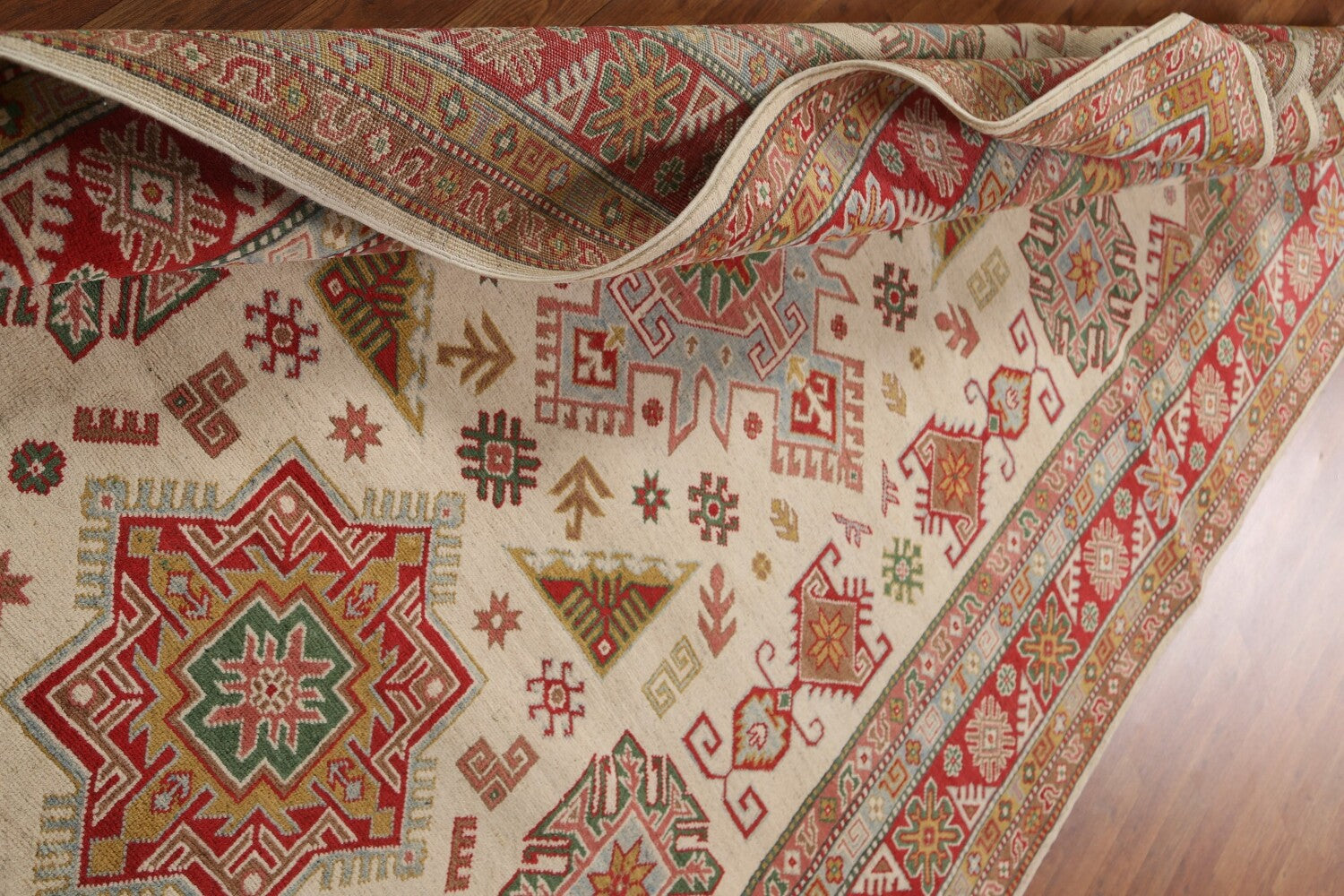 A Beautiful Genuine Pakistan Kazak rug is Hand Knotted by skillful weavers in Pakistan with 100% Wool Material. This rug is in condition. dimensions are 9' 7'' X 6' 7'' in foot and 292 X 201 in centimeter. the primary color is Beige & Ivories.