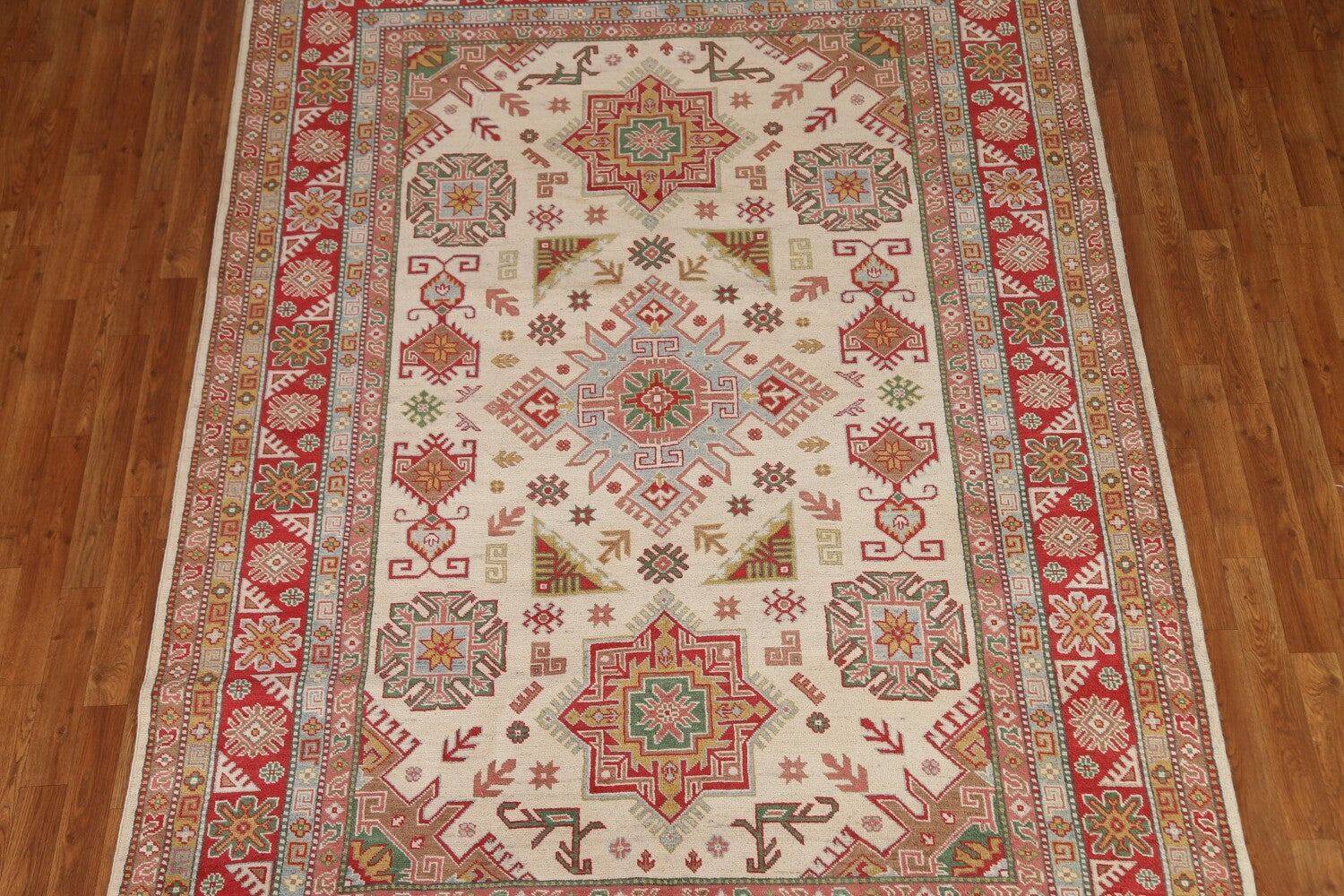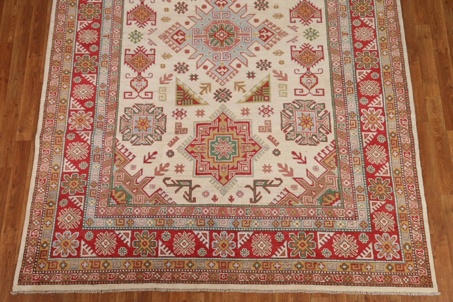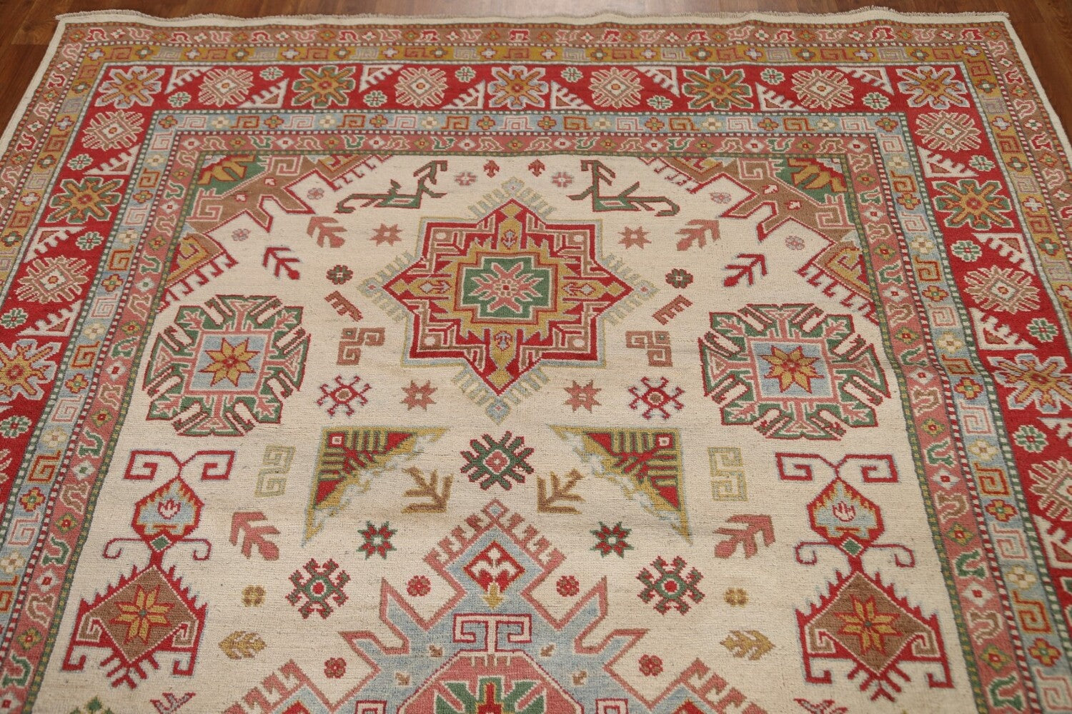 A Beautiful Genuine Pakistan Kazak rug is Hand Knotted by skillful weavers in Pakistan with 100% Wool Material. This rug is in condition. dimensions are 9' 7'' X 6' 7'' in foot and 292 X 201 in centimeter. the primary color is Beige & Ivories.
