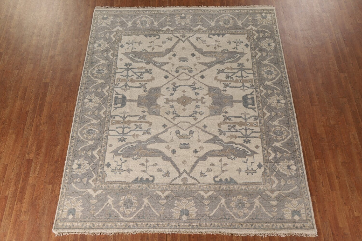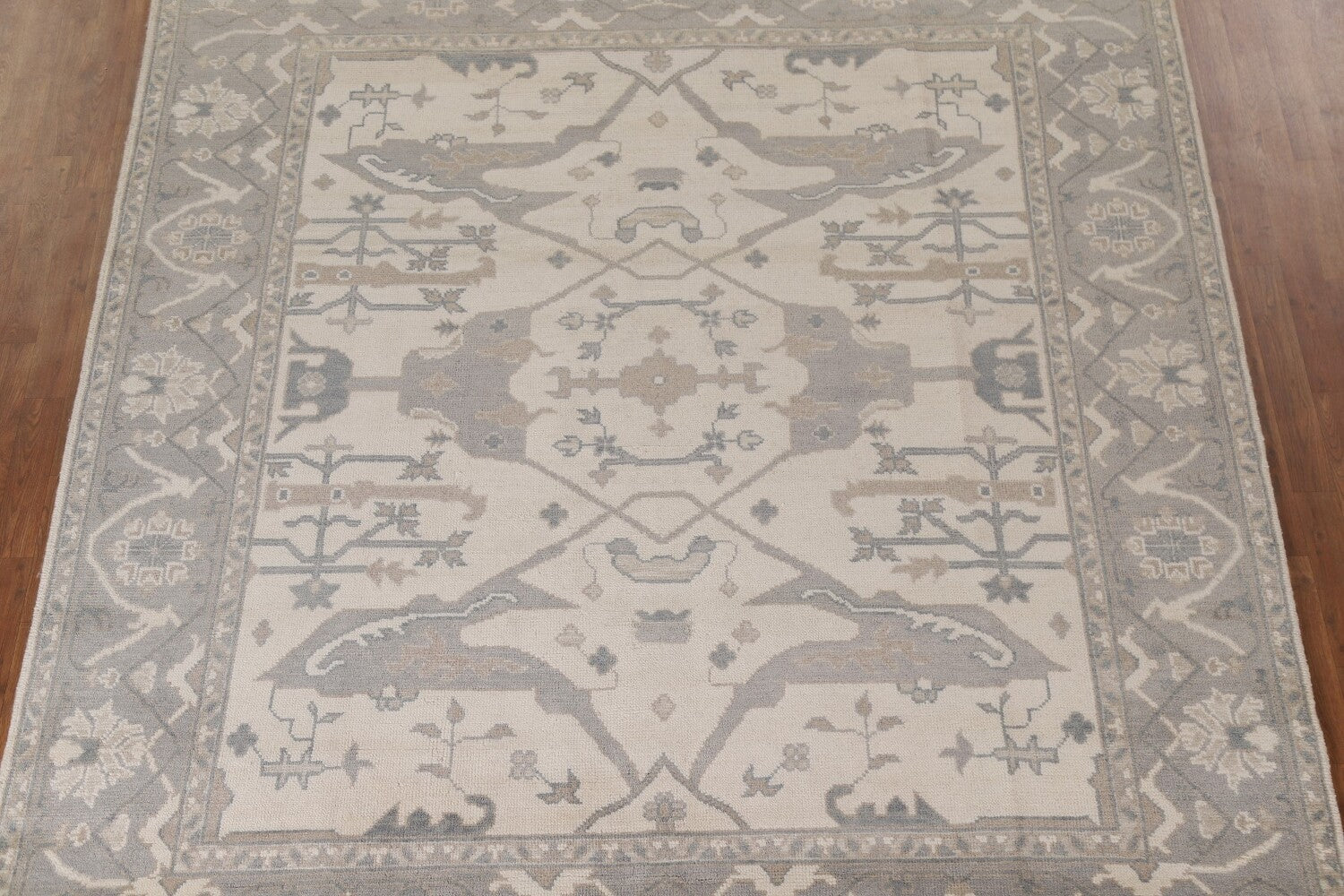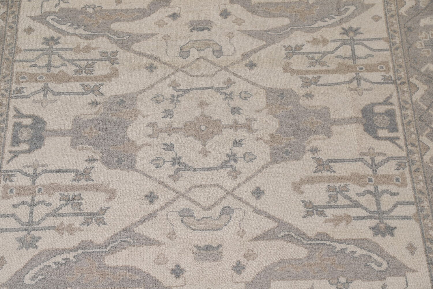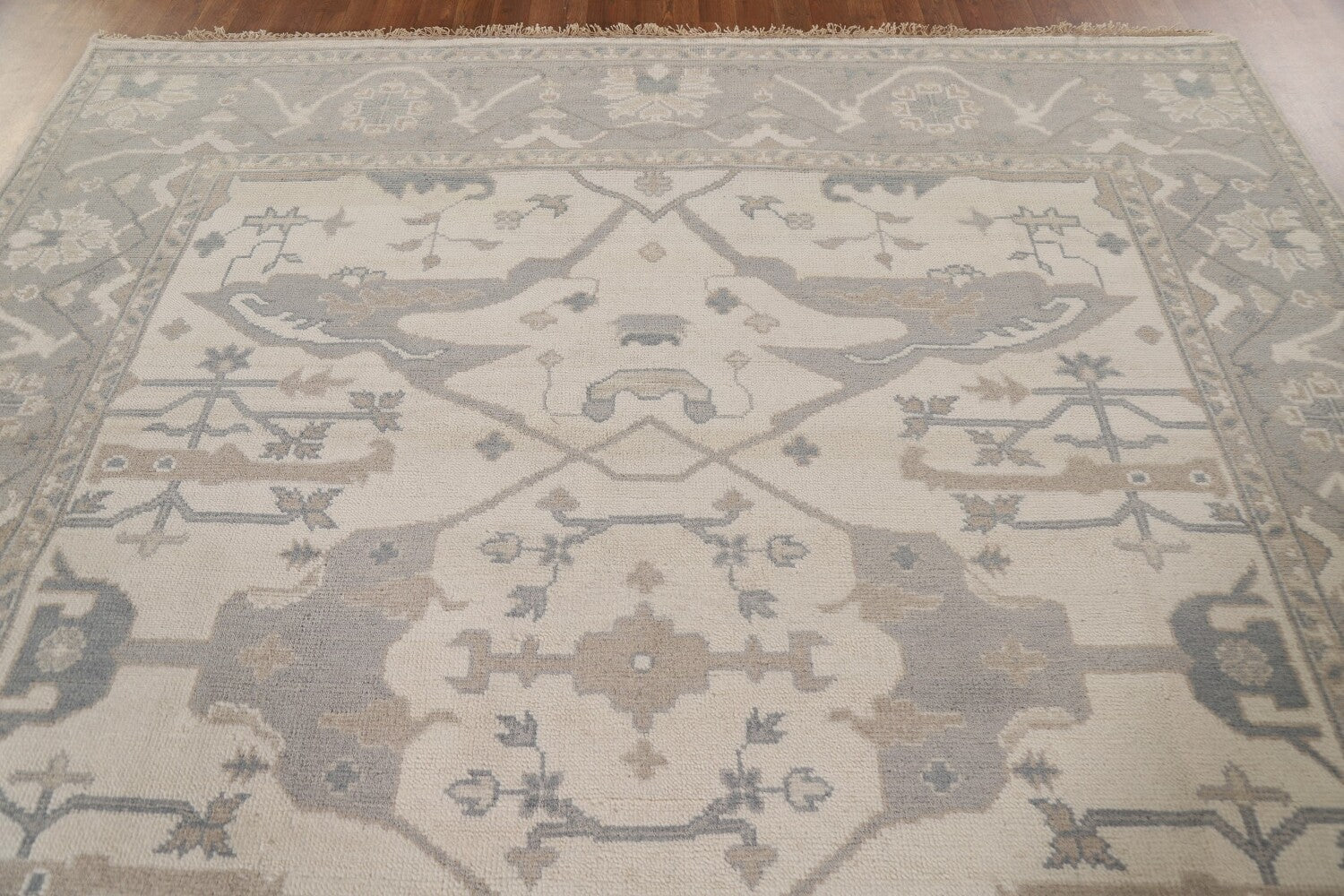 A Beautiful Genuine India Oushak rug is Hand Knotted by skillful weavers in India with 100% Wool Material. This rug is in New, First Quality condition. dimensions are 9' 10'' X 8' 2'' in foot and 300 X 249 in centimeter. the primary color is Beige & Ivories.