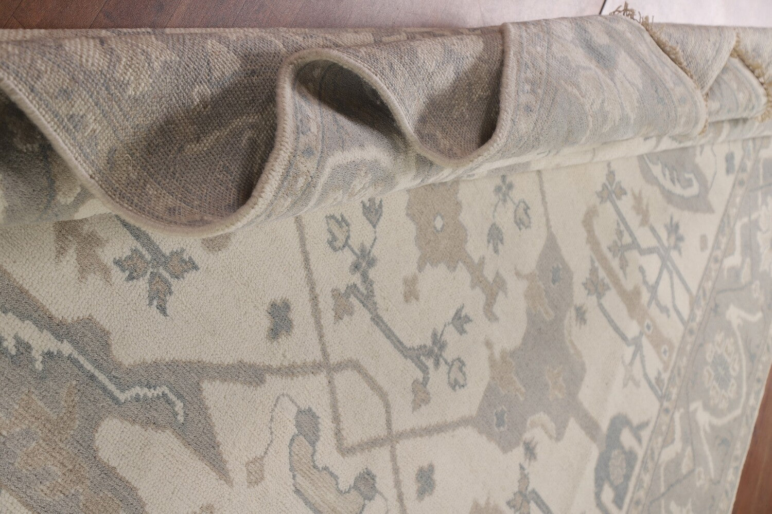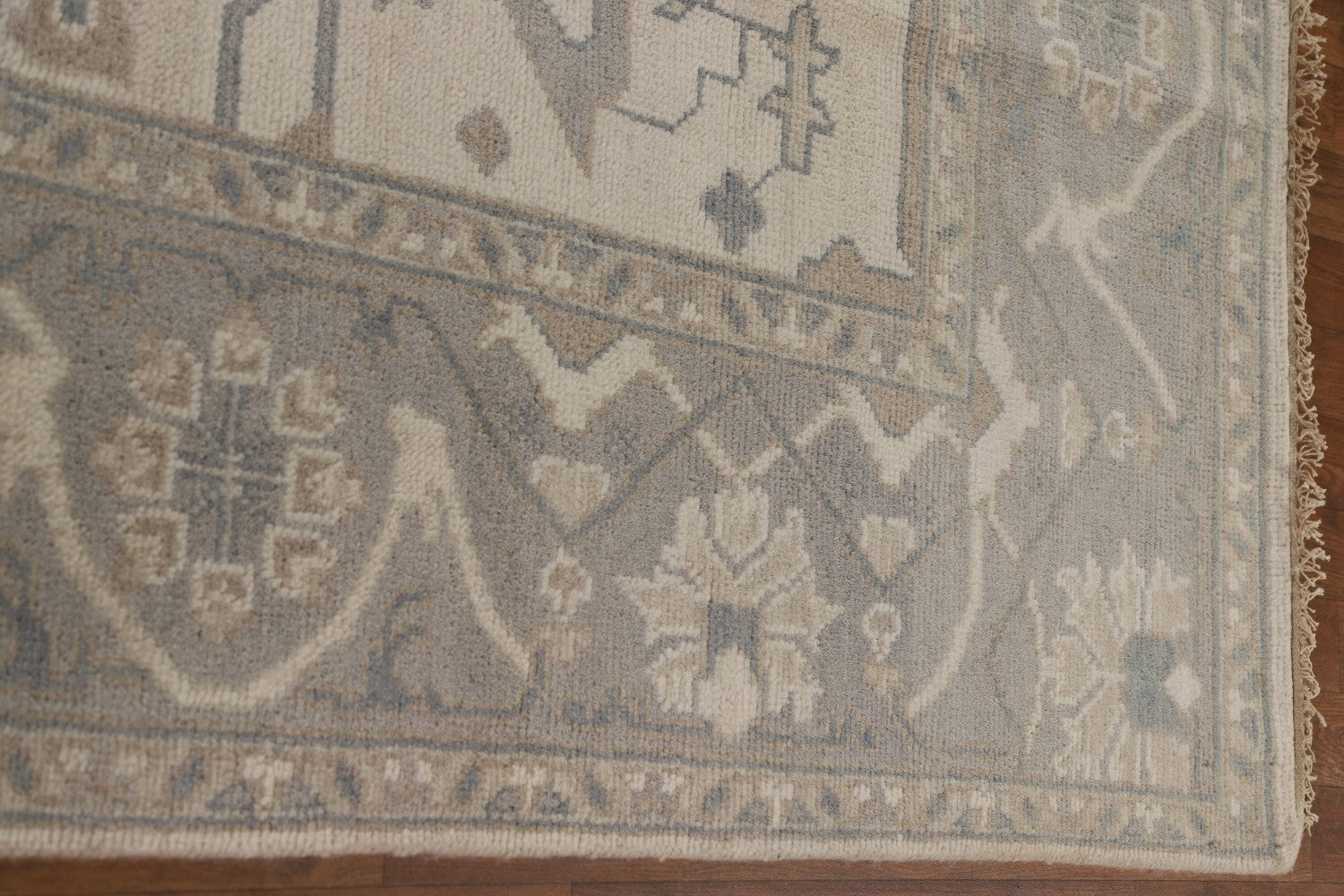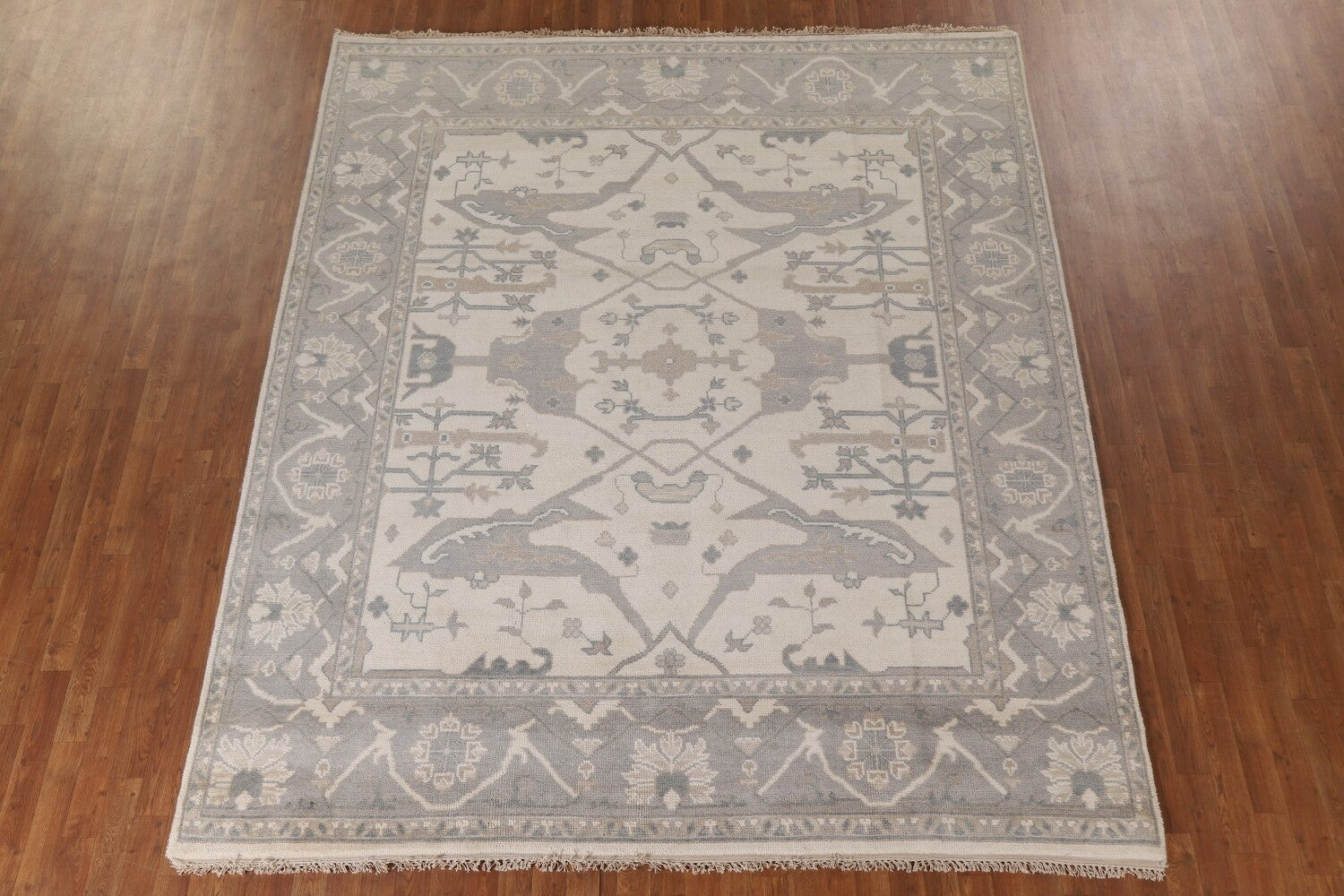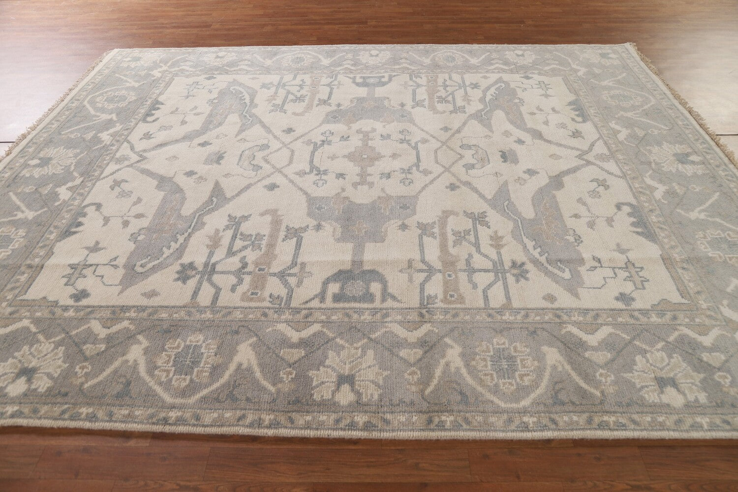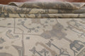 A Beautiful Genuine India Oushak rug is Hand Knotted by skillful weavers in India with 100% Wool Material. This rug is in New, First Quality condition. dimensions are 9' 10'' X 8' 2'' in foot and 300 X 249 in centimeter. the primary color is Beige & Ivories.