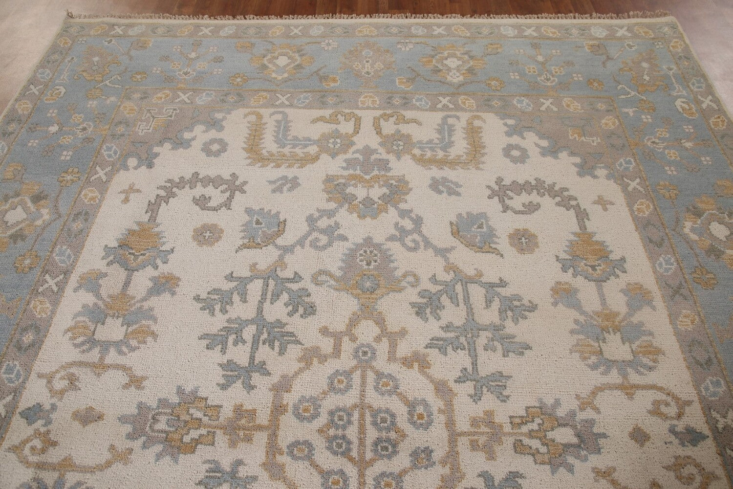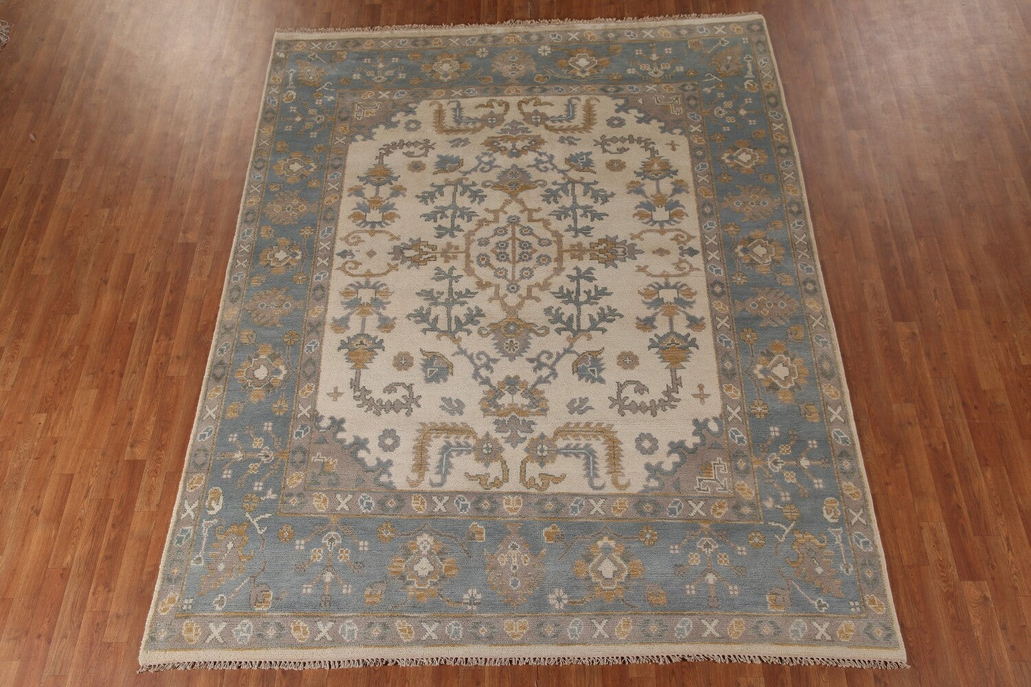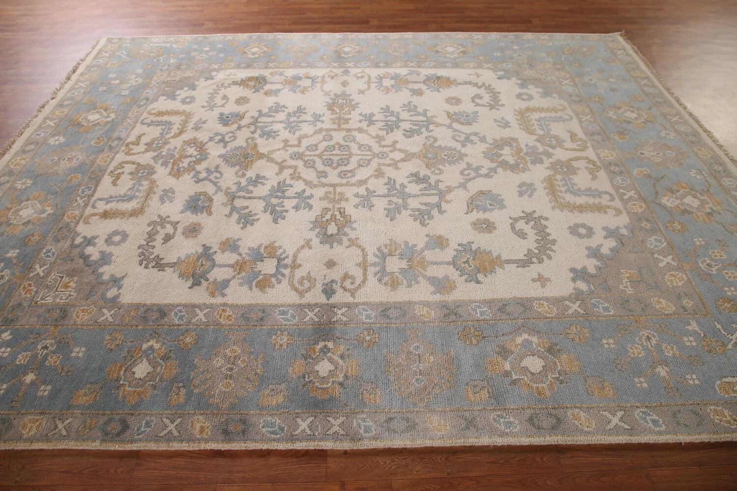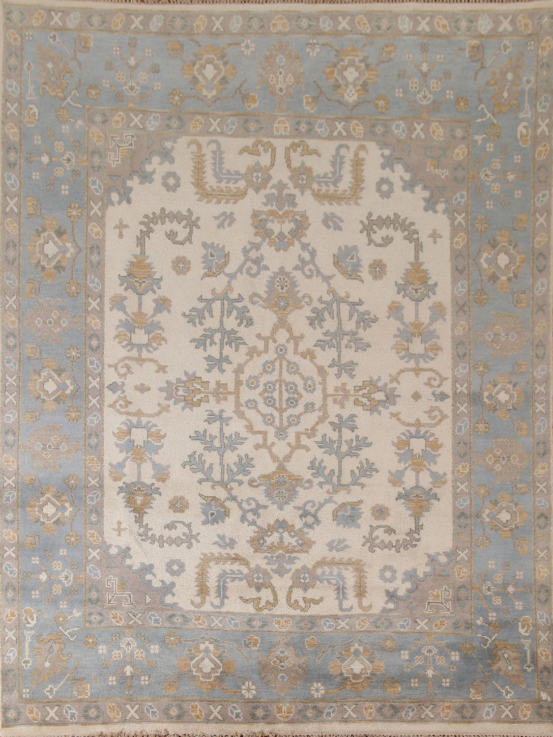 A Beautiful Genuine India Oushak rug is Hand Knotted by skillful weavers in India with 100% Wool Material. This rug is in New, First Quality condition. dimensions are 9' 9'' X 7' 11'' in foot and 297 X 241 in centimeter. the primary color is Beige & Ivories.