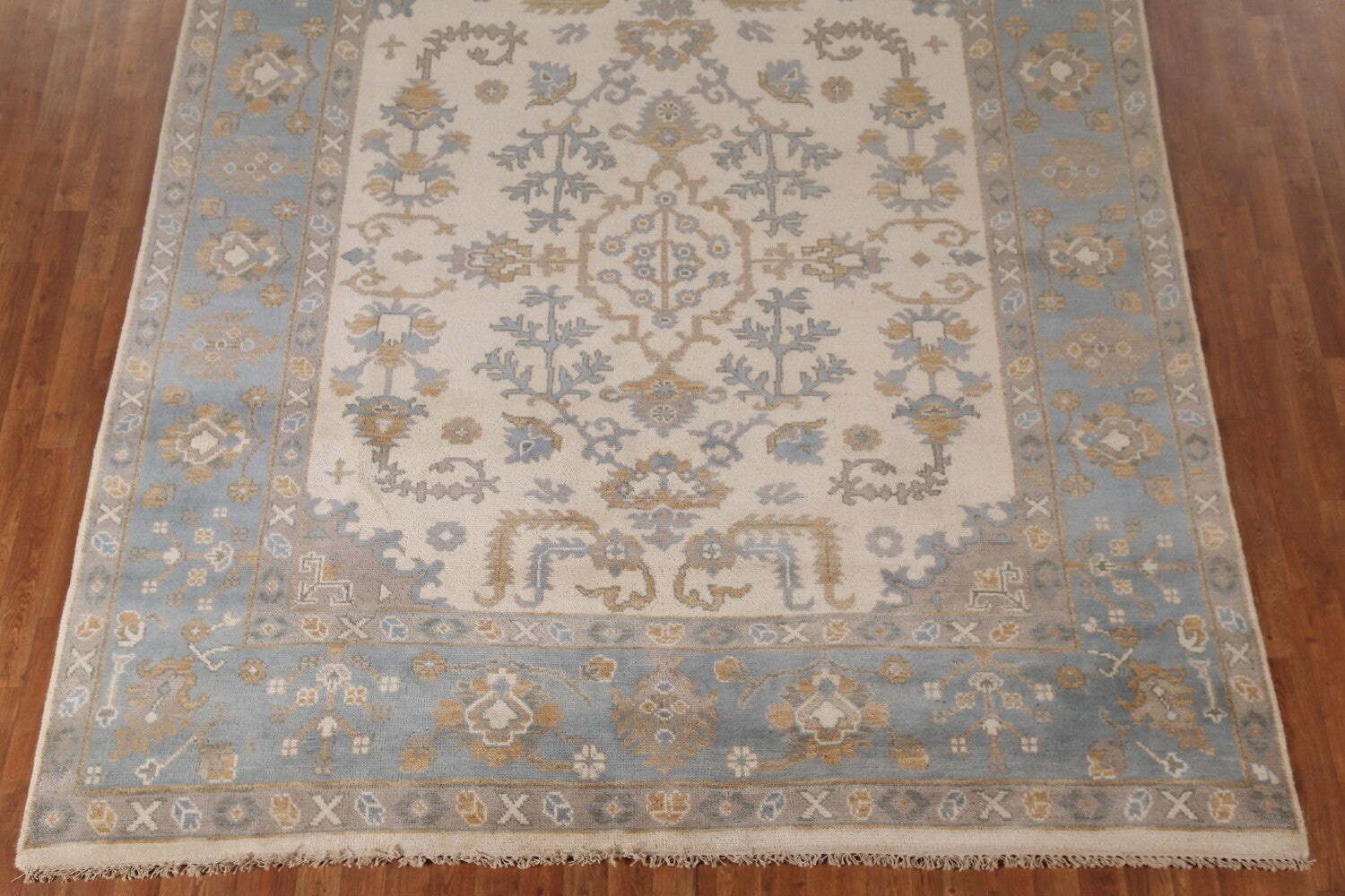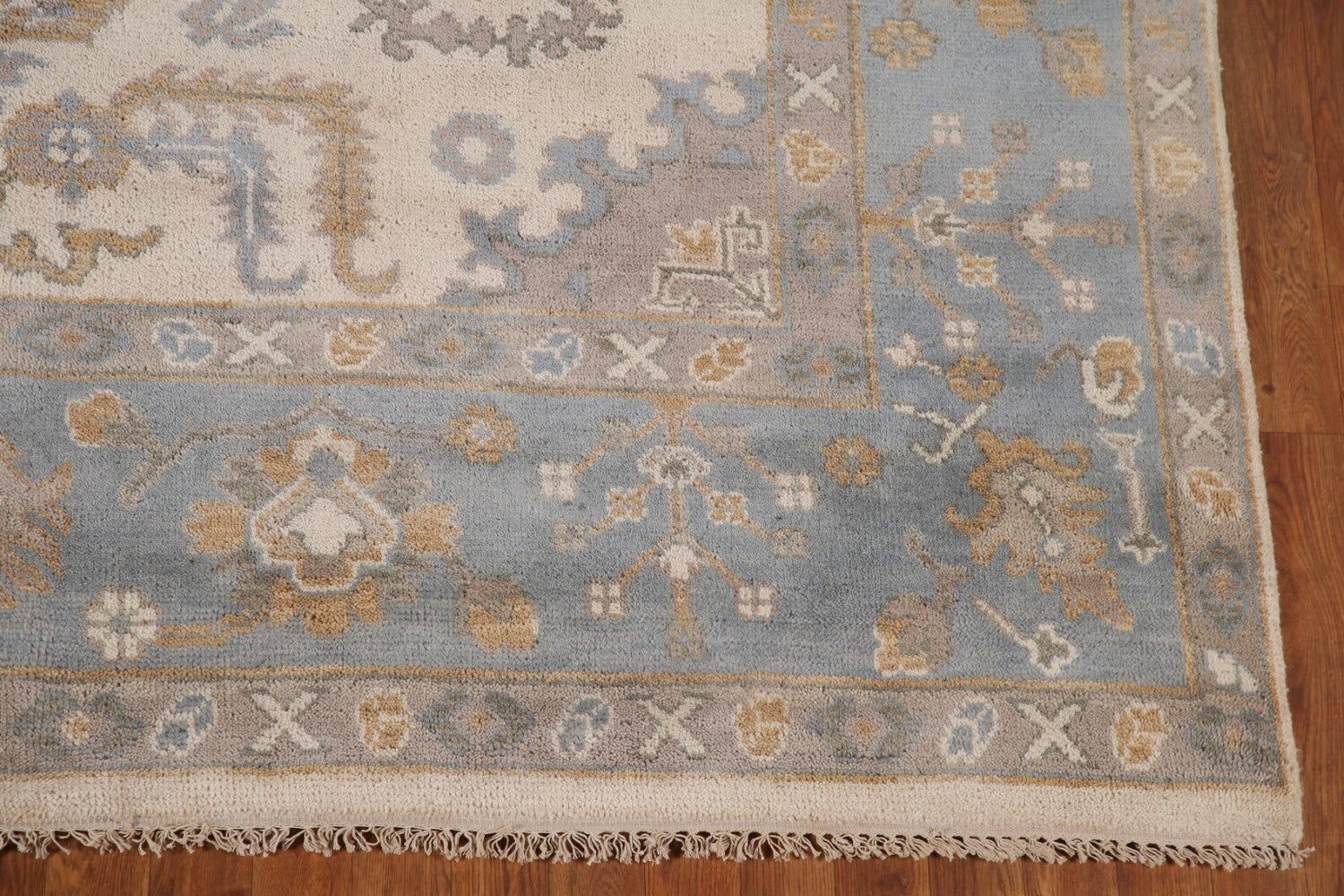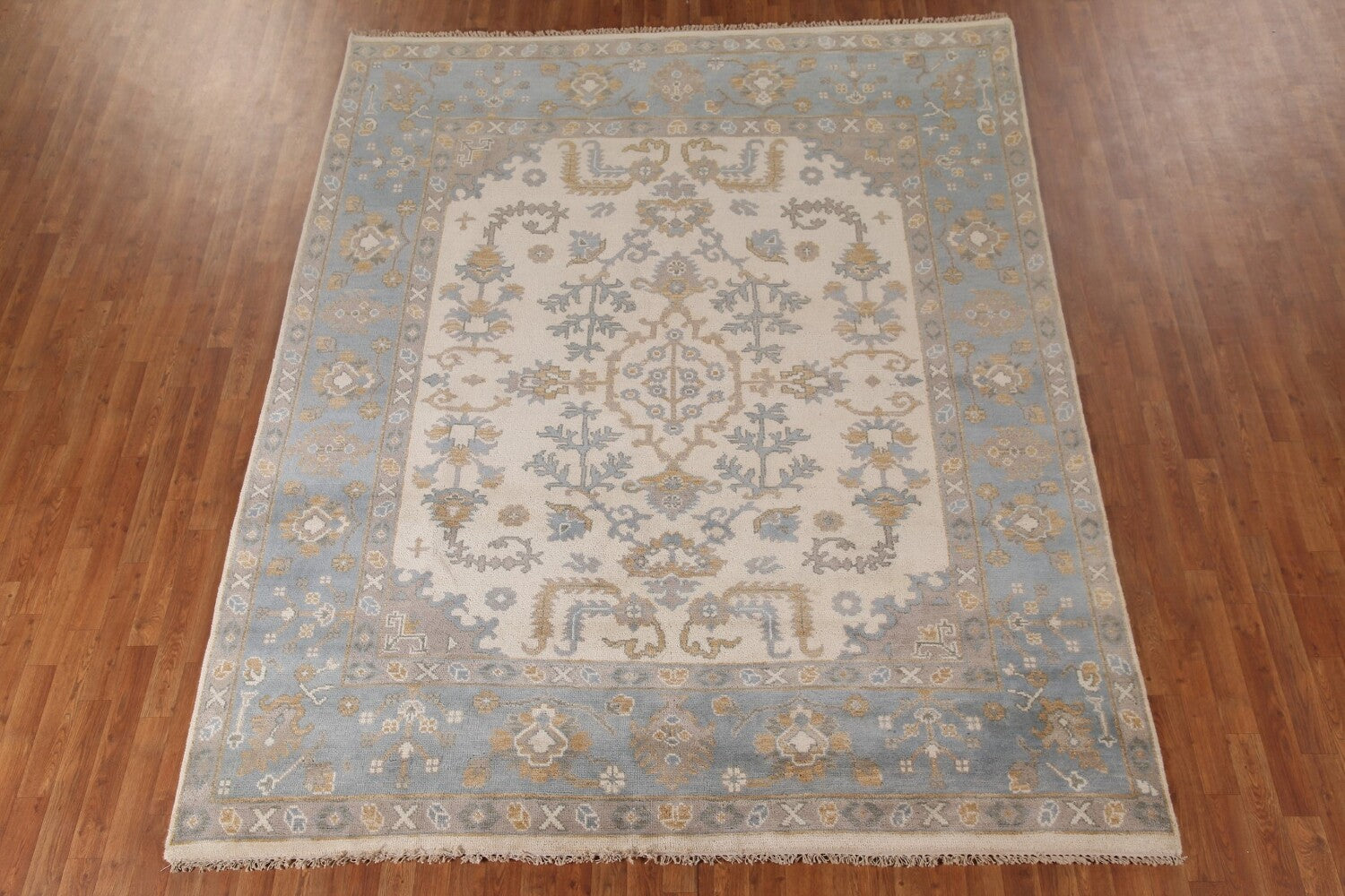 A Beautiful Genuine India Oushak rug is Hand Knotted by skillful weavers in India with 100% Wool Material. This rug is in New, First Quality condition. dimensions are 9' 9'' X 7' 11'' in foot and 297 X 241 in centimeter. the primary color is Beige & Ivories.