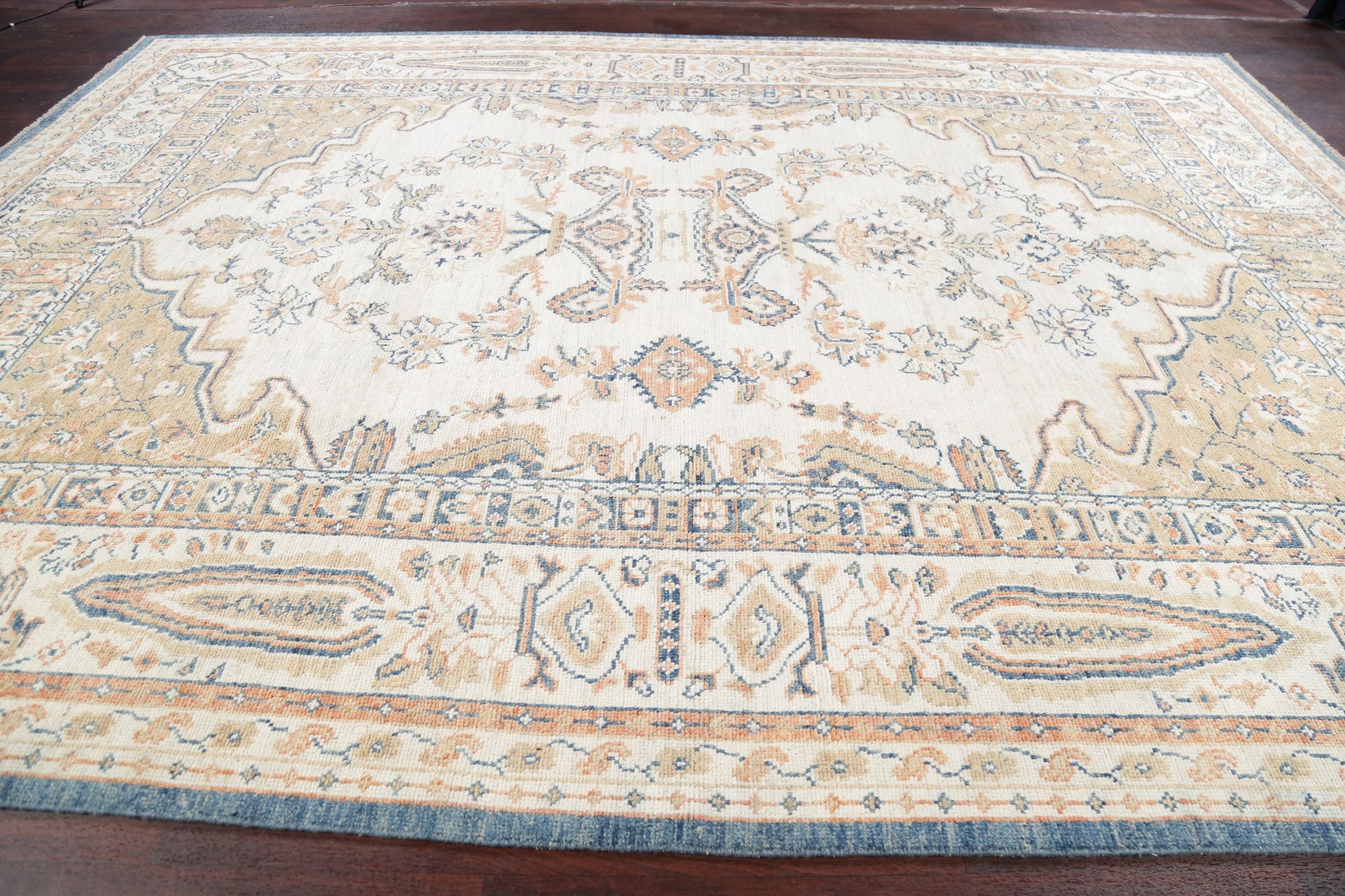 A Beautiful Genuine Turkey Oushak rug is Hand Knotted by skillful weavers in Turkey with 100% Wool Material. This rug is in New, First Quality condition. dimensions are 12' 7'' X 9' 2'' in foot and 384 X 279 in centimeter. the primary color is Beige & Ivories.