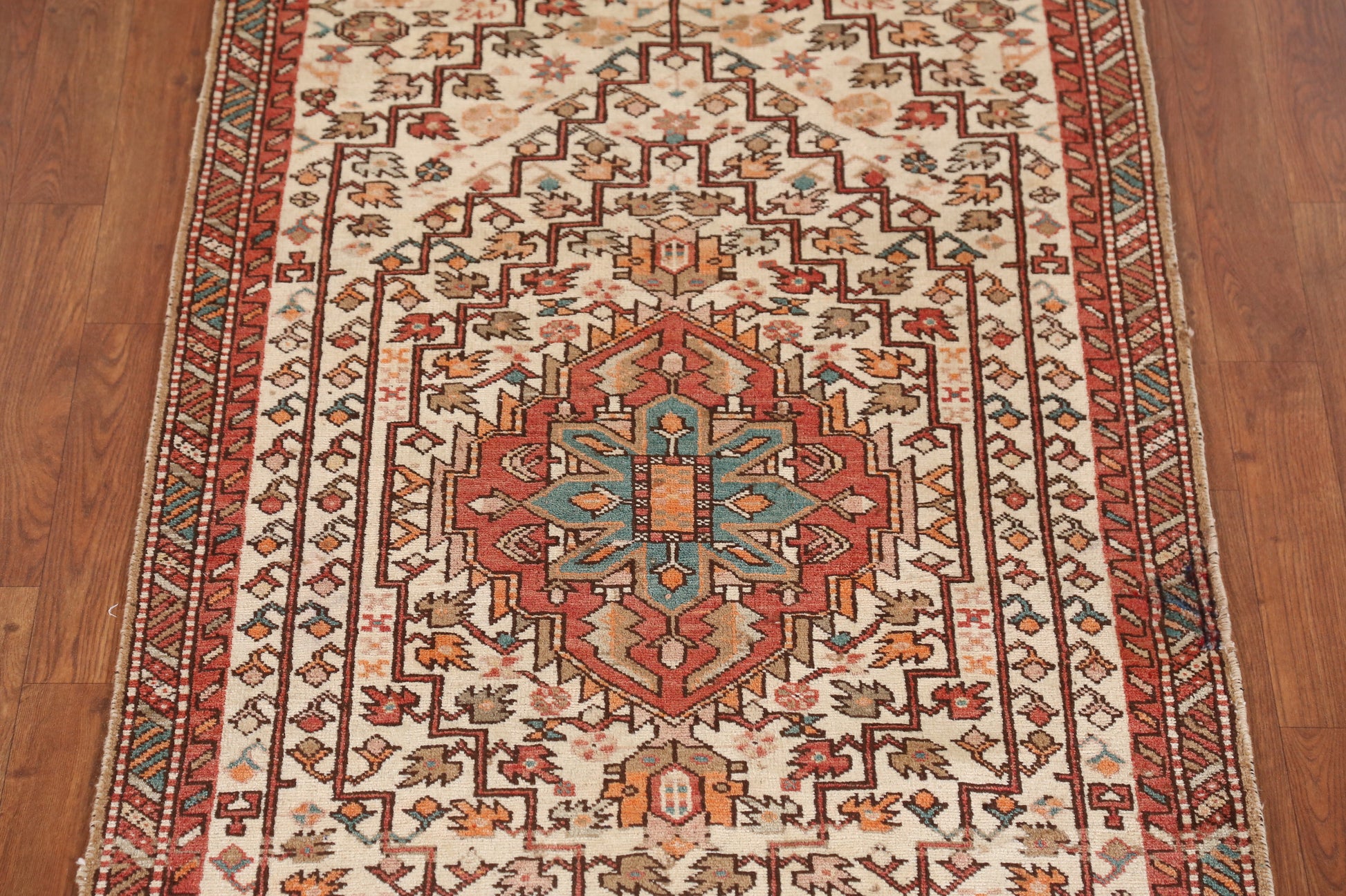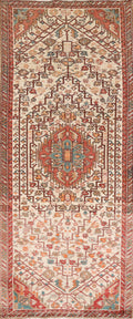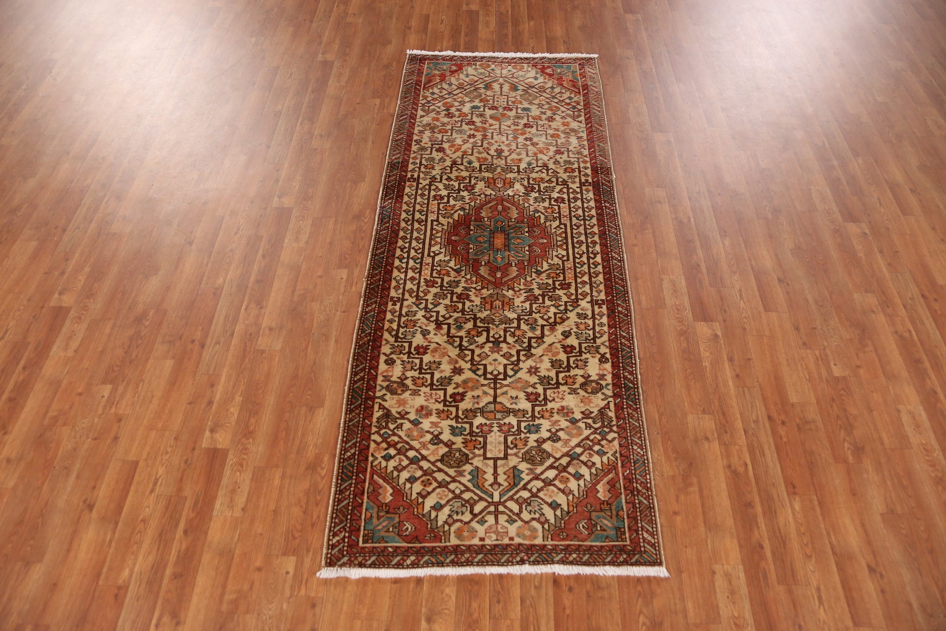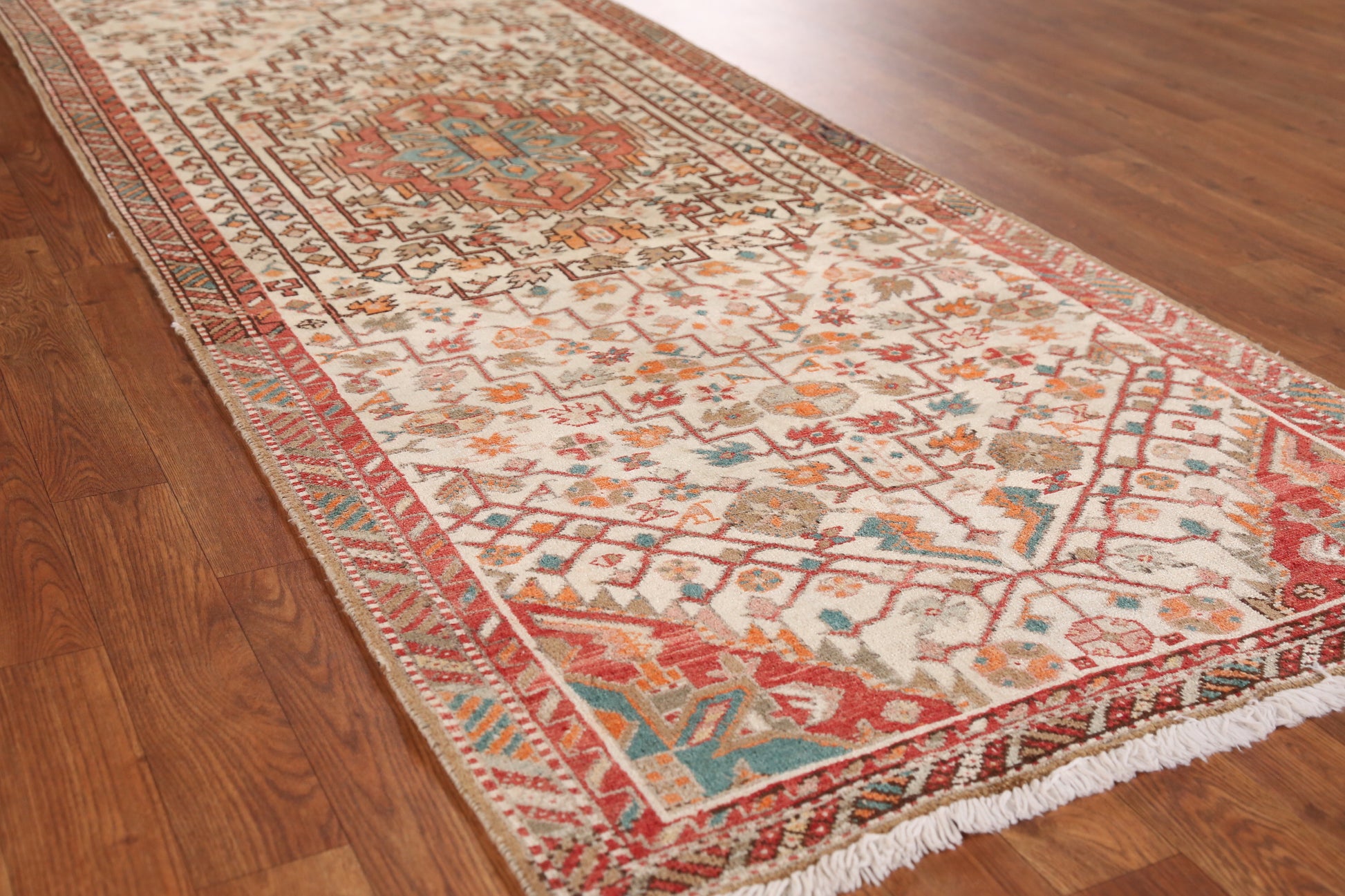 Ivory Wool Geometric Hamedan Persian Runner Rug 3x8