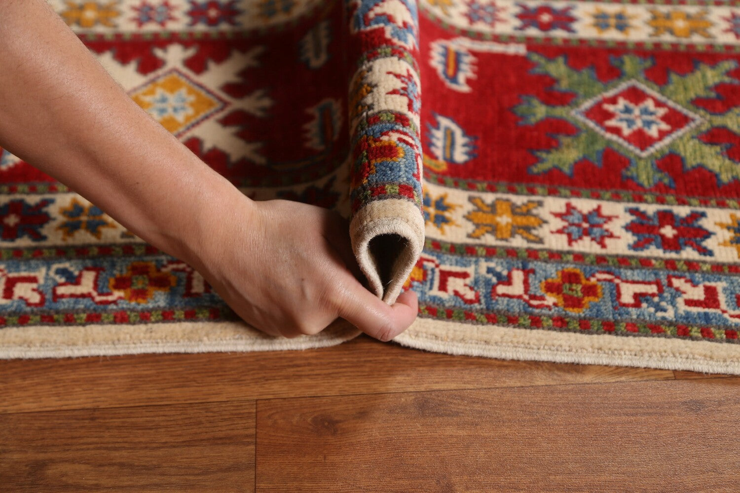 A Beautiful Genuine Pakistan Kazak rug is Hand Knotted by skillful weavers in Pakistan with 100% Wool Material. This rug is in condition. dimensions are 9' 10'' X 6' 7'' in foot and 300 X 201 in centimeter. the primary color is Beige & Ivories.