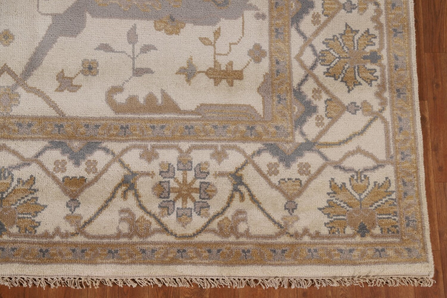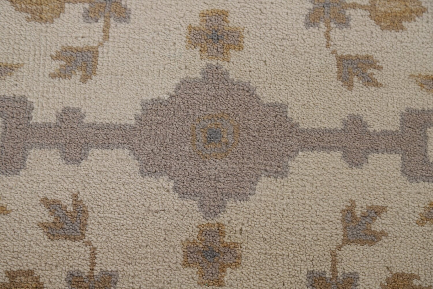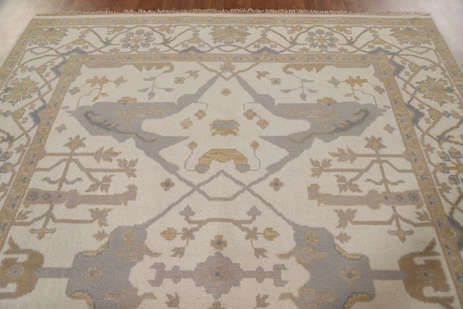 A Beautiful Genuine India Oushak rug is Hand Knotted by skillful weavers in India with 100% Wool Material. This rug is in New, First Quality condition. dimensions are 10' 0'' X 7' 11'' in foot and 305 X 241 in centimeter. the primary color is Beige & Ivories.