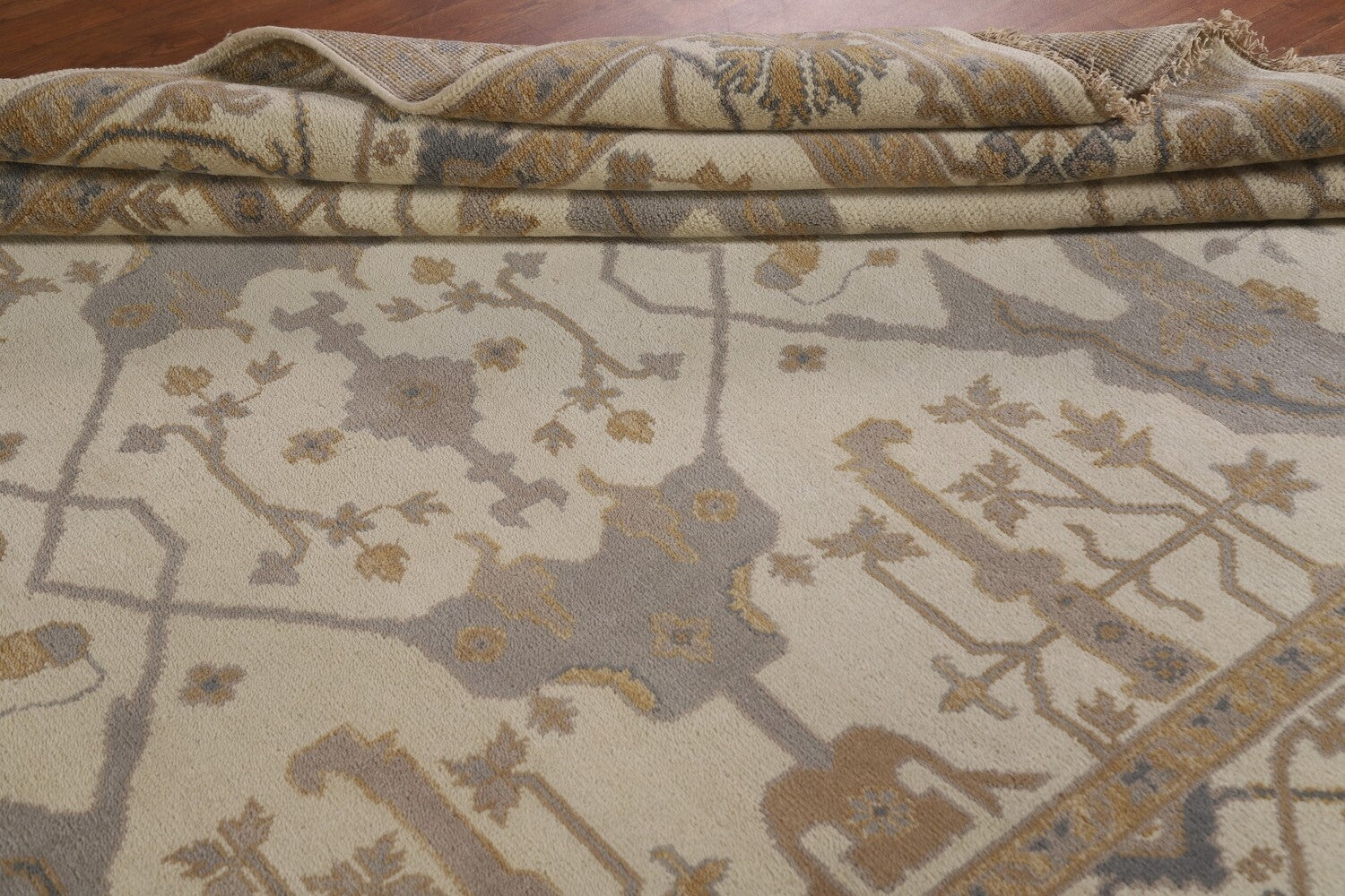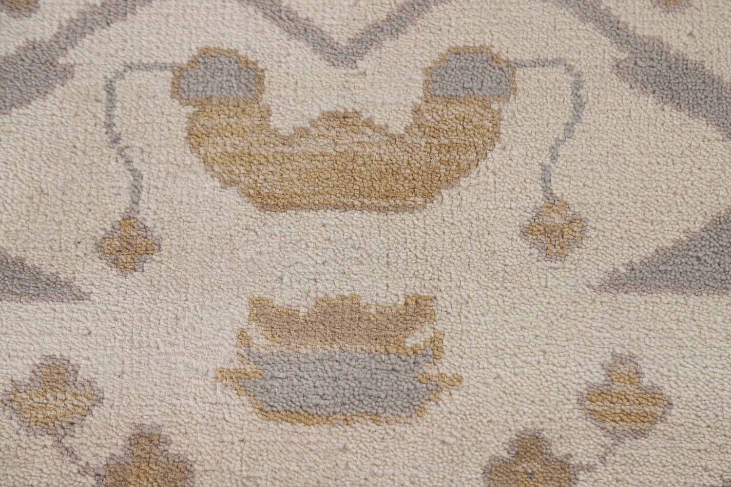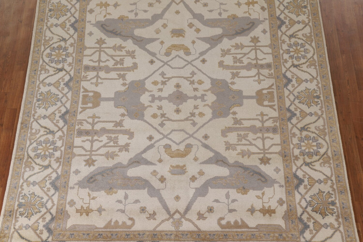 A Beautiful Genuine India Oushak rug is Hand Knotted by skillful weavers in India with 100% Wool Material. This rug is in New, First Quality condition. dimensions are 10' 0'' X 7' 11'' in foot and 305 X 241 in centimeter. the primary color is Beige & Ivories.