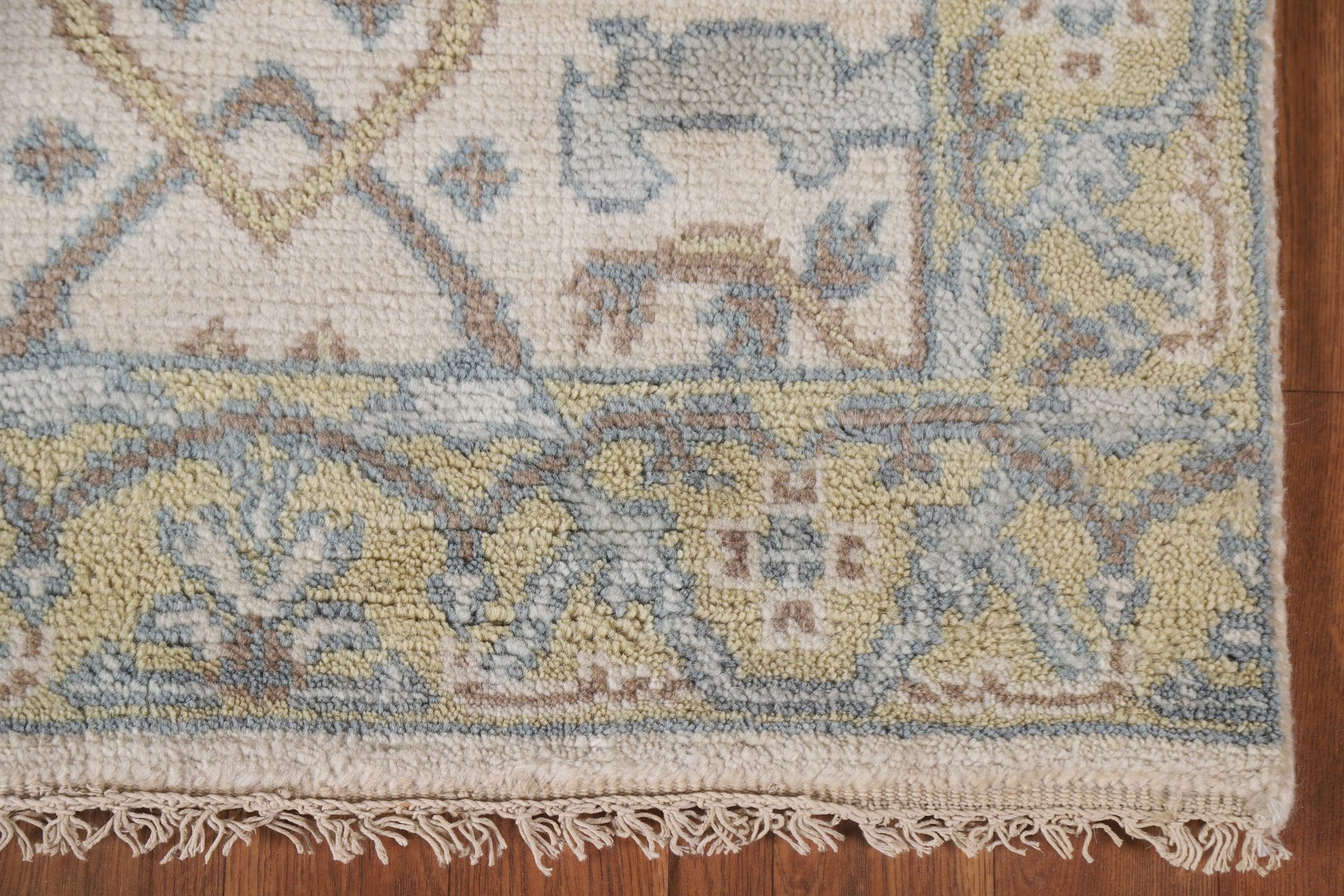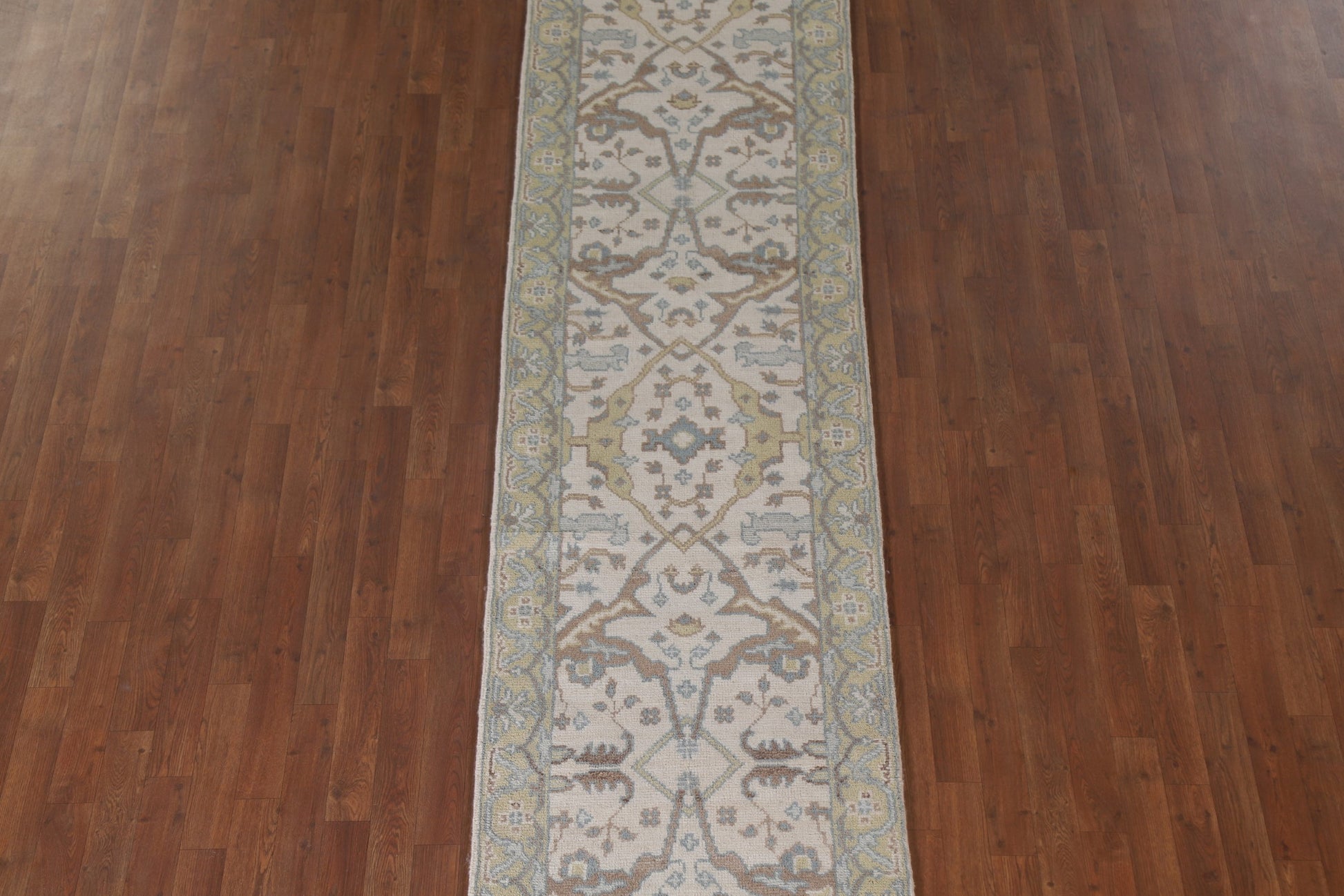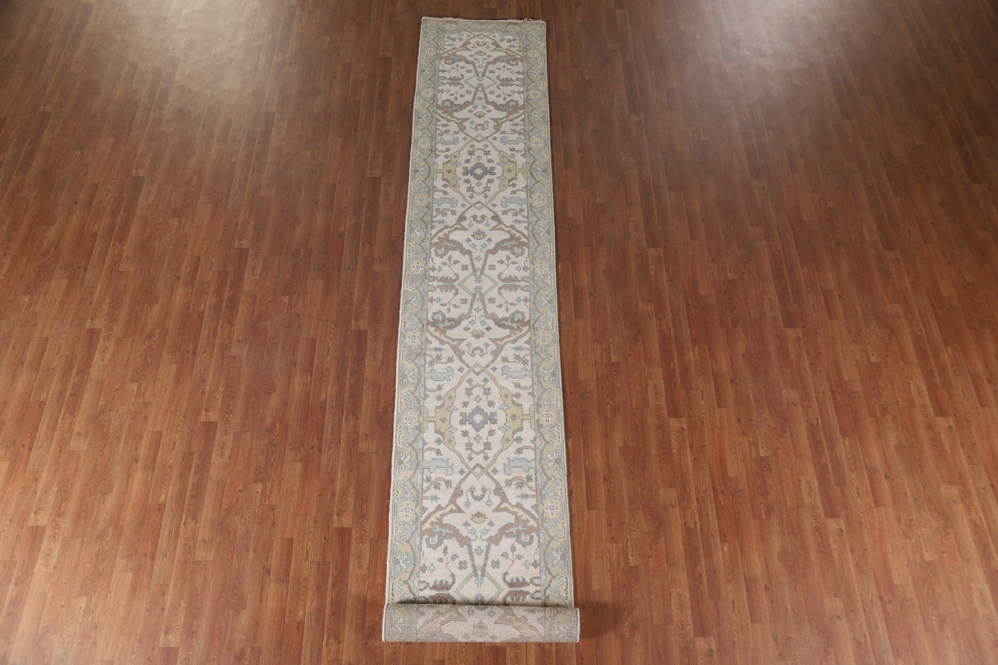 A Beautiful Genuine India Oushak rug is Hand Knotted by skillful weavers in India with 100% Wool Material. This rug is in New, First Quality condition. dimensions are 16' 2'' X 2' 7'' in foot and 493 X 79 in centimeter. the primary color is Beige & Ivories.