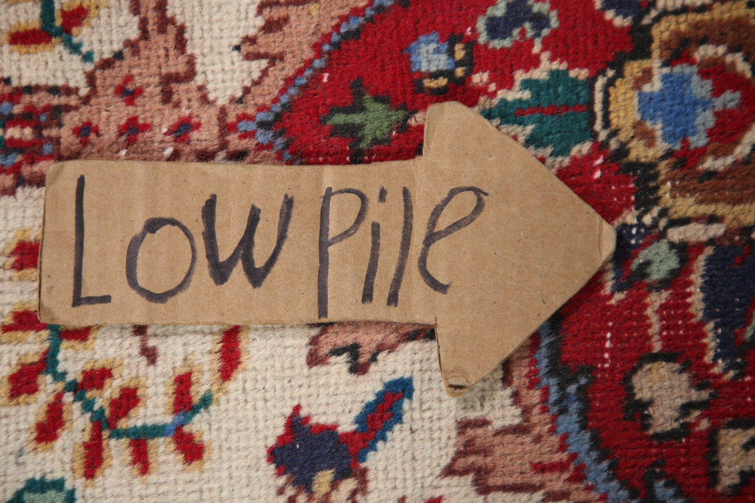 A Beautiful Genuine Persia ( Persia ) Tabriz rug is Hand Knotted by skillful weavers in Persia ( Persia ) with 100% Wool Material. This rug is in very good (small low pile) condition. dimensions are 9' 6'' X 6' 9'' in foot and 290 X 206 in centimeter. the primary color is Beige & Ivories.