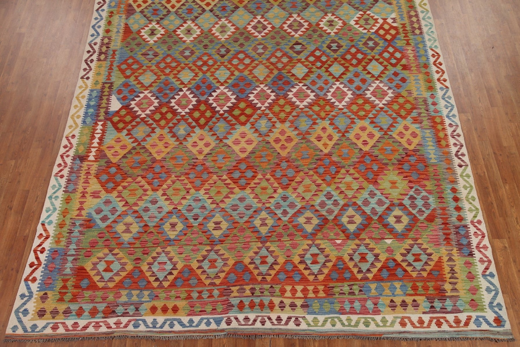 A Beautiful Genuine Pakistan Kilim rug is Hand Woven by skillful weavers in Pakistan with 100% Wool Material. This rug is in New, First Quality condition. dimensions are 13' 2'' X 9' 8'' in foot and 401 X 295 in centimeter. the primary color is Multi-Colored.