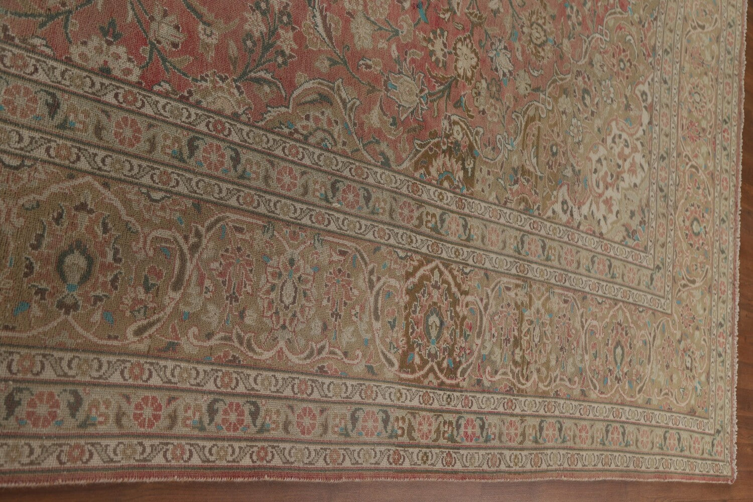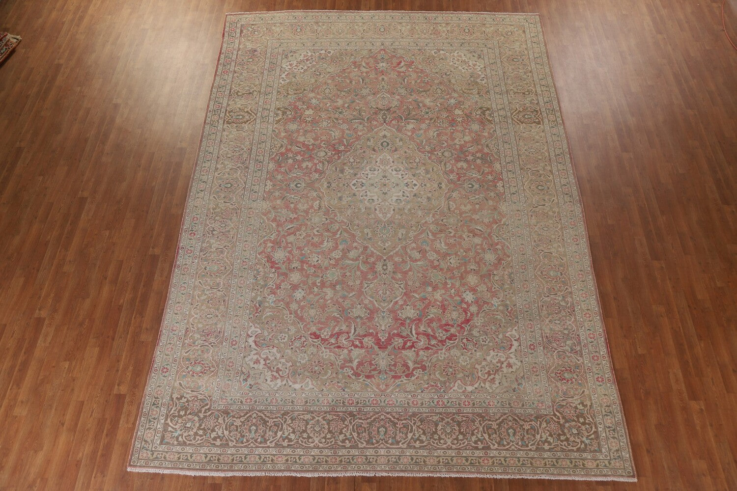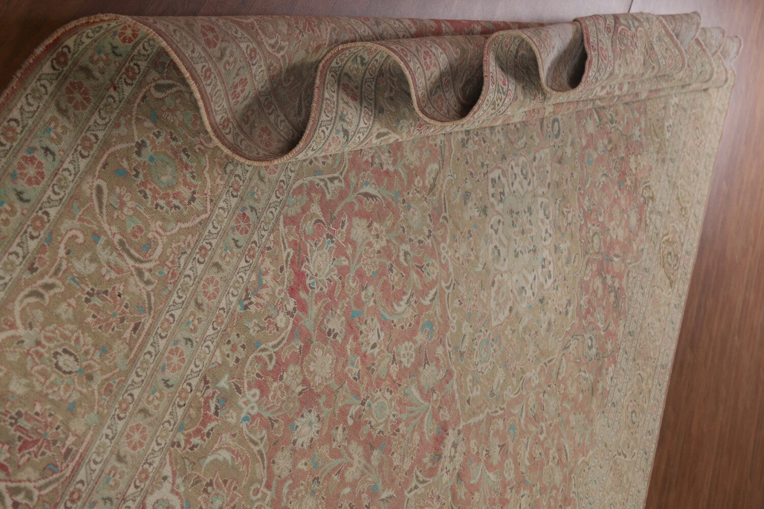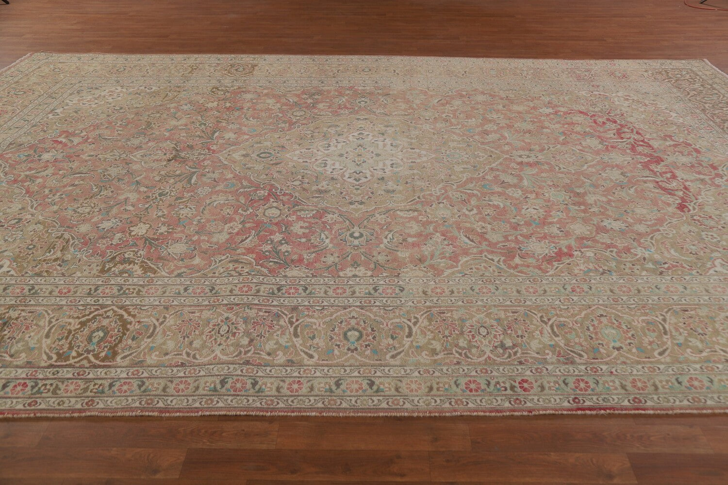 A Beautiful Genuine Persia ( Persia ) Mashad rug is Hand Knotted by skillful weavers in Persia ( Persia ) with 100% Wool Material. This rug is in Very Good (Low Pile-Abrash) condition. dimensions are 13' 9'' X 9' 7'' in foot and 419 X 292 in centimeter. the primary color is Pink.