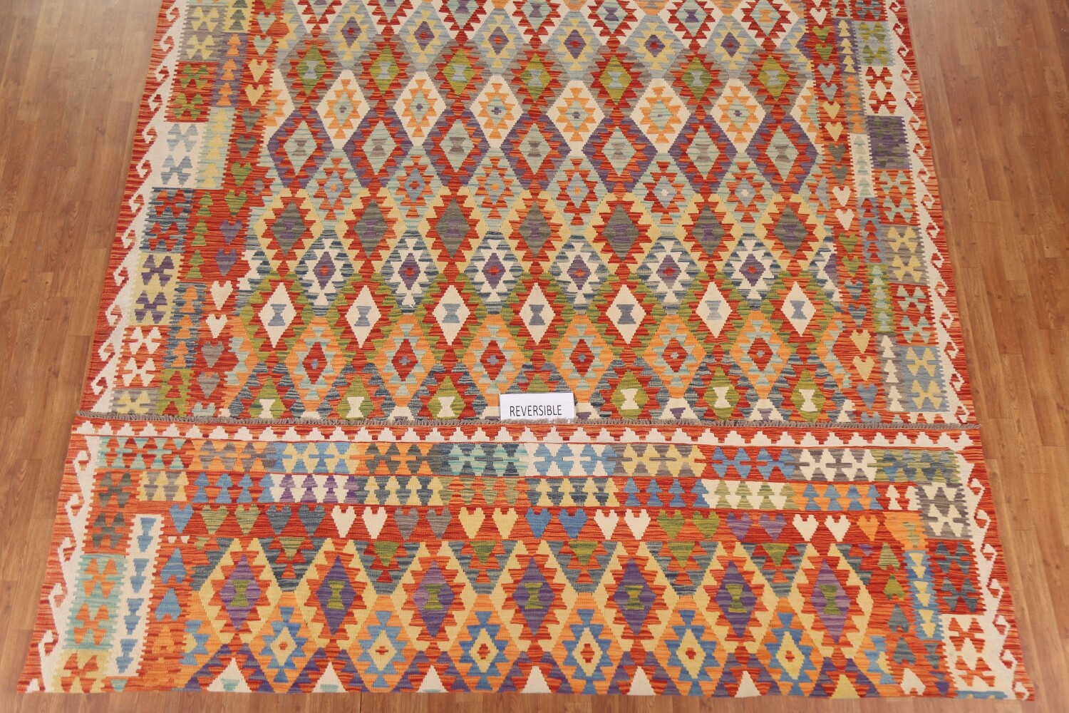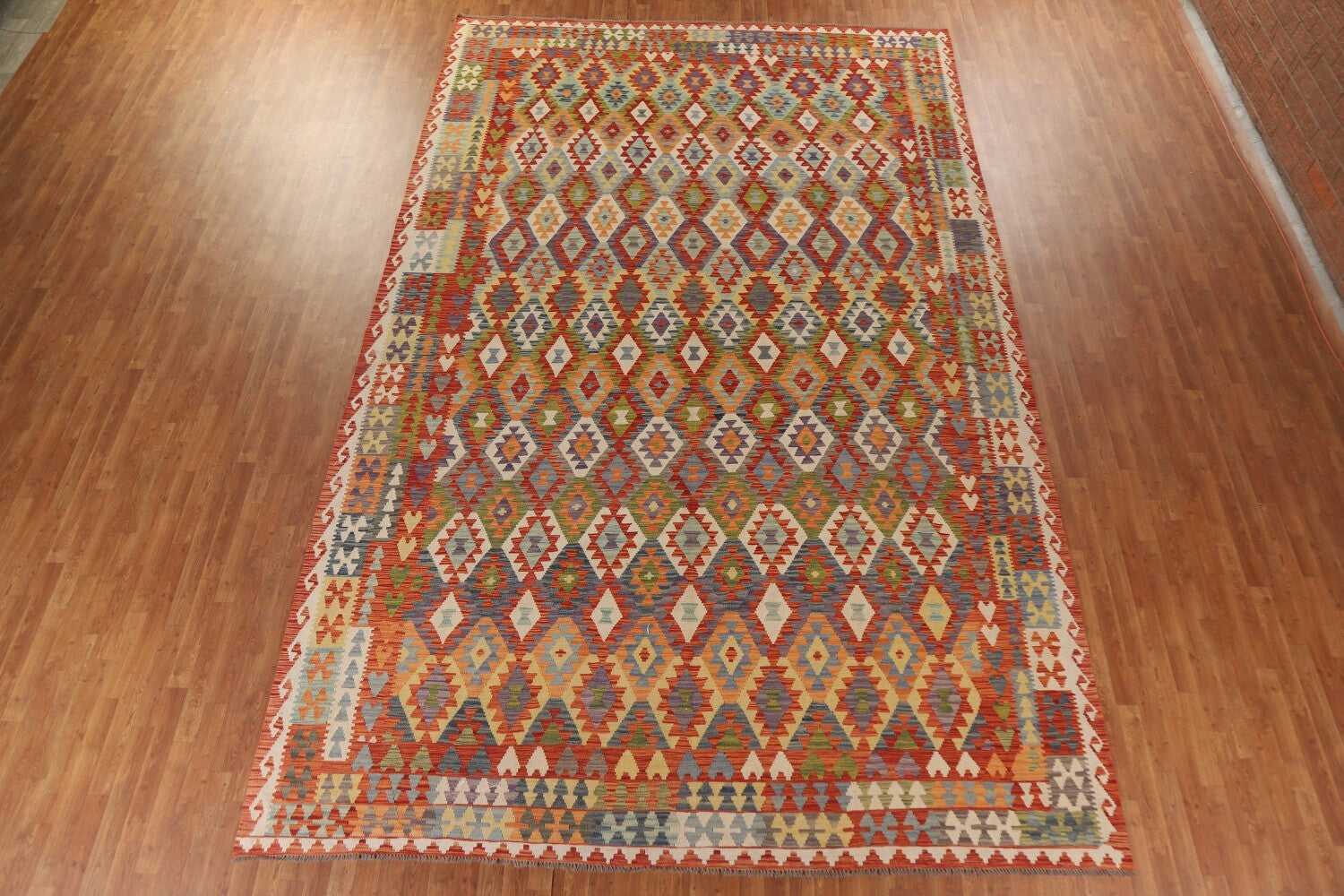 A Beautiful Genuine Pakistan Kilim rug is Hand Woven by skillful weavers in Pakistan with 100% Wool Material. This rug is in New, First Quality condition. dimensions are 16' 2'' X 10' 3'' in foot and 493 X 312 in centimeter. the primary color is Multi-Colored.