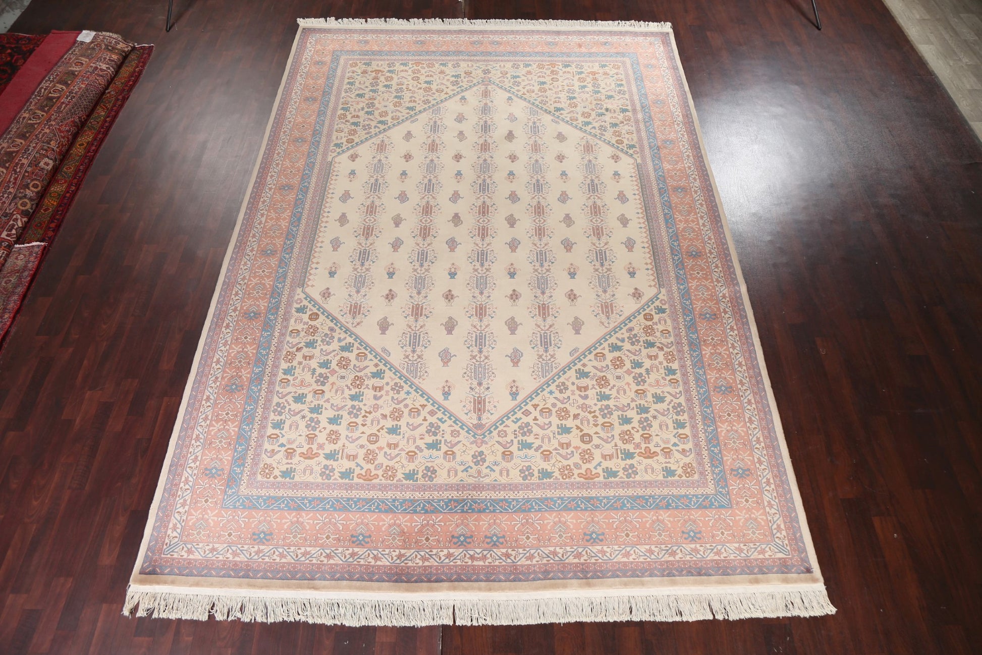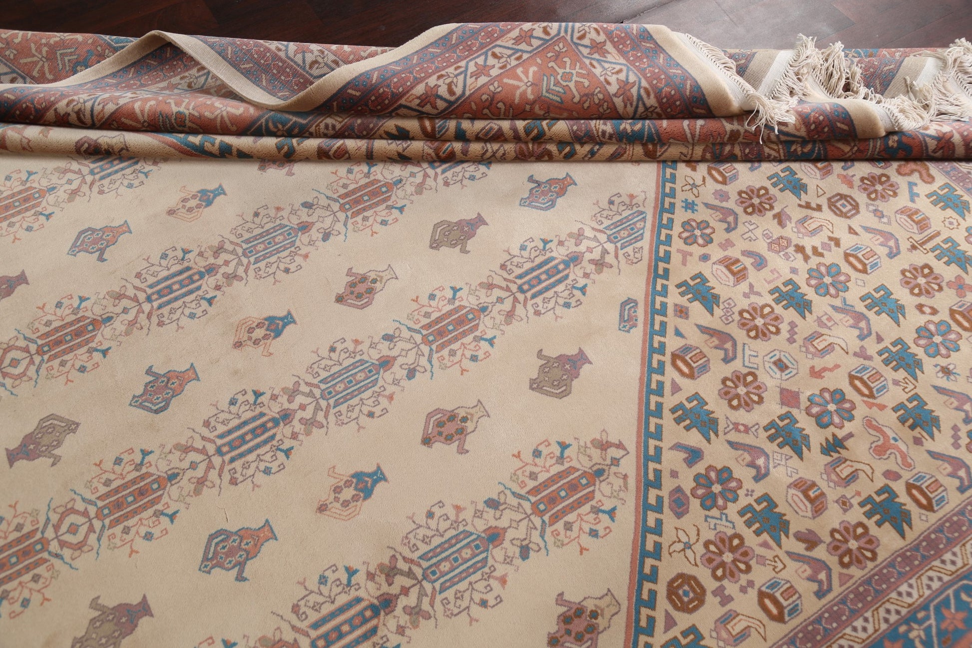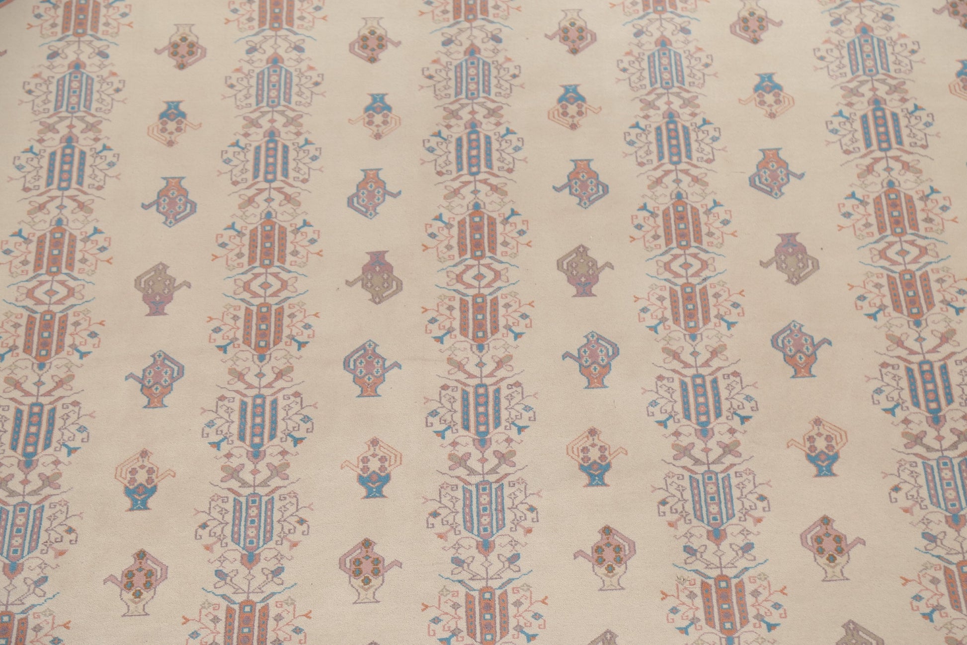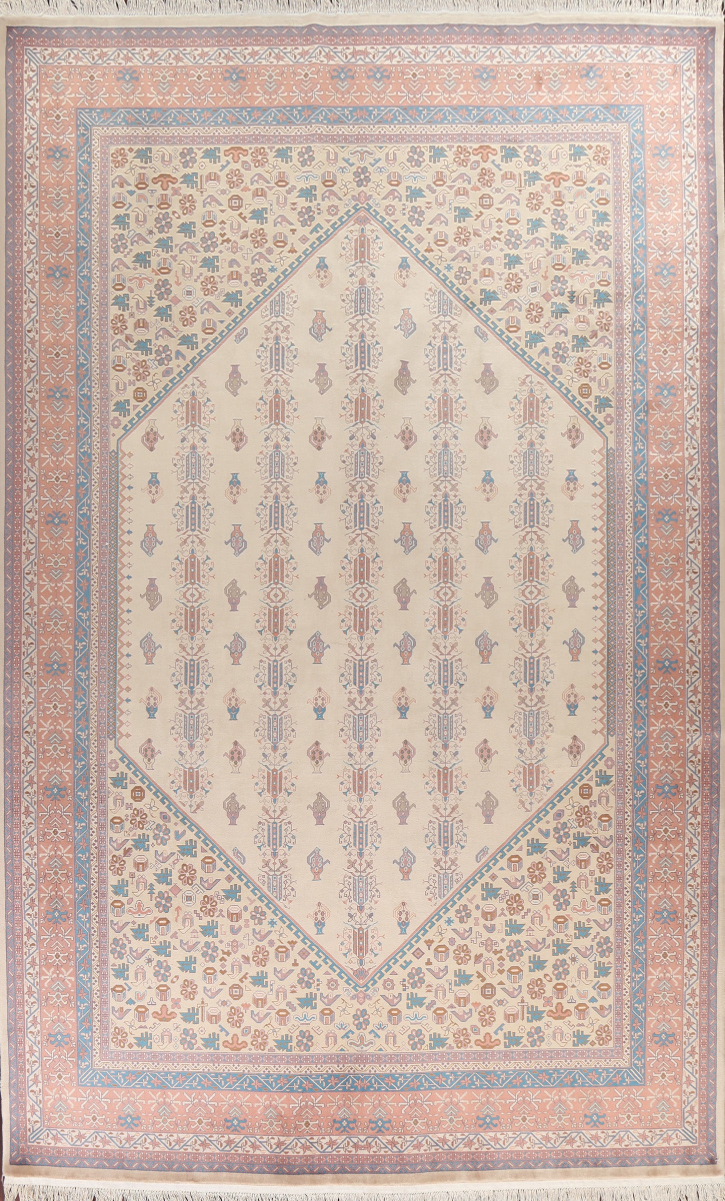 A Beautiful Genuine China Art Deco rug is Hand Knotted by skillful weavers in China with 100% Wool Material. This rug is in New, First Quality condition. dimensions are 14' 3'' X 9' 11'' in foot and 434 X 302 in centimeter. the primary color is Beige & Ivories.