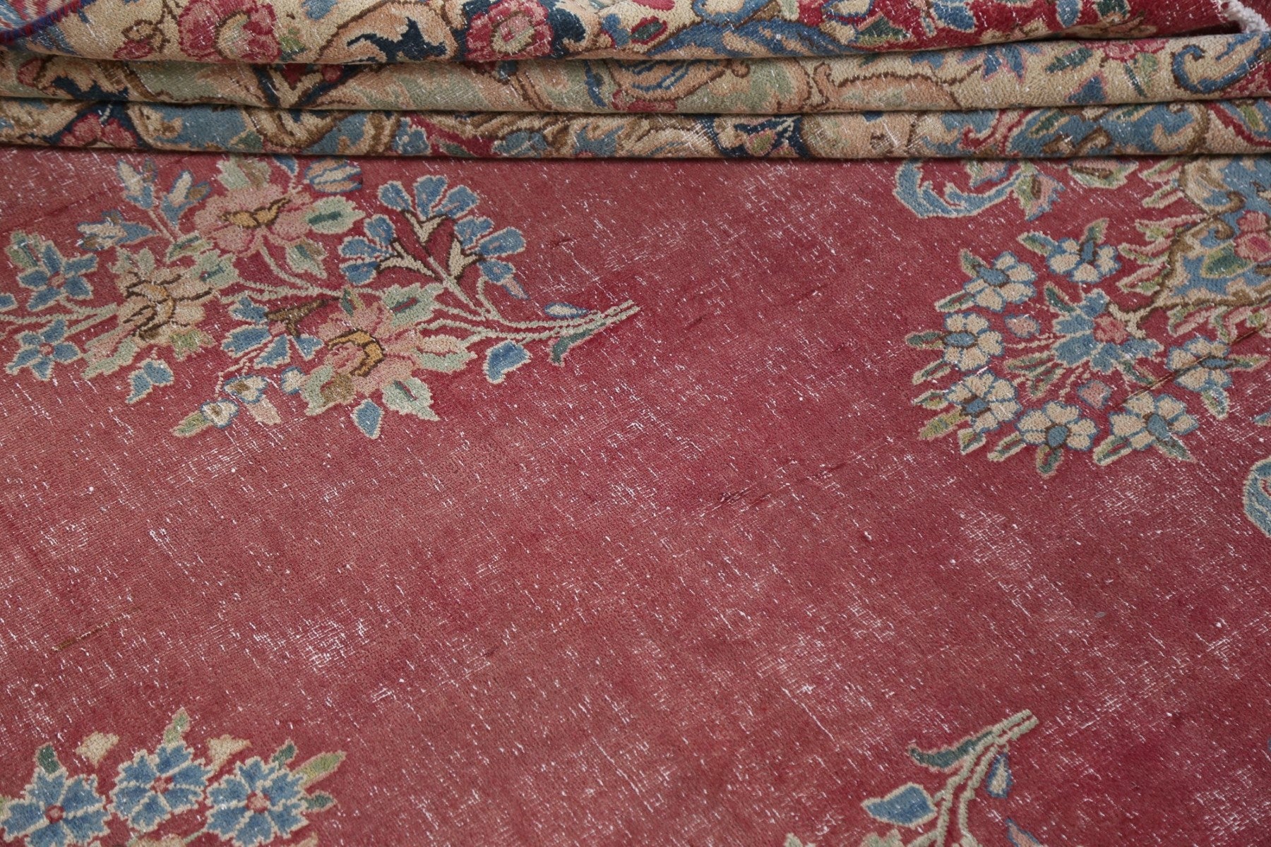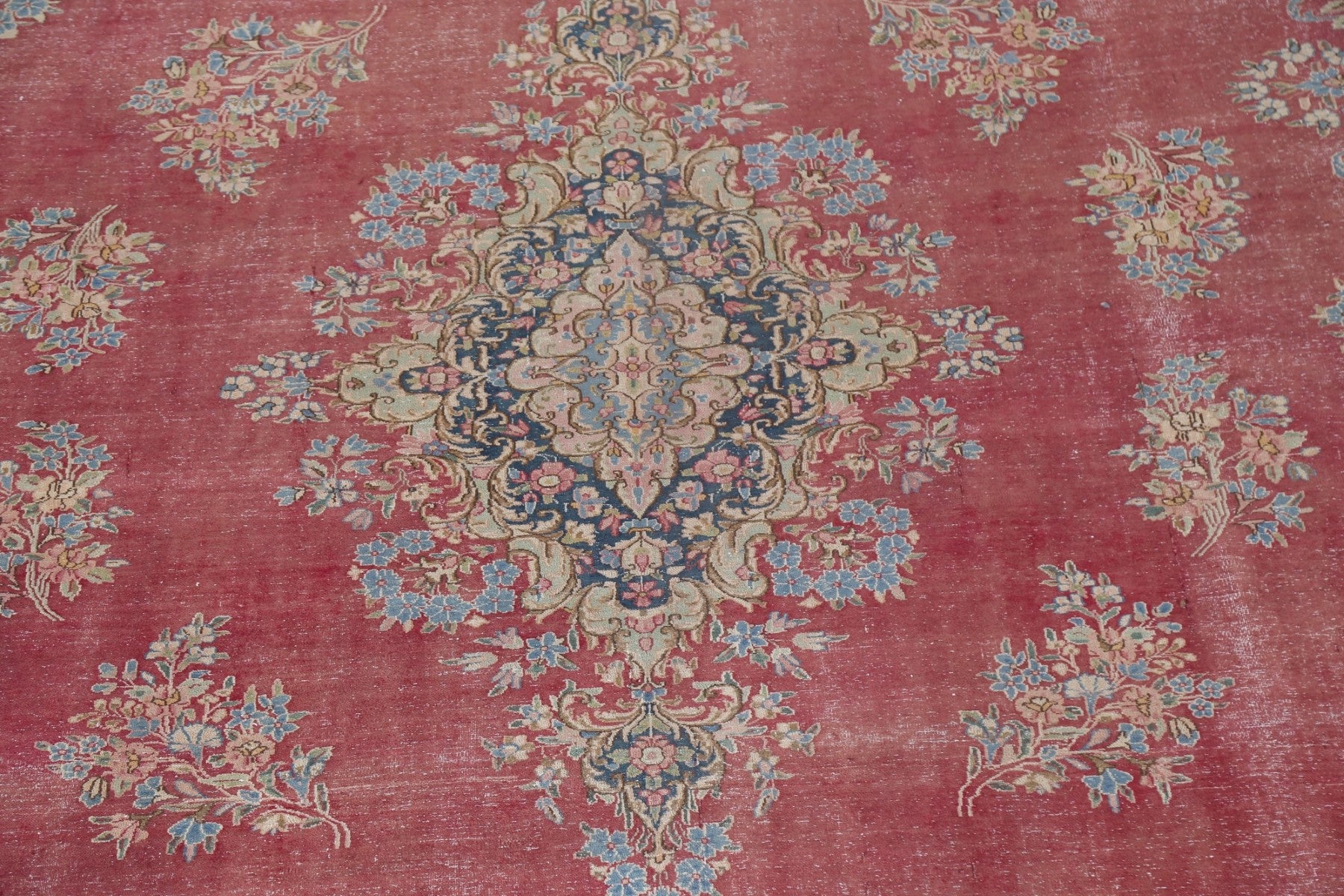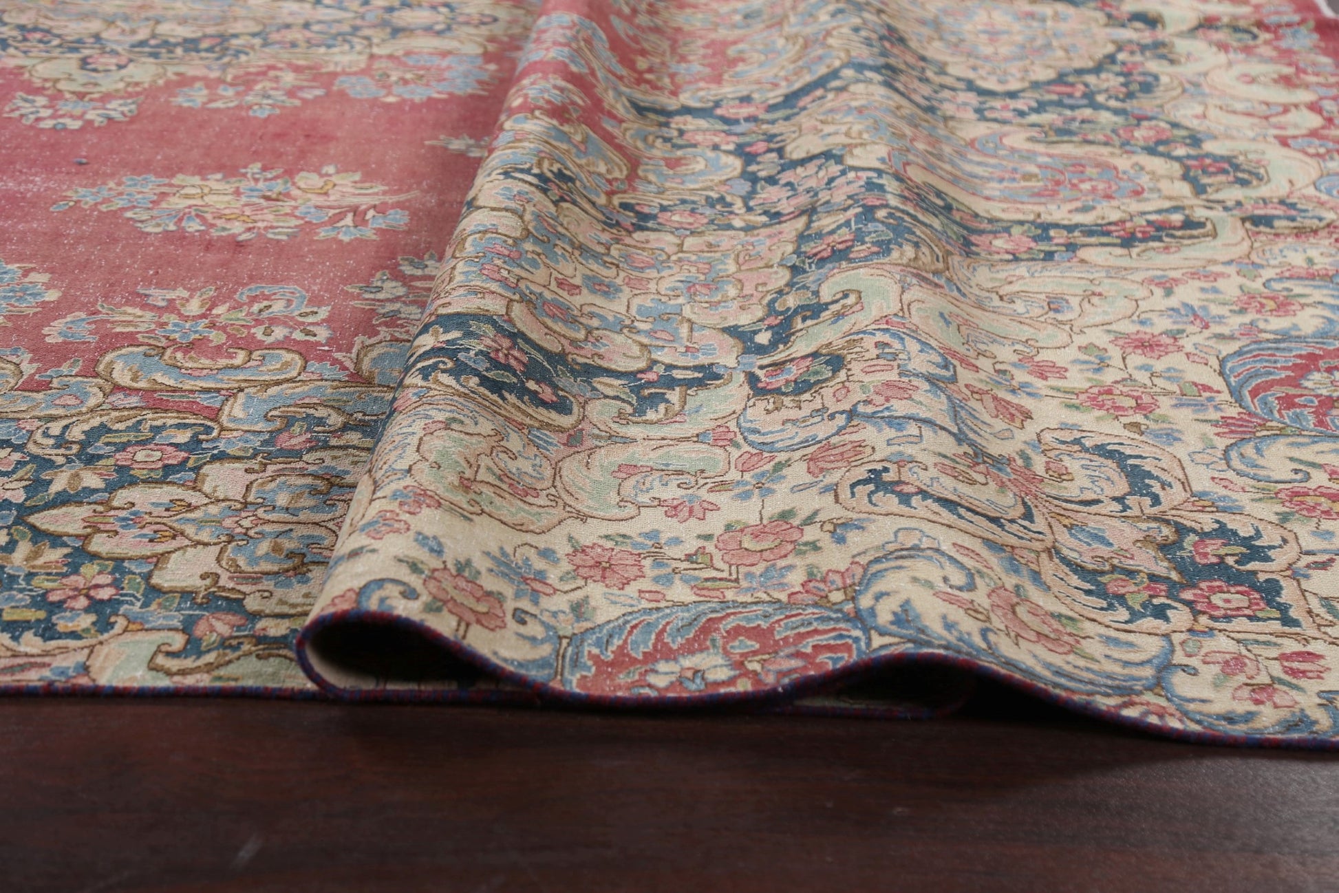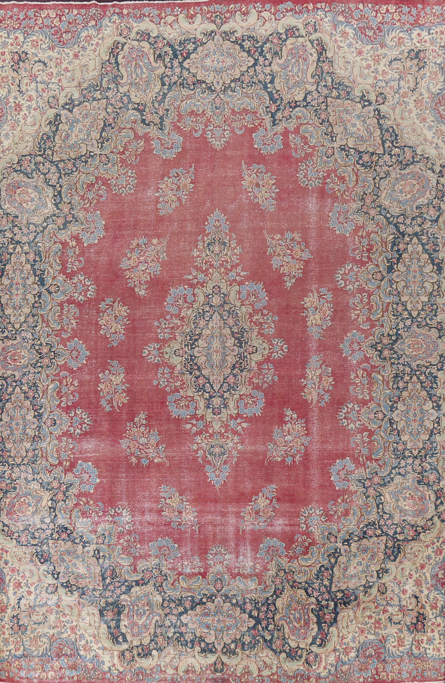 A Beautiful Genuine Persia ( Persia ) Kerman rug is Hand Knotted by skillful weavers in Persia ( Persia ) with 100% Wool Material. This rug is in Very Good (Evenly Low Pile) condition. dimensions are 15' 11'' X 11' 5'' in foot and 485 X 348 in centimeter. the primary color is Pink.