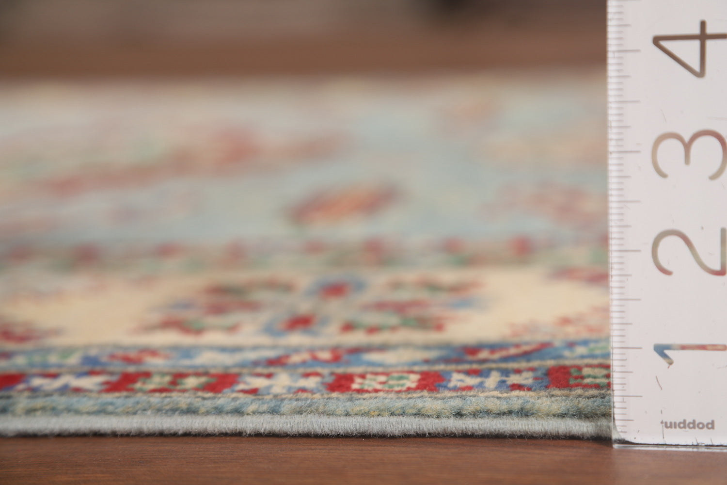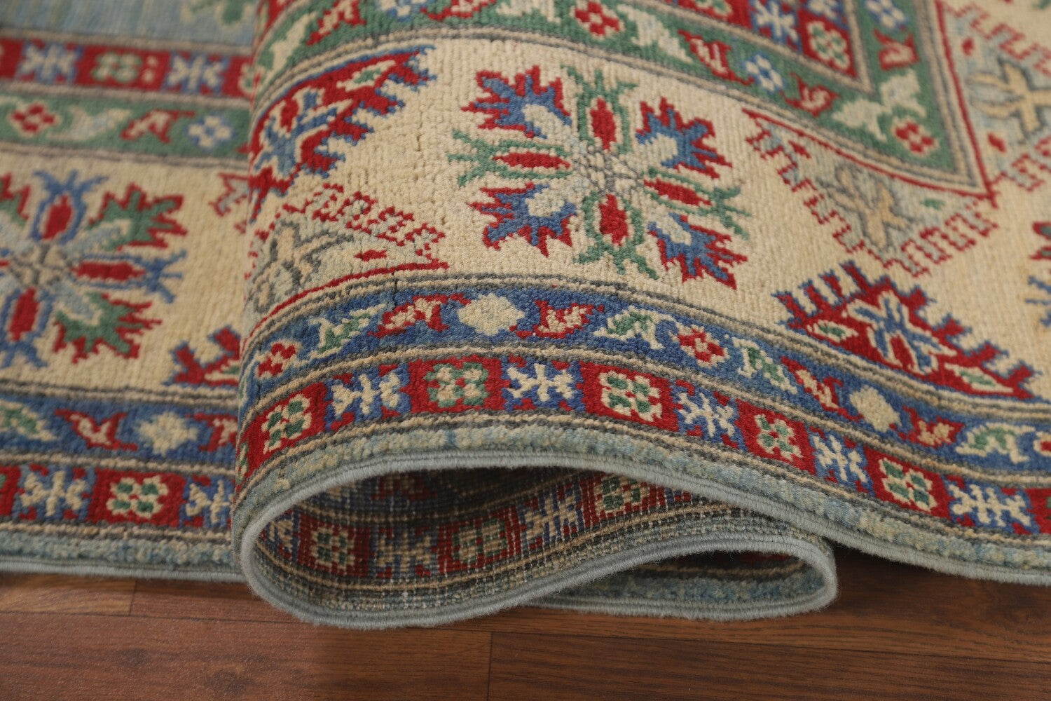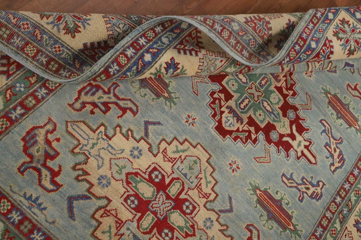 A Beautiful Genuine Pakistan Kazak rug is Hand Knotted by skillful weavers in Pakistan with 100% Wool Material. This rug is in New, First Quality condition. dimensions are 6' 10'' X 4' 11'' in foot and 208 X 150 in centimeter. the primary color is Navy Blue & Blues.