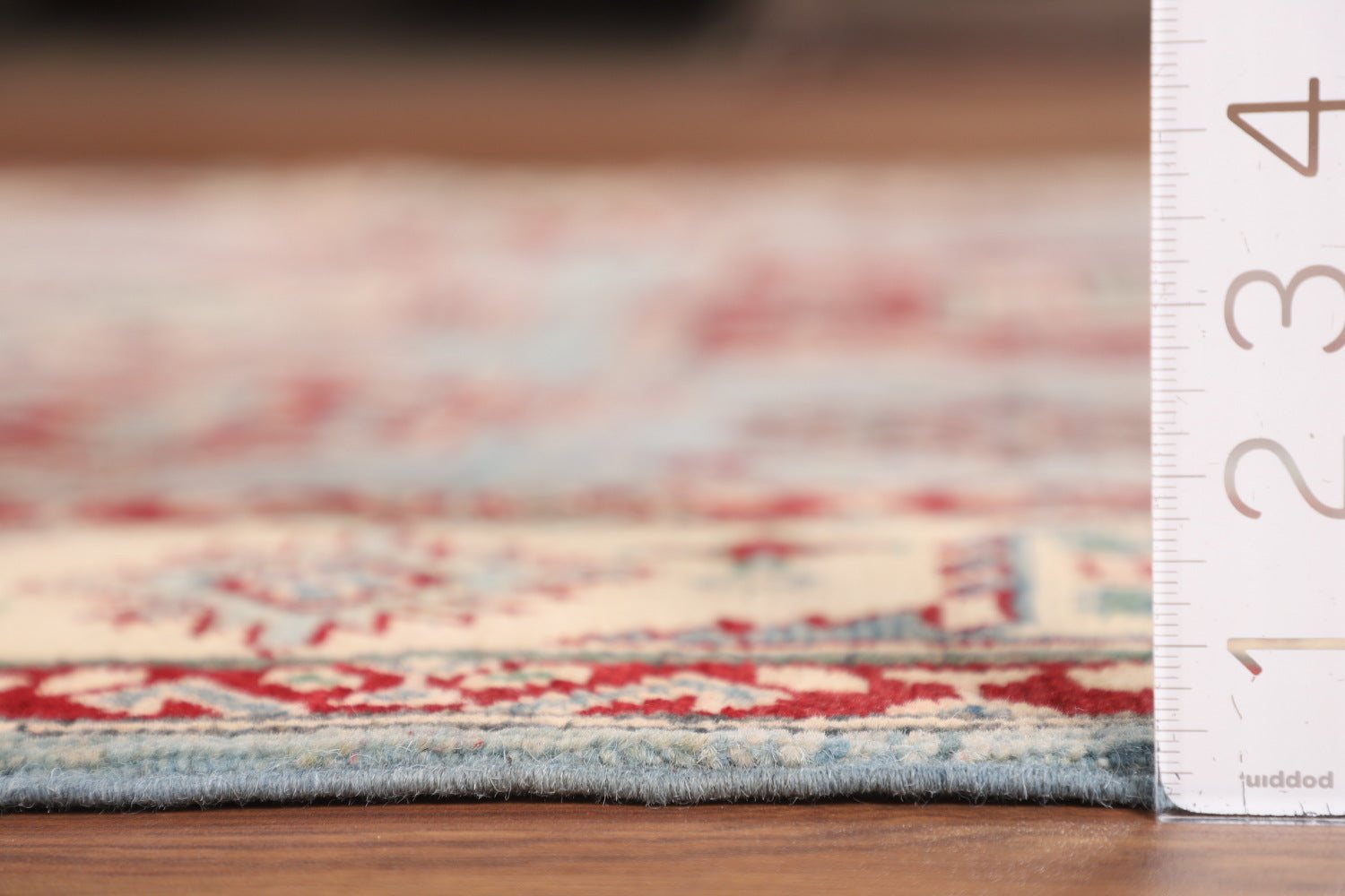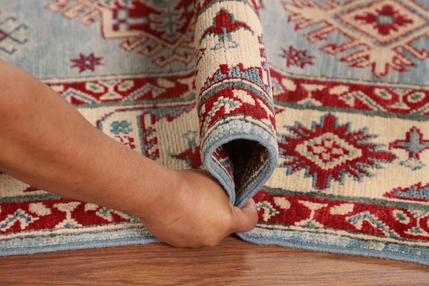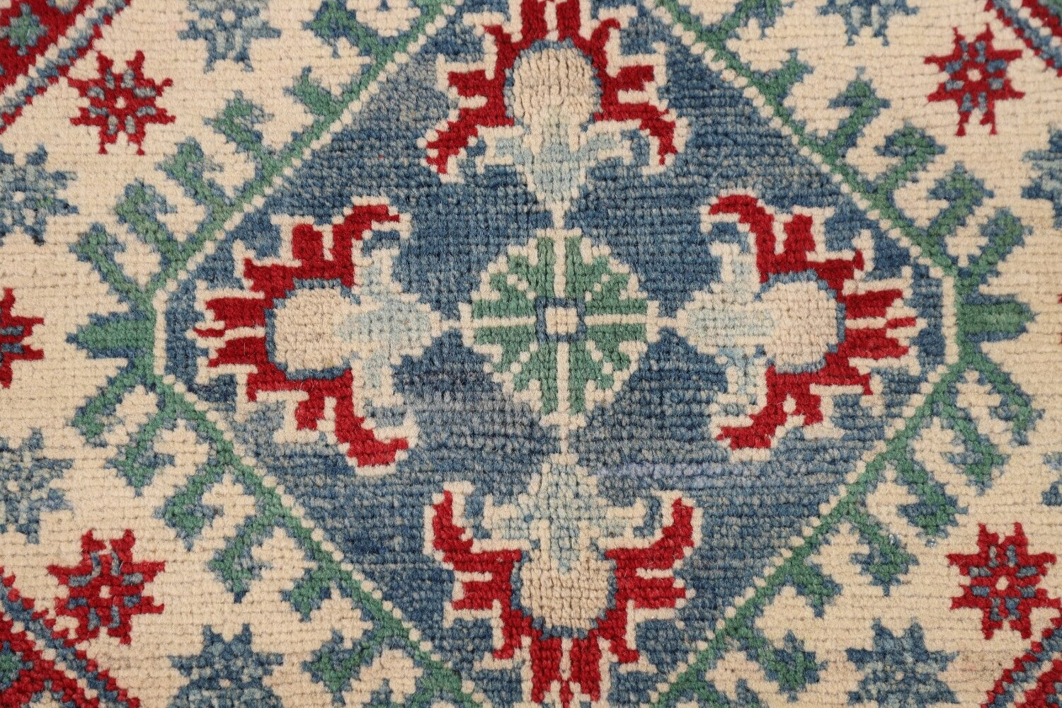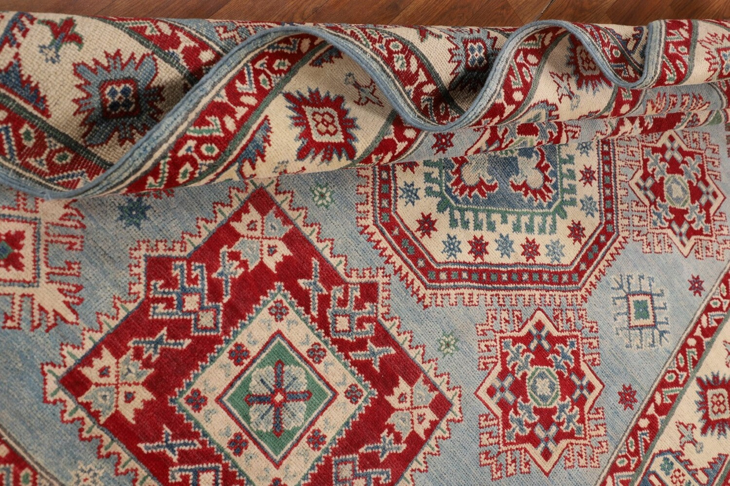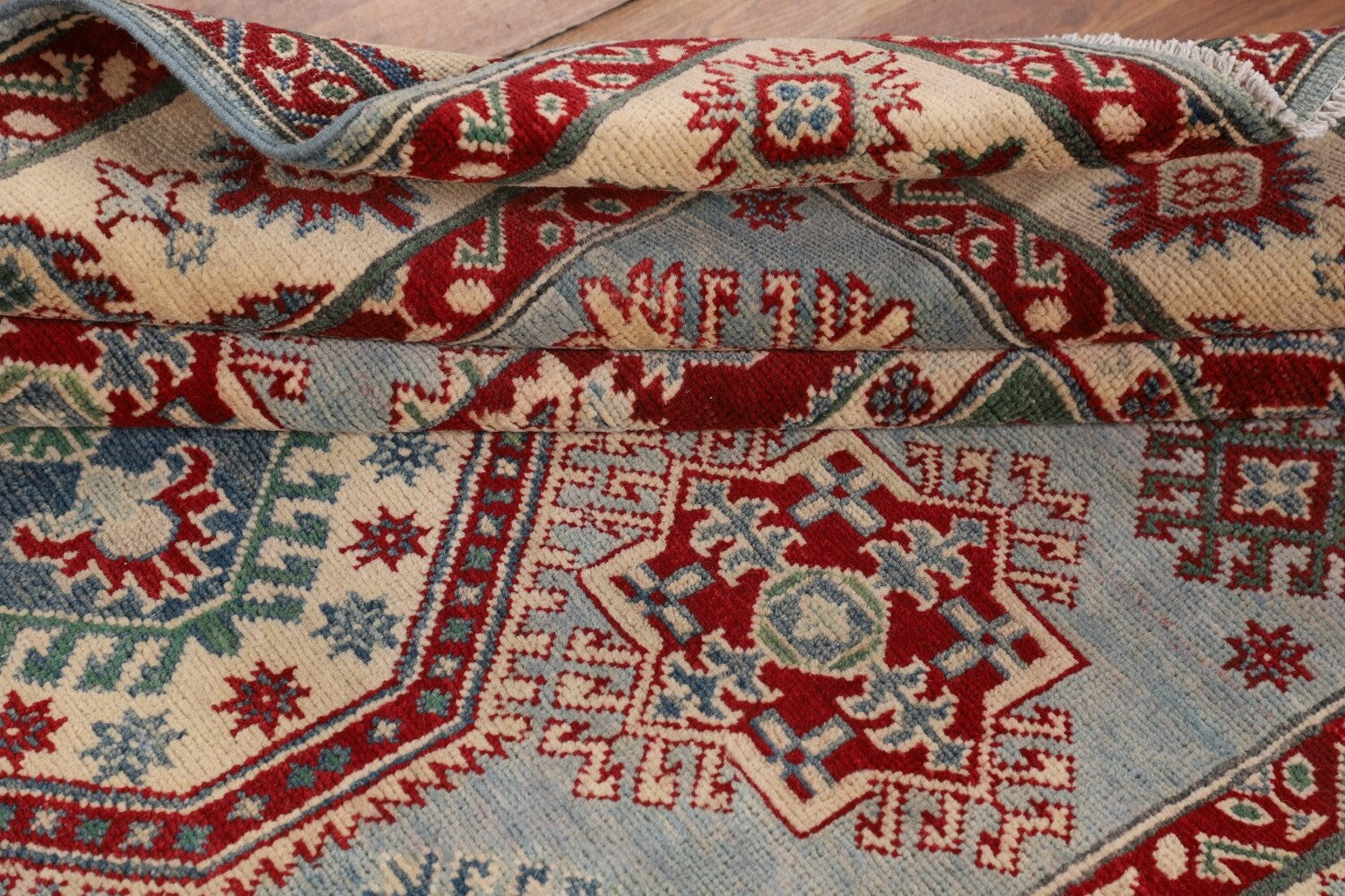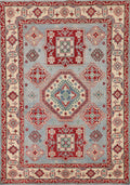 A Beautiful Genuine Pakistan Kazak rug is Hand Knotted by skillful weavers in Pakistan with 100% Wool Material. This rug is in New, First Quality condition. dimensions are 7' 3'' X 5' 0'' in foot and 221 X 152 in centimeter. the primary color is Navy Blue & Blues.