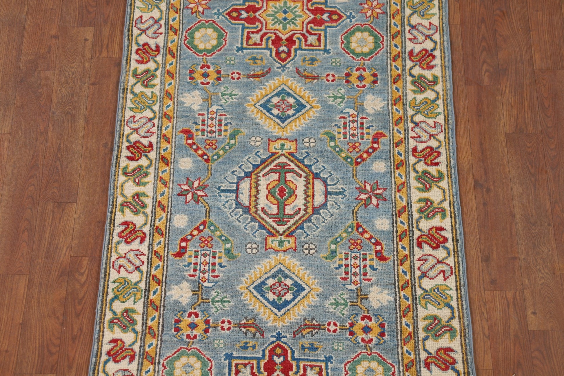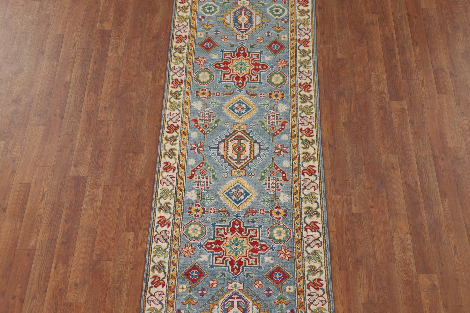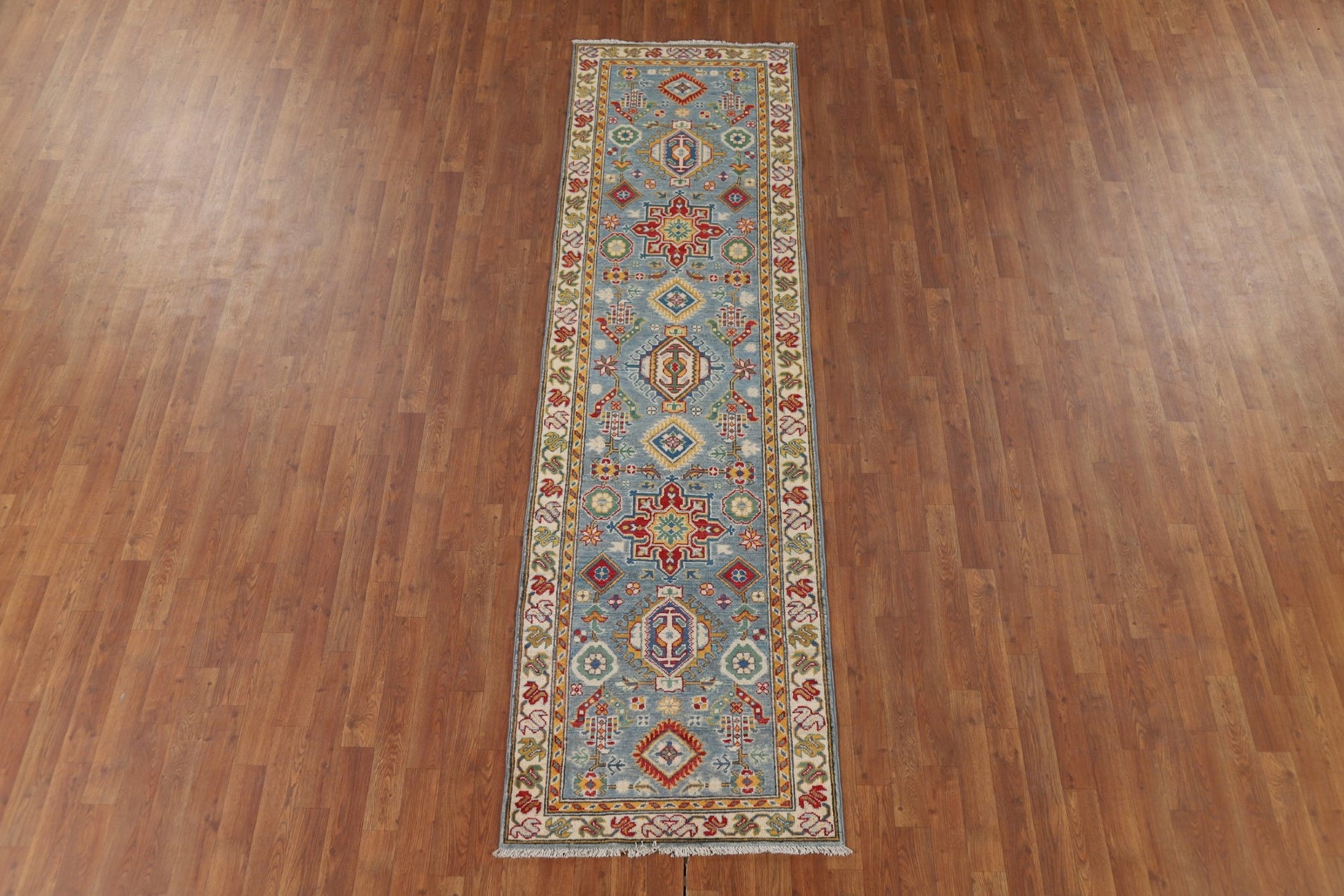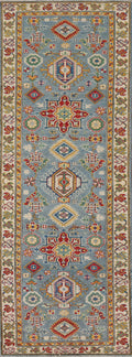 Light Blue Geometric Kazak Oriental Runner Rug 3x10
