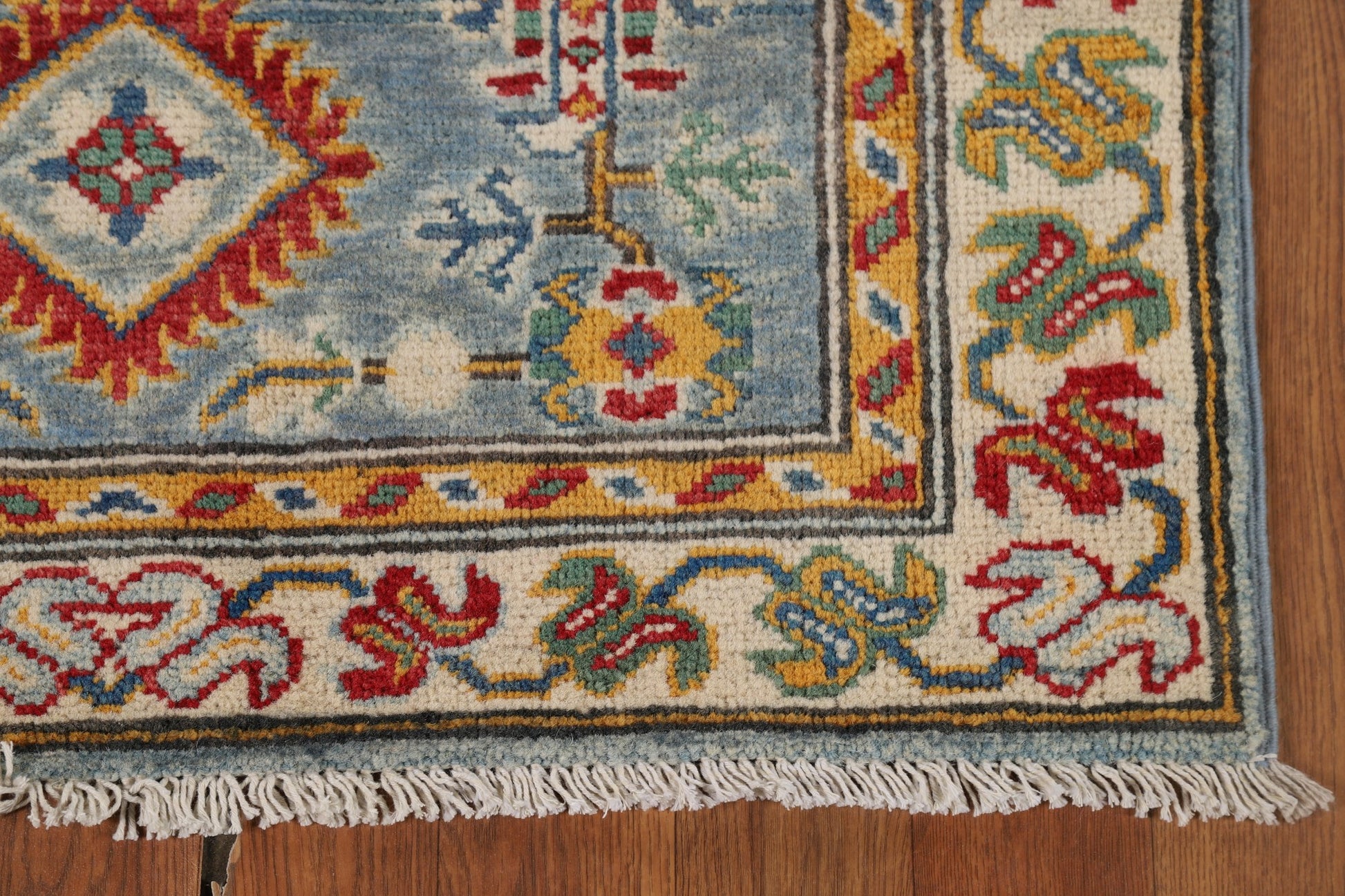 A Beautiful Genuine Pakistan Kazak rug is Hand Knotted by skillful weavers in Pakistan with 100% Wool Material. This rug is in New, First Quality condition. dimensions are 9' 6'' X 2' 8'' in foot and 290 X 81 in centimeter. the primary color is Navy Blue & Blues.