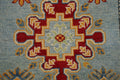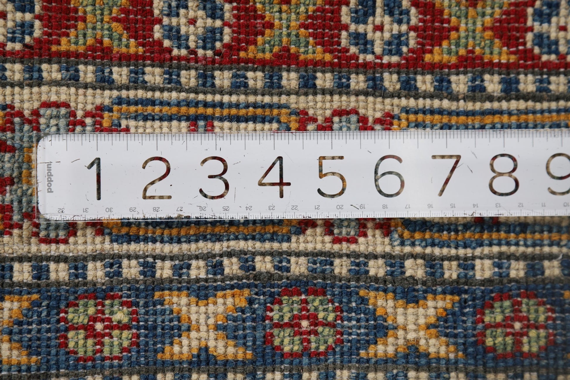 A Beautiful Genuine Pakistan Kazak rug is Hand Knotted by skillful weavers in Pakistan with 100% Wool Material. This rug is in New, First Quality condition. dimensions are 9' 9'' X 2' 9'' in foot and 297 X 84 in centimeter. the primary color is Navy Blue & Blues.